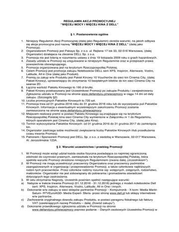 REGULAMIN AKCJI PROMOCYJNEJ “WIĘCEJ MOCY I WIĘCEJ KINA Z DELL” § 1. Postanowienia ogólne 1. Niniejszy Regulamin Akcji Promocyjnej (dalej jako Regulamin) określa warunki, na jakich odbywa się akcja promocyjna pod nazwą “WIĘCEJ MOCY I WIĘCEJ KINA Z DELL” (dalej jako Promocja). 2. Organizatorem Promocji jest Pakaya Sp. z o.o. ul. Rejtana 17 lok 33, 02-516 Warszawa, (dalej Organizator) działajaca na zlecenie DELL Sp. z o.o. 3. Promocja nie jest loterią w rozumieniu ustawy z dnia 19 listopada 2009 roku o grach hazardowych. 4. Zasady udziału w Promocji są uregulowane w niniejszym Regulaminie oraz w przepisach prawa powszechnie obowiązującego. 5. Promocja organizowana jest na terytorium Rzeczypospolitej Polskiej. 6. Celem Promocji jest promocja zakupu Notebooków DELL serii XPS, Inspiron, Alienware, Vostro, Latitude, All in One (dalej jako Produkt). 7. Premią za zakup w/w Produktu jest Pakiet Kinowy 10 Voucherów do sieci kin Cinema City, (dalej Pakiet Kinowy), uprawaniający do otrzymania 10 bezpłatnych biletów do kin sieci Cinema City na seanse 2D. 8. Łączna wartość Pakietu Kinowego to 190 zł brutto. 9. Pakiet Kinowy przekazywany jest Uczestnikowi Promocji po zakupie Produktu i zarejestrowaniu Zgłoszenia udziału w Promocji na stronie www.dellandyou.pl/wiecejmocy w ciągu 14 dni od daty zakupu. (Szczegóły §2) 10. Liczba promocyjnych Pakietów Kinowych to 720 szt. 11. Promocja trwa od 01 grudnia 2016 roku do 31 grudnia 2016 roku lub do wyczerpania puli Pakietów Kinowych. Informacja o ewentualnym wcześniejszym zakończeniu Promocji zostanie zamieszczona na stronie www.dellandyou.pl/wiecejmocy 12. Miejscem realizacji premii w postaci Pakietu Kinowego są: znajdujące się na terytorium Rzeczpospolitej Polskiej kina sieci Cinema City wymienione w Załączniku nr 1 do Regulaminu, których operatorem jest Cinema City, (dalej jako Kina). 13. Termin wykorzystania Pakietów Kinowych: od 01 grudnia 2016 do 31 grudnia 2017 do zamknięcia kin. 14. Organizator zastrzega sobie możliwość zwiększenia liczby Pakietów Kinowych i/lub przedłużenia czasu trwania Promocji. 15. Patronem i Sponsorem Promocji jest DELL Sp. z o.o. z siedzibą w Warszawie, 02-017 Warszawa, Al. Jerozolimskie 123A. § 2. Warunki uczestnictwa i przebieg Promocji 1. W Promocji może wziąć udział każda osoba fizyczna posiadająca co najmniej ograniczoną zdolność do czynności prawnych, zamieszkała na terytorium Rzeczpospolitej Polskiej, która spełniła warunki Promocji określone niniejszym Regulaminem (zwana dalej „Uczestnikiem”). 2. W Promocji nie mogą uczestniczyć pracownicy Organizatora oraz pracownicy podmiotów zaangażowanych w organizację i przeprowadzenie Promocji, a także członkowie najbliższych rodzin tych pracowników. Przez członków rodziny rozumie się: wstępnych, zstępnych, rodzeństwo, małżonków. Organizator nie jest zobowiązany do pobierania i gromadzenia oświadczeń dotyczących tego zastrzeżenia. 3. W celu otrzymania Nagrody, Uczestnik powinien spełnić następujące warunki: a) Nabycie w trakcie trwania Promocji (01.12.2016 - 31.12.2016) jednego z modeli notebooków Dell serii: XPS, Inspiron, Alienware, Vostro, Latitude, All in One i innych. b) Dokonanie w/w zakupu w sieci sklepów partnerów Promocji: - Komputronik - X-kom - Media MarktSaturn- RTVEuroAGD - Media Expert - Sferis - przez stronę www.dell.pl lub sklepy internetowe w/w partnerów. c) Zachowanie oryginalnego dowodu zakupu Produktu, w postaci paragonu fiskalnego lub faktury VAT (zawierających nazwę Produktu – dalej „Dowód zakupu”), d) Dokonanie prawidłowego zgłoszenia udziału w Promocji na stronie www.dellandyou.pl/wiecejmocy poprzez podanie: - Danych osobowych Uczestnika Promocji w e) f) 1. 2. 3. 4. 5. postaci: imienia i nazwiska, numeru telefonu kontaktowego oraz adresu e-mail, - daty zakupu produktu - miejsca zakupu Produktu (z rozwijanej listy) - numeru seryjnego zakupionego Produktu - skanu paragonu albo faktury VAT jako dowodu zakupu Produktu, - modelu komputera (z rozwijanej listy) Zgłoszenia należy dokonać w ciągu 14 dni kalendarzowych od daty zakupu, najpóźniej 15 stycznia 2017 roku do godz. 23.59. Oświadczenie o zapoznaniu się i akceptacji Regulaminu Akcji Promocyjnej oraz zgodę na wykorzystanie podanych danych do czynności związanych z Promocją, złożone poprzez zaznaczenie stosownych pól Zgłoszenia. Promocją objęty jest Produkt fabrycznie nowy, nabyty w okresie trwania Promocji w punktach sprzedaży wymienionych w pkt 3b niniejszego paragrafu, Promocją nie są objęte produkty pochodzące ze sprzedaży wtórnej. Wysyłając zgłoszenie wzięcia udziału w Promocji, Uczestnik wyraża jednocześnie zgodę na postanowienia Regulaminu. Udział w Promocji jest całkowicie dobrowolny. Podanie danych osobowych jest dobrowolne, lecz konieczne do wzięcia udziału w Promocji. W oparciu o dane podane przez Uczestnika w Zgłoszeniu Organizator dokonuje weryfikacji prawidłowości zgłoszeń. W Promocji może brać udział tylko jedno zgłoszenie zwierające numer tego samego dowodu zakupu, uwzględnione zostaje tylko jedno zgłoszenie otrzymane przez Organizatora jako pierwsze. §3. Premia 1. Uczestnikowi, który dokona prawidłowego zgłoszenia udziału w Promocji, Organizator przyznaje Premię w postaci Pakietu Kinowego 10 Voucherów uprawniających do otrzymania bezpłatnego biletu do Kina na dowolnie wybrany seans wyświetlany w ramach bieżącego repertuaru, lecz z wyłączeniem seansów wyświetlanych w technologii 3D, pokazów w kinach IMAX oraz projektów specjalnych takich jak maratony filmowe, Ladies Night, pokazy na zaproszenie. 2. Aby otrzymać bezpłatny bilet należy w kasie Kina przedstawić Pakiet Kinowy 10 Voucherów. 3. Premie w postaci Pakietu Kinowego 10 Voucherów przyznawane są pierwszemu 720 Uczestników, według kolejności zgłoszeń. 4. Organizator zastrzega sobie prawo do zwiększenia puli Produktów objętych Premią w trakcie