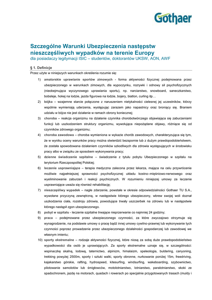 Szczególne Warunki Ubezpieczenia następstw nieszczęśliwych wypadków na terenie Europy dla posiadaczy legitymacji ISIC – studentów, doktorantów UKSW, AON, AWF § 1. Definicje Przez użyte w niniejszych warunkach określenia rozumie się: 1) amatorskie uprawianie sportów zimowych - forma aktywności fizycznej podejmowana przez ubezpieczonego w warunkach zimowych, dla wypoczynku, rozrywki i odnowy sił psychofizycznych (nieobejmująca wyczynowego uprawiania sportu), np. narciarstwo, snowboard, saneczkarstwo, bobsleje, hokej na lodzie, jazda figurowa na lodzie, bojery, biatlon, curling itp… 2) bójka – wzajemne starcie połączone z naruszeniem nietykalności cielesnej jej uczestników, którzy wspólnie wymieniają uderzenia, występując zarazem jako napastnicy oraz broniący się. Braniem udziału w bójce nie jest działanie w ramach obrony koniecznej; 3) choroba – reakcja organizmu na działanie czynnika chorobotwórczego objawiająca się zaburzeniami funkcji lub uszkodzeniem struktury organizmu, wywołująca niepożądane objawy, różniące się od czynników zdrowego organizmu; 4) choroba zawodowa – choroba wymieniona w wykazie chorób zawodowych, charakteryzująca się tym, że w wyniku oceny warunków pracy można stwierdzić bezspornie lub z dużym prawdopodobieństwem, że została spowodowana działaniem czynników szkodliwych dla zdrowia występujących w środowisku pracy albo w związku ze sposobem wykonywania pracy; 5) dzienne świadczenie szpitalne – świadczenie z tytułu pobytu Ubezpieczonego w szpitalu na terytorium Rzeczpospolitej Polskiej; 6) leczenie usprawniające – terapia medyczna zalecona przez lekarza, mająca na celu przywrócenie możliwie najpełniejszej sprawności psychofizycznej układu kostno–mięśniowo-nerwowego oraz wyeliminowanie zaburzeń i reakcji psychicznych. W rozumieniu niniejszej umowy za leczenie usprawniające uważa się również rehabilitację; 7) nieszczęśliwy wypadek – nagłe zdarzenie, powstałe w okresie odpowiedzialności Gothaer TU S.A., wywołane przyczyną zewnętrzną, w następstwie którego ubezpieczony, wbrew swojej woli doznał uszkodzenia ciała, rozstroju zdrowia, powodujące trwały uszczerbek na zdrowiu lub w następstwie którego nastąpił zgon ubezpieczonego. 8) pobyt w szpitalu - leczenie szpitalne trwające nieprzerwanie co najmniej 24 godziny; 9) praca – podejmowane przez ubezpieczonego czynności, za które zwyczajowo otrzymuje się wynagrodzenie, na podstawie umowy o pracę bądź innej umowy cywilno-prawnej lub wykonywanie tych czynności poprzez prowadzenie przez ubezpieczonego działalności gospodarczej lub zawodowej we własnym imieniu; 10) sporty ekstremalne – rodzaje aktywności fizycznej, które niosą za sobą duże prawdopodobieństwo wypadkowości dla osób je uprawiających. Za sporty ekstremalne uznaje się, w szczególności: wspinaczkę skalną, lodową, taternictwo, alpinizm, himalaizm, speleologia, buldering, canyoning, trekking powyżej 2500m, sporty i sztuki walki, sporty obronne, nurkowanie poniżej 15m, freedriving, kajakarstwo górskie, rafting, hydrospeed, kitesurfing, windsurfing, wakeboarding, szybownictwo, pilotowanie samolotów lub śmigłowców, motolotniarstwo, lotniarstwo, paralotniarstwo, skoki ze spadochronem, jazdę na motorach, quadach i rowerach po specjalnie przygotowanych trasach (muldy i Szczególne warunki ubezpieczenia następstw nieszczęśliwych wypadków dla posiadaczy legitymacji ISIC – studentów, doktorantów UKSW, AON, AWF przeszkody), bangee, zorbing, skoki narciarskie, oraz zamierzoną jazdę poza wyznaczonymi trasami, w tym jazdę wyczynową, udział w rajdach i wyścigach pojazdów wodnych lądowych lub powietrznych, wyprawy do miejsc charakteryzujących się ekstremalnymi warunkami klimatycznymi lub przyrodniczymi. 11) stan po użyciu alkoholu – stan, który występuje, gdy zawartość alkoholu w organizmie wynosi lub prowadzi do: a) stężenia we krwi od 0,2‰ do 0,5 ‰ alkoholu albo b) obecności w wydychanym powietrzu od 0,1 mg do 0,25 mg alkoholu w 1 dm³; 12) stan nietrzeźwości – stan, który występuje, gdy zawartość alkoholu w organizmie wynosi lub prowadzi do: a) stężenia we krwi powyżej 0,5 ‰ alkoholu albo b) obecności w wydychanym powietrzu powyżej 0,25 mg alkoholu w 1 dm 3 13) szpital – zakład opieki zdrowotnej świadczący całodobową opiekę nad chorymi w zakresie diagnostyki i leczenia, przy wykorzystaniu wykwalifikowanego zespołu lekarskiego i pielęgniarskiego. W rozumieniu niniejszych warunków za szpital nie uważa się domów opieki, hospicjów, ośrodków leczenia uzależnień oraz szpitali i ośrodków sanatoryjnych, rehabilitacyjnych i wypoczynkowych; 14) środki pomocnicze – wszelkie elementy wspomagające proces leczniczy, takie jak: gorsety, protezy, ortezy, kule, stabilizatory, aparaty ortopedyczne, okulary, aparaty słuchowe itp.; 15) trwały uszczerbek na zdrowiu - takie naruszenie sprawności organizmu, które powoduje upośledzenie czynności organizmu nierokujące poprawy, określone przez lekarza orzecznika Gothaer TU S.A. na podstawie przedstawionych dokumentów medycznych; 16) Tabela norm procentowego uszczerbku na zdrowiu – wykaz uszkodzeń oraz odpowiadający im procentowy przedział uszczerbku na zdrowiu przysługujący za dany uszczerbek; 17) Ubezpieczający – Stowarzyszenie „Almatur” 18) Ubezpieczony – posiadacz legitymacji ISIC - student, doktorant UKSW, AON, AWF, na rzecz których zawarta została mowę ubezpieczenia; 19) Ubezpieczyciel – Gothaer TU S.A. 20) Uprawniony – osoba upoważniona do otrzymania świadczenia w razie śmierci ubezpieczonego. W przypadku niewyznaczenia osoby uprawnionej, świadczenie przysługuje członkom rodziny ubezpieczonego według następującej kolejności: a) małżonkowi, b) dzieciom, c) rodzicom, d) innym ustawowym spadkobiercom. 21) wyczynowe uprawianie sportu – forma aktywności fizycznej polegająca na uprawianiu dy