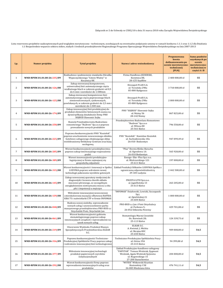 Załącznik nr 2 do Uchwały nr 2502/10 z dnia 31 marca 2010 roku Zarządu Województwa Świętokrzyskiego Lista rezerwowa projektów zaakceptowanych pod względem merytoryczno - technicznym, oczekujących na ewentualne podpisanie umowy w ramach konkursu 1.1.1 oraz 1.1.2 dla Działania 1.1 Bezpośrednie wsparcie sektora mikro, małych i średnich przedsiębiorstw Regionalnego Programu Operacyjnego Województwa Świętokrzyskiego na lata 2007-2013 Tytuł projektu Nazwa i adres wnioskodawcy Proponowana kwota dofinansowania po ocenie merytorycznotechnicznej [PLN] Rozbudowa i podniesienie standardu Ośrodka Wypoczynkowego "Cztery Wiatry" w Korytnicy 88. Zakup sterowanej komputerowo, uniwersalnej linii automatycznego cięcia wzdłużnego blach w zakresie grubości od 0,5 do 6 mm i szerokości do 1.500mm Zakup sterowanej komputerowo linii automatycznego cięcia poprzecznego blach zimnowalcowanych, cynkowanych, powlekanych, w zakresie grubości do 2,5 mm i szerokości do 1.500 mm Zakup innowacyjnej linii produkcyjnej do produkcji elementów betonowych szansa na dywersyfikację działalności firmy PHU SOJBUD Sławomir Sojka Firma Handlowa JEZIERSKI, Korytnica 88, 28-125 Szydłów 2 400 000,00 zł 55 Drozapol-Profil S.A. ul. Toruńska 298a 85-880 Bydgoszcz 3 710 000,00 zł 55 Drozapol-Profil S.A. ul. Toruńska 298a 85-880 Bydgoszcz 2 000 000,00 zł 55 PHU "SOJBUD" Sławomir Sojka ul. Niziny 56 28-142 Niziny 867 825,00 zł 55 WND-RPSW.01.01.00-26-250/09 Rozwój Przedsiębiorswta Budowlano remontowego "Budrem" Sp.z.o.o poprzez prowadzenie nowych produktów Przedsiębiorstwo Budowlano Remontowe "Budrem" Sp.z.o.o ul. Witosa 80 25-561 Kielce 796 550,00 zł 55 6 WND-RPSW.01.01.00-26-225/09 Poprawa konkurencyjności PHU "Koziołek" poprzez uruchomienie nowoczesnego obiektu hotelowo-usługowego obejmującego sklep wielobranżowy Delikatesy Centrum oraz bazę noclegową PHU "Koziołek" Stanisław Koziołek ul. Suchodniowska 18a 26-010 Bodzentyn 947 099,49 zł 55 7 WND-RPSW.01.01.00-26-205/09 55 WND-RPSW.01.01.00-26-389/09 "Plus" Dorota Klefas-Barucha ul. Ogrodowa 1A 26-010 Bodzentyn Energo- Eko- Plus Sp.z o.o. ul. Mielczarskiego 121 25-611 Kielce 565 920,00 zł 8 Wzrost konkurencyjności przedsiębiorstwa poprzez zakup innowacyjnego wyposażenia pralni Wzrost innowacyjności produkcyjnologistycznej w firmie zajmujacej się gospodarką odpadami 197 000,00 zł 55 9 WND-RPSW.01.01.00-26-315/08 2 442 500,00 zł 55 Lp. Numer projektu 1 WND-RPSW.01.01.00-26-235/09 2 WND-RPSW.01.01.00-26-126/08 3 WND-RPSW.01.01.00-26-125/08 4 5 10 11 WND-RPSW.01.01.00-26-174/09 Wzrost konkurencyjności i innowacji w Spółce Zakład Produkcji Silikatów LUDYNIA Spółka z LUDYNIA poprzez wdrożenie nowej ograniczoną odpowiedzialnością technologii pakowania wyrobów gotowych 29-105 Ludynia Suma punktów uzyskanych po ocenie merytorycznotechnicznej w części A i B WND-RPSW.01.01.00-26-145/09 Zakup nowoczenej aparatury medycznej do diagnostyki i leczenia chorób układu moczowo-płciowego, ze szczególnym uwzględnieniem nietrzymania moczu u obu płci i impotencji u mężczyn PROSTA LITH Sp.z.o.o. ul. Jagiellońska 13 25-613 Kielce 263 205,00 zł 55 WND-RPSW.01.01.00-26-139/08 Wdrożenie innowacyjnej nowoczesnej czterokolorowej maszyny offsetowej RAPIDA KBA 75 i naświetlarki CTP w firmie INFOMAX "INFOMAX" Działowski, Lewicki, Szczepanik Sp.j. ul. Opielińskiej 21 25-604 Kielce 1 000 000,00 zł 55 PRO-BUD s.c Jan i Piotr Strychalscy ul. Parkowa 5; 26-052 Sitkowka-Nowiny 429 701,08 zł 55 Stomatologia Maciej Ciesielski Os. Barwinek 28; 25-113 Kielce 124 339,73 zł 55 ELKAR S.C. A. Kwintal, J. Michta ul. Skrajna 80C 25-650 Kielce 909 000,00 zł 54,5 Techniczno-Produkcyjna Spółdzielnia Pracy ul. Górna 19A 25-415 Kielce 94 399,00 zł 54,5 204 000,00 zł 54,5 476 741,11 zł 54,5 12 WND-RPSW.01.01.00-26-048/09 13 WND-RPSW.01.01.00-26-061/09 Budowa nowej siedziby, wprowadzenie nowych usług i unowocześnienie parku maszynowego przedsiębiorstwa PRO-BUD s.c Strychalski Piotr, Strychalski Jan Wzrost konkurencyjności gabinetu stomatologicznego poprzez zakup innowacyjnych urządzeń i wprowadzenie na rynek nowych usług 14 WND-RPSW.01.01.00-26-219/09 Utworzenie Wydziału Produkcji Maszyn Specjalistycznych Przedsiebiorstwa ELKAR S.C. 15 WND-RPSW.01.01.00-26-316/09 Poprawa konkurencyjności TechnicznoProdukcyjnej Spółdzielni Pracy poprzez zakup i wdrożenie innowacyjnej linii technologicznej 16 WND-RPSW.01.01.00-26-377/09 Wdrożenie innowacyjnej technologii produkcji papierowych wyrobów instytucjonalnych 17 WND-RPSW.01.01.00-26-292/08 Wzrost konkurencyjności firmy poprzez wprowadzenia innowacyjnych usług oraz produktów Zakład Produkcyjno-handlowo-usługowy "PAPSTAR" Tomasz Woźniak, Zygmunt Woźniak, Agata Woźniak Sp.Jawna ul. Rogowskiego 15 27-200 Starachowice "WITEK" Witkowski Krystian Kostomłoty I 58 26-085 Miedziana Góra Lp. Numer projektu 18 WND-RPSW.01.01.00-26-274/08 19 WND-RPSW.01.01.00-26-322/08 20 WND-RPSW.01.01.00-26-152/08 Tytuł projektu Nazwa i adres wnioskodawcy Podniesienie poziomu innowacyjności usługowej oraz technologicznej firmy Vitelo Sp. z o.o. Wzrost konkurencyjności firmy EUROSTEEL poprzez zakup nowoczesnych maszyn do obróbki blachy Wzrost konkurencyjności i innowacyjności firmy GEMIKOL poprzez inwestycję w nowoczesną frezarkę oraz oprogramowanie do projektowania VITELO Spółka z o.o. ul. J.Kilińskiego 41 27-400 Ostrowiec Świętokrzyski EUROSTEEL Agnieszka Geisshirtul. Chorzowska 22 25-852 Kielce GEMIKOL Grzegorz Głogowski ul. Leśniówka 23 25-146 Kielce Wypożyczalnia Naczyń Kuchennych i Urządzeń Gastronomicznych. Firma Usługowa Paweł Buras ul. 1905 Roku 24A 25-802 Kielce Przedsiębiorstwo Budowlane PROMIR-BUD, ul. Jana Pawła II 25; 27-200 Starachowice Firma Handlowo-Usługowa "Malpol" Halina Michalec ul. Kilińskiego 57 27-400 Ostrowiec Świętokrzyski Proponowana kwota dofinansowania po ocenie merytorycznotechnicznej [PLN] Suma punktów uzyskanych po ocenie merytorycznotechniczn