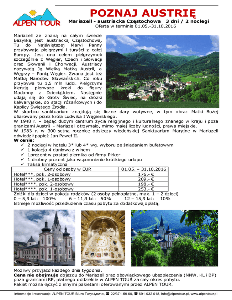 POZNAJ AUSTRIĘ Mariazell - austriacka Częstochowa 3 dni / 2 noclegi Oferta w terminie 01.05.-31.10.2016 Mariazell ze znaną na całym świecie Bazyliką jest austriacką Częstochową. Tu do Najświętszej Maryi Panny przybywają pielgrzymi i turyści z całej Europy. Jest ona celem pielgrzymek szczególnie z Węgier, Czech i Słowacji oraz Słowenii i Chorwacji. Austriacy nazywają Ją Wielką Matką Austrii, a Węgrzy – Panią Węgier. Zwana jest też Matką Narodów Słowiańskich. Co roku przybywa tu 1,5 mln ludzi. Pielgrzymi kierują pierwsze kroki do figury Madonny z Dzieciątkiem. Następnie udają się do Groty Świec, na dróżki kalwaryjskie, do stacji różańcowych i do Kaplicy Świętego Źródła. W skarbcu sanktuarium znajdują się liczne dary wotywne, w tym obraz Matki Bożej ofiarowany przez króla Ludwika I Węgierskiego. W 1948 r. – będąc dużym centrum życia religijnego i kulturalnego znanego w kraju i poza granicami Austrii - Mariazell otrzymało, mimo małej liczby ludności, prawa miejskie. W 1983 r. w 300-setną rocznicę odsieczy wiedeńskiej Sanktuarium Maryjne w Mariazell odwiedził papież Jan Paweł II. W cenie: 2 noclegi w hotelu 3* lub 4* wg. wyboru ze śniadaniem bufetowym 1 kolacja 4 daniowa z winem 1prezent w postaci piernika od firmy Pirker 1 drobny prezent jako wspomnienie krótkiego urlopu Taksa klimatyczna Ceny od osoby w EUR 01.05. – 31.10.2016 Hotel***, pok. 2-osobowy 176,- € Hotel***, pok. 1-osobowy 209,- € Hotel****, pok. 2-osobowy 198,- € Hotel****, pok. 1-osobowy 253,- € Zniżki dla dzieci w pokoju rodziców (2 osoby pełnopłatne, max. 1 – 2 dzieci) 0 – 5,9 lat: 100% 6 – 11,9 lat: 50% 12 – 15,9 lat: 10% Istnieje możliwość przedłużenia czasu pobytu za dodatkową opłatą. Możliwy przyjazd każdego dnia tygodnia. Cena nie obejmuje dojazdu do Mariazell oraz obowiązkowego ubezpieczenia (NNW, KL i BP) poza granicami RP, płatnego oddzielnie w ALPEN TOUR za cały okres pobytu. Pakiet można łączyć z innymi pakietami oferowanymi przez ALPEN TOUR. Informacje i rezerwacje: ALPEN TOUR Biuro Turystyczne, 22/371-59-60, 691-032-018, [email protected], www.alpentour.pl