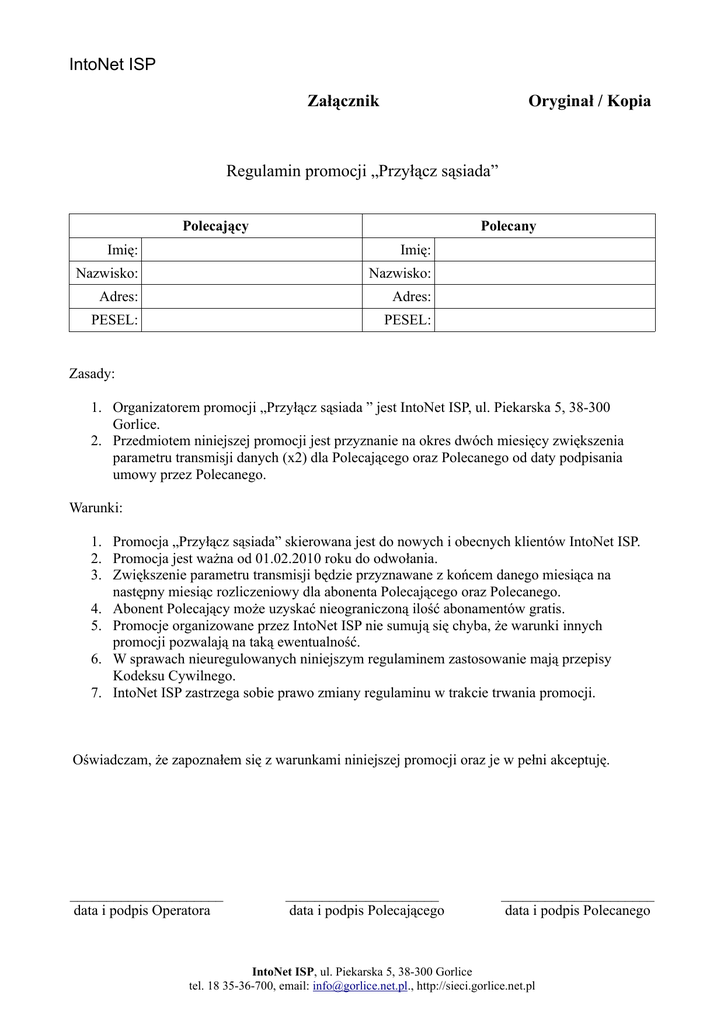 IntoNet ISP Załącznik Oryginał / Kopia Regulamin promocji „Przyłącz sąsiada” Polecający Polecany Imię: Imię: Nazwisko: Nazwisko: Adres: Adres: PESEL: PESEL: Zasady: 1. Organizatorem promocji „Przyłącz sąsiada ” jest IntoNet ISP, ul. Piekarska 5, 38-300 Gorlice. 2. Przedmiotem niniejszej promocji jest przyznanie na okres dwóch miesięcy zwiększenia parametru transmisji danych (x2) dla Polecającego oraz Polecanego od daty podpisania umowy przez Polecanego. Warunki: 1. Promocja „Przyłącz sąsiada” skierowana jest do nowych i obecnych klientów IntoNet ISP. 2. Promocja jest ważna od 01.02.2010 roku do odwołania. 3. Zwiększenie parametru transmisji będzie przyznawane z końcem danego miesiąca na następny miesiąc rozliczeniowy dla abonenta Polecającego oraz Polecanego. 4. Abonent Polecający może uzyskać nieograniczoną ilość abonamentów gratis. 5. Promocje organizowane przez IntoNet ISP nie sumują się chyba, że warunki innych promocji pozwalają na taką ewentualność. 6. W sprawach nieuregulowanych niniejszym regulaminem zastosowanie mają przepisy Kodeksu Cywilnego. 7. IntoNet ISP zastrzega sobie prawo zmiany regulaminu w trakcie trwania promocji. Oświadczam, że zapoznałem się z warunkami niniejszej promocji oraz je w pełni akceptuję. _____________________ data i podpis Operatora _____________________ data i podpis Polecającego _____________________ data i podpis Polecanego IntoNet ISP, ul. Piekarska 5, 38-300 Gorlice tel. 18 35-36-700, email: [email protected]., http://sieci.gorlice.net.pl