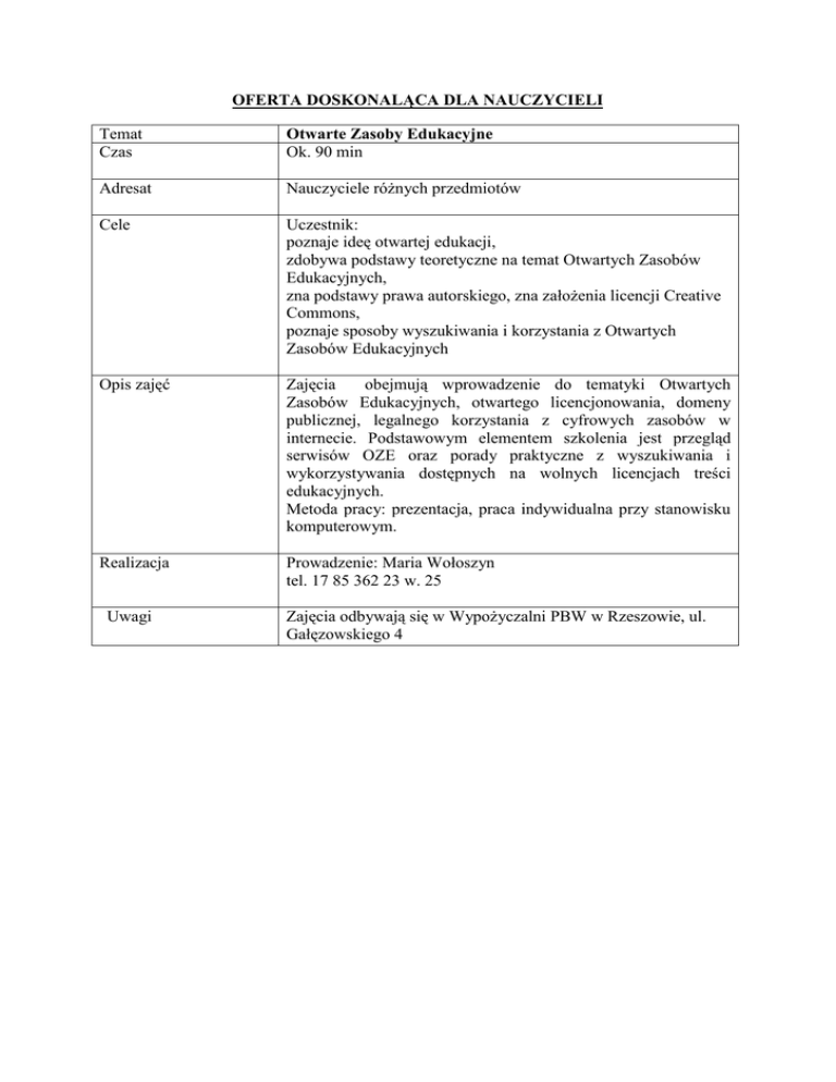 OFERTA DOSKONALĄCA DLA NAUCZYCIELI Temat Czas Otwarte Zasoby Edukacyjne Ok. 90 min Adresat Nauczyciele różnych przedmiotów Cele Uczestnik: poznaje ideę otwartej edukacji, zdobywa podstawy teoretyczne na temat Otwartych Zasobów Edukacyjnych, zna podstawy prawa autorskiego, zna założenia licencji Creative Commons, poznaje sposoby wyszukiwania i korzystania z Otwartych Zasobów Edukacyjnych Opis zajęć Zajęcia obejmują wprowadzenie do tematyki Otwartych Zasobów Edukacyjnych, otwartego licencjonowania, domeny publicznej, legalnego korzystania z cyfrowych zasobów w internecie. Podstawowym elementem szkolenia jest przegląd serwisów OZE oraz porady praktyczne z wyszukiwania i wykorzystywania dostępnych na wolnych licencjach treści edukacyjnych. Metoda pracy: prezentacja, praca indywidualna przy stanowisku komputerowym. Realizacja Prowadzenie: Maria Wołoszyn tel. 17 85 362 23 w. 25 Uwagi Zajęcia odbywają się w Wypożyczalni PBW w Rzeszowie, ul. Gałęzowskiego 4