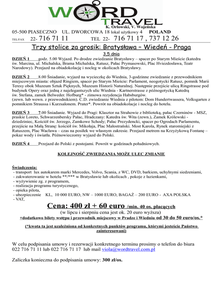 05-500 PIASECZNO TEL/FAX 22- 716 71 K. Orłowski, V. Wojeńska UL. DWORCOWA 18 lokal użytkowy 4 POLAND 11 TEL 22- 716 71 17 , 737 12 26 Trzy stolice za grosik: Bratysława – Wiedeń - Praga 3,5 dnia DZIEŃ 1 godz. 5.00 Wyjazd. Po drodze zwiedzanie Bratysławy – spacer po Starym Mieście (katedra św. Marcina, ul. Michalska, Brama Michalska, Ratusz, Pałac Prymasowski, Plac Hviezdosława, Teatr Narodowy). Przejazd na obiadokolację i nocleg w okolicach Bratysławy. DZIEŃ 2 8.00 Śniadanie, wyjazd na wycieczkę do Wiednia, 3-godzinne zwiedzanie z przewodnikiem miejscowym miasta: objazd Ringiem, spacer po Starym Mieście: Parlament, neogotycki Ratusz, pomnik Marii Teresy obok Muzeum Sztuk Pięknych, Muzeum Historii Naturalnej. Następnie przejście ulicą Ringstrasse pod budynek Opery oraz jedną z najelegantszych ulic Wiednia - Kartnerstrasse z późnogotycką Katedrą św. Stefana, zamek Belweder. Hofburg* - zimowa rezydencja Habsburgów. (zewn. lub wewn. z przewodnikiem). C.D. zwiedzanie Wiednia z pilotem: Dom Hundertwassera, Volksgarten z pomnikiem Straussa i Kurzsalonem. Prater*. Powrót na obiadokolacje i nocleg do hotelu. DZIEŃ 3 7.00 Śniadanie. Wyjazd do Pragi: Klasztor na Strahowie z biblioteką, pałac Czerninów - MSZ, praskie Loreto, Schwarzenbersky Pałac, Hradczany: Katedra św. Wita (zewn.), Zamek Królewski dziedziniec, Kościół św. Jerzego, Zamkowe Schody; Pałac Prezydencki, spacer po Ogrodach Parlamentu, przejście na Małą Stranę: kościół św. Mikołaja, Plac Małostrański. Most Karola, Rynek staromiejski z Ratuszem, Plac Wacława – czas na posiłek we własnym zakresie. Przejazd metrem na Krzyżykową Fontanę – pokaz wody i światła. Późnowieczorny wyjazd do Polski. DZIEŃ 4 Przejazd do Polski z postojami. Powrót w godzinach południowych. KOLEJNOŚĆ ZWIEDZANIA MOŻE ULEC ZMIANIE Świadczenia: - transport lux autokarem marki Mercedes, Volvo, Scania, z WC, DVD, barkiem, uchylnymi siedzeniami, - zakwaterowanie w hotelu **/*** w Bratysławie lub okolicach , pokoje z łazienkami, - wyżywienie zg. z programem, - realizacja programu turystycznego, - opieka pilota, - ubezpieczenie KL, 10 000 EURO, NW – 1000 EURO, BAGAŻ – 200 EURO - AXA POLSKA - VAT, Cena: 400 zł + 60 euro /min. 40 os. płacących (w lipcu i sierpniu cena jest ok. 20 euro wyższa) +dodatkowo bilety wstępu i przewodnik miejscowy w Pradze i Wiedniu od 30 do 50 euro/os.* (*kwota ta jest uzależniona od konkretnych punktów programu, którymi jesteście Państwo zainteresowani) W celu podpisania umowy i rezerwacji konkretnego terminu prosimy o telefon do biura 022 716 71 11 lub 022 716 71 17 lub mail [email protected] Zaliczka konieczna do podpisania umowy: 300 zł/os. Termin, który Państwa interesuje, potwierdzamy po sprawdzeniu dostępności wolnych miejsc w hotelu. Dokonujemy rezerwacji wstępnej na czas zebrania zaliczek ( najczęściej nie dłużej niż 4 tyg.). KWOTĘ NA BILETY WSTĘPU POTWIERDZAMY PRZED DOPŁATĄ ZGODNIE Z OBOWIĄZUJĄCYMI CENNIKAMI Wyciąg z warunków uczestnictwa imprez turystycznych organizowanych przez B.P. Word Travel (pełna wersja warunków uczestnictwa dostępna jest u przedstawiciela grupy organizującego wycieczkę): 13. W przypadku rezygnacji lub nie uczestniczenia Uczestnika w wykupionej imprezie Organizator uprawniony jest do potrącenia RZECZYWIŚCIE PONIESIONYCH KOSZTÓW. 14. Zmiana uczestnika nie pociąga za sobą kosztów finansowych. 18. Uczestnik odpowiada za wszelkie szkody materialne wyrządzone w trakcie trwania imprezy (zniszczenia w hotelu, autokarze). 15. Jeżeli w programie jest wyjazd poza granicę Polski - uczestnik winien posiadać na miejscu zbiórki aktualnie obowiązujące dokumenty uprawniające do przekroczenia granic krajów objętych programem imprezy (wyłącznie dowód osobisty lub paszport ważny min. 6 m-cy od daty powrotu). 9 B. W przypadku chorób uznawanych za przewlekłe uczestnik winien na własny koszt wykupić dodatkowe ubezpieczenie ! (dotyczy wycieczek zagranicznych). Klient przez dokonanie wpłaty (całkowitej lub częściowej) akceptuje program wycieczki i warunki uczestnictwa.