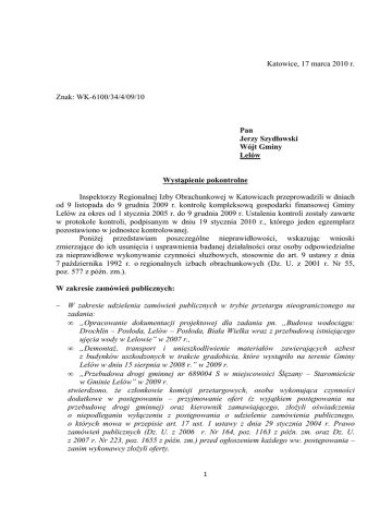 Katowice, 17 marca 2010 r. Znak: WK-6100/34/4/09/10 Pan Jerzy Szydłowski Wójt Gminy Lelów Wystąpienie pokontrolne Inspektorzy Regionalnej Izby Obrachunkowej w Katowicach przeprowadzili w dniach od 9 listopada do 9 grudnia 2009 r. kontrolę kompleksową gospodarki finansowej Gminy Lelów za okres od 1 stycznia 2005 r. do 9 grudnia 2009 r. Ustalenia kontroli zostały zawarte w protokole kontroli, podpisanym w dniu 19 stycznia 2010 r., którego jeden egzemplarz pozostawiono w jednostce kontrolowanej. PoniŜej przedstawiam poszczególne nieprawidłowości, wskazując wnioski zmierzające do ich usunięcia i usprawnienia badanej działalności oraz osoby odpowiedzialne za nieprawidłowe wykonywanie czynności słuŜbowych, stosownie do art. 9 ustawy z dnia 7 października 1992 r. o regionalnych izbach obrachunkowych (Dz. U. z 2001 r. Nr 55, poz. 577 z późn. zm.). W zakresie zamówień publicznych: − W zakresie udzielenia zamówień publicznych w trybie przetargu nieograniczonego na zadania: • „Opracowanie dokumentacji projektowej dla zadania pn. „Budowa wodociągu: Drochlin – Posłoda, Lelów – Posłoda, Biała Wielka wraz z przebudową istniejącego ujęcia wody w Lelowie” w 2007 r., • „DemontaŜ, transport i unieszkodliwienie materiałów zawierających azbest z budynków uszkodzonych w trakcie gradobicia, które wystąpiło na terenie Gminy Lelów w dniu 15 sierpnia w 2008 r.” w 2009 r. • „Przebudowa drogi gminnej nr 689004 S w miejscowości Ślęzany – Staromieście w Gminie Lelów” w 2009 r. stwierdzono, Ŝe członkowie komisji przetargowych, osoba wykonująca czynności dodatkowe w postępowaniu – przyjmowanie ofert (z wyjątkiem postępowania na przebudowę drogi gminnej) oraz kierownik zamawiającego, złoŜyli oświadczenia o niepodleganiu wyłączeniu z postępowania o udzielenie zamówienia publicznego, o których mowa w przepisie art. 17 ust. 1 ustawy z dnia 29 stycznia 2004 r. Prawo zamówień publicznych (Dz. U. z 2006 r. Nr 164, poz. 1163 z późn. zm. oraz Dz. U. z 2007 r. Nr 223, poz. 1655 z późn. zm.) przed ogłoszeniem kaŜdego ww. postępowania – zanim wykonawcy złoŜyli oferty. 1 Naruszono tym przepis art. 17 ust. 2 ustawy z dnia 29 stycznia 2004 r. Prawo zamówień publicznych (Dz. U. z 2007 r. Nr 223, poz. 1655 z późn. zm.). Zgodnie z przytoczonym przepisem, osoby wykonujące czynności w postępowaniu o udzielenie zamówienia publicznego winny, pod rygorem odpowiedzialności karnej za fałszywe zeznania, złoŜyć pisemne oświadczenie o braku lub istnieniu okoliczności powodujących konieczność wyłączenia z udziału w postępowaniu. Wskazane osoby podpisały ww. oświadczenia 7 listopada 2007 r., 15 kwietnia 2009 r., 1 lipca 2009 r., tj. w dniach powołania komisji przetargowych, kiedy nie mogły mieć wiedzy, którzy wykonawcy złoŜą oferty. Terminy otwarcia / składania ofert wyznaczono na: 22 listopada 2007 r., 27 kwietnia 2009 r., 27 lipca 2009 r. Przetarg na realizację zadania „Opracowanie dokumentacji projektowej dla zadania pn. „Budowa wodociągu: Drochlin – Posłoda, Lelów – Posłoda, Biała Wielka wraz z przebudową istniejącego ujęcia wody w Lelowie” przeprowadziła komisja przetargowa powołana Zarządzeniem Nr 52/2007 Wójta Gminy Lelów z dnia 7 listopada 2007 r. Przetarg na realizację zadania „DemontaŜ, transport i unieszkodliwienie materiałów zawierających azbest z budynków uszkodzonych w trakcie gradobicia, które wystąpiło na terenie Gminy Lelów w dniu 15 sierpnia w 2008 r.” przeprowadziła komisja przetargowa powołana Zarządzeniem Nr 15/2009 Wójta Gminy Lelów z dnia 15 kwietnia 2009 r. Przetarg na realizację zadania „Przebudowa drogi gminnej nr 689004 S w miejscowości Ślęzany- Staromieście w Gminie Lelów” w 2009 r.” przeprowadziła komisja przetargowa powołana Zarządzeniem Nr 35/2009 Wójta Gminy Lelów z dnia 1 lipca 2009 r. − W 2007 r. zaniechano zamieszczenia ogłoszenia o udzieleniu zamówienia w Biuletynie Zamówień Publicznych po podpisaniu umowy na realizację zadania „Opracowanie dokumentacji projektowej dla zadania pn „Budowa wodociągu: Drochlin – Posłoda, Lelów – Posłoda, Biała Wielka wraz z przebudową istniejącego ujęcia wody w Lelowie”. Naruszono tym przepis art. 95 ust. 1 ustawy z dnia 29 stycznia 2004 r. – Prawo zamówień publicznych (Dz. U. z 2006 r., Nr 164, poz. 1163 z późn. zm.). Zgodnie z przytoczonym przepisem, zamawiający niezwłocznie po zawarciu umowy w sprawie zamówienia publicznego zamieszcza ogłoszenie o udzieleniu zamówienia w Biuletynie Zamówień Publicznych. Zadania w zakresie przygotowania projektów ogłoszeń naleŜały do pracownika Referatu Gospodarki i Rozwoju. Nadzór w tym zakresie sprawował Kierownik Referatu Gospodarki i Rozwoju. Wniosek nr 1 Wzmocnić nadzór nad pracownikami Urzędu Gminy w Lelowie odpowiedzialnymi za przygotowanie i przeprowadzanie postępowań o udzielenie zamówień publicznych, stosownie do przepisów ustawy z dnia 29 stycznia 2004 r. Prawo zamówień publicznych (Dz. U. z 2007 r. Nr 223, poz. 1655 z późn. zm.), mając na uwadze przepisy art. 68 oraz art. 69 ust. 1 pkt 3 ustawy z dnia 27 sierpnia 2009 r. o finansach publicznych (Dz. U. Nr 157, poz. 1240 z późn. zm. ). W zakresie wydatków bieŜących: − W trakcie kontroli postępowań o udzielenie w latach 2008 – 2009 dotacji na realizację zadań publicznych w zakresie upowszechniania kultury fizycznej i sportu na terenie Gminy Lelów stwierdzono, Ŝe: • w ogłoszeniach z 25 stycznia 2008 r., 4 sierpnia 2008 r. oraz 3 lutego 2009 r. 2 • • • • • o otwartych konkursach ofert na realizację ww. zadań publicznych nie zawarto informacji wymaganych przepisem art. 13 ust. 2 pkt 7 ustawy z dnia 24 kwietnia 2003 r. o działalności poŜytku publicznego i o wolontariacie (Dz. U. Nr 96, poz. 873 z późn. zm.). W ogłoszeniach tych nie wskazano informacji o zrealizowanych przez organ administracji public