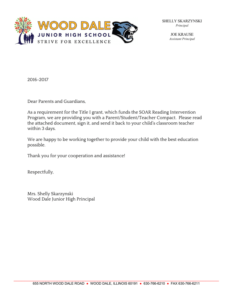 2016-2017 Dear Parents and Guardians, As a requirement for the Title I grant, which funds the SOAR Reading Intervention Program, we are providing you with a Parent/Student/Teacher Compact. Please read the attached document, sign it, and send it back to your child’s classroom teacher within 3 days. We are happy to be working together to provide your child with the best education possible. Thank you for your cooperation and assistance! Respectfully, Mrs. Shelly Skarzynski Wood Dale Junior High Principal _____________________________________________________________________________ 655 NORTH WOOD DALE ROAD ● WOOD DALE, ILLINOIS 60191 ● 6307666210 ● FAX 6307666211 Wood Dale Junior High SOAR Program Parent-Student-Teacher Compact 2016-2017 School Year In an effort to improve student reading achievement during the school year, In District 7, we will: ● Hold a SOAR Family Orientation and Parent/Teacher Conferences. ● Provide high-quality curriculum and instruction in a supportive and effective learning environment that enables the participating children to meet the State’s academic achievement standards. ● Provide parents/guardians with reports on your child’s progress and resources to assist them. ● Provide parents/guardians reasonable access to staff. ● Provide parents/guardians opportunities to volunteer and participate in their child’s school and to observe classroom activities. As the Parent/Guardian, I will: (choose and circle 3) ● Attend a SOAR Family Orientation meeting with my child. ● Encourage my child to read independently on a daily basis. ● Limit television viewing and electronic game playing during the school week to no more than 2 hours a day (recommended by the American Academy of Pediatrics). ● Check to see that my child’s daily homework is not only finished, but reflective of my child’s ability. ● Contact my child’s teachers or the SOAR teacher if I have a question about how to best assist my child to succeed. ● Provide a quiet study area for my child to complete school work. ● Ask my child “What did you learn in ____________ today?” As the Student, I will: (choose and circle 3) ● Attend a SOAR Family Orientation with my parent/guardian. ● Limit television viewing and electronic game playing during the school week to no more than 2 hours a day (recommended by the American Academy of Pediatrics). ● Use my free time to read for fun (minimum of 1 hour per week). ● Ask questions when I don’t understand and participate in class. ● Share all of my schoolwork and school notes with my parent/guardian. ● Discuss what I am reading and learning about in school. ● Come to school prepared with my materials, homework completed to the best of my ability and a positive attitude. ● Participate positively in an extracurricular activity or club. As the SOAR Teacher, I will: ● Provide a SOAR Family Orientation as well as Parent/Teacher Conference times to discuss your child’s performance and future needs. ● Provide high quality instruction to your child. ● Provide all testing information and explain your child’s progress, when requested. ● Provide time to answer any questions you may have about an assignment or about how to assist your child. ● Articulate with your child’s classroom teachers to support their skills across content areas. Parent/Guardian Signature: ______________________________________ Date: _________________________ Student Signature: _______________________________________________ Date: _________________________ SOAR Teacher: __________________________________________________ Date: _________________________ 2016-2017 Estimados Padres y Guardianes, Como requisito para la concesión del Título I, cual financia el Programa de Intervención de Lectura SOAR, ponemos a su disposición un compacto de Padre/Estudiante /Maestro. Por favor lea el documento adjunto, fírmelo y envíelo de vuelta al maestro de su hijo/a dentro de 3 días. Estamos encantados de estar trabajando juntos para proporcionarle a su hijo/a la mejor educación posible. Gracias por su cooperación y ayuda! Respetuosamente, Sra. Shelly Skarzynski Principal de Wood Dale Junior High _____________________________________________________________________________ 655 NORTH WOOD DALE ROAD ● WOOD DALE, ILLINOIS 60191 ● 6307666210 ● FAX 6307666211 Wood Dale Junior High Programa de SOAR Pacto de Padre-Estudiante-Maestro 2016-2017 Año Escolar De parte del esfuerzo para mejorar el éxito de los estudiantes en lectura durante el año escolar, En el Distrito 7, nosotros vamos a: ● Llevar a cabo una Orientación de Familia de SOAR y Conferencias de Padre/Maestro. ● Proveer un currículo de alta calidad e instrucción en un ambiente de aprendizaje propicio y eficaz que permite a los estudiantes participantes a cumplir con los estándares de logro académico del estado. ● Proveer a los padres/guardianes con reportes de progreso de su hijo/a y los recursos para ayudarlos. ● Proveer a los padres/guardianes acceso razonable al personal de la escuela. ● Proveer a los padres/guardianes oportunidades para ser voluntarios y participar en las clases de su hijo/a y observar actividades en el salón de la escuela WDJH. Como el Padre/Guardián, yo voy a: (Elija y circule 3) ● Asistir a una reunión de Orientación de Familia de SOAR y Conferencia de Padre/Maestro con mi hijo/a. ● Animar a mi hijo/a a leer de forma independiente diariamente. ● Limitar el mirar la televisión y usar juegos electrónicos a no más de 2 horas al día durante la semana escolar (come es recomendado por la Academia Americana de Pediatrías). ● Revisar que la tarea de mi hijo/a este terminada, y que refleje las habilidades de mi hijo/a. ● Comunicarme con el maestro de mi hijo/a o su maestro de SOAR si tengo preguntas acerca de cómo mejor ayudar a mi hijo/a para que tenga éxito. ● Proporcionar una área de estudio tranquila para que mi hijo/a pueda estudiar y