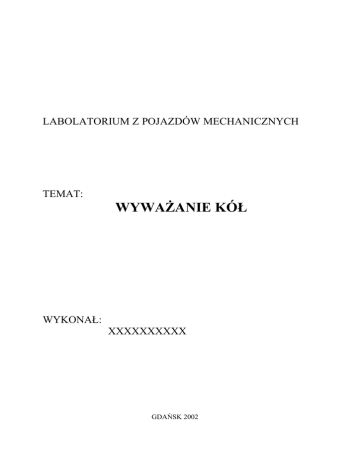 LABOLATORIUM Z POJAZDÓW MECHANICZNYCH TEMAT: WYWAśANIE KÓŁ WYKONAŁ: XXXXXXXXXX GDAŃSK 2002 Pierwszych informacji o niewywaŜeniu koła dostarcza obserwowanie zachowania pojazdu podczas jazdy na drodze oraz wygląd bieŜnika opon. Objawia się to drganiem kół, stukami w zawieszeniu a w zawieszeniu przednim poprzez układ kierowniczy przenosi się na koło kierownicy. Na oponach powstają miseczkowate zuŜycia bieŜnika równomiernie rozmieszczonych na obwodzie. Wystąpienie tycz objawów, a szczególnie wibracji koła kierownicy świadczy juŜ o znacznym stopniu niewywaŜenia, które moŜe w rezultacie doprowadzić do zagroŜenia bezpieczeństwa ruchu drogowego. Niebezpieczeństwo wynika z odciąŜania koła pod wpływem niewywaŜonej masy powodując chwilowe zmiany siły tarcia, co szczególnie na zakrętach moŜe doprowadzić do utraty przyczepności i wypadku. NiewywaŜenie jest zjawiskiem szkodliwym dla samochodu, bowiem zwiększa dynamiczne obciąŜenie łoŜysk kół i zawieszenia, tym samym przyśpieszając zuŜywanie tych zespołów. Błędy wywaŜania koła najczęściej powstają w wyniku niedokładnego wykonania opony i tarczy koła, nierównomiernego zuŜywania się bieŜnika czy z umieszczonych na dętce łatek. Dlatego teŜ, nie czekając na pojawienie się objawów niewywaŜenia kół, naleŜy sprawdzać ich wywaŜenie w ramach okresowej obsługi technicznej (zgodnie z zaleceniami producenta), a takŜe po przekładaniu starych opon lub zamontowania nowych względnie po zgubieniu cięŜarka z tarczy koła. Wirująca, nie zróŜnicowana masa koła moŜe wywołać drgania w kierunku pionowym, wokół zawieszenia wahaczy (a) lub, jeŜeli koła są kierowane, w kierunku poziomym, wokół sworznia zwrotnicy (b). Toczące się, niewywaŜone koło drga w kierunku Pionowym (a) lub poziomym (b). Uzyskanie spokojnego toczenia się koła wymaga takiego wyrównania mas uczestniczących w ruchu obrotowym, aby oś bezwładności oraz środek masy pokrywały się dokładnie z osią obrotu. 2 NiewywaŜenie Przedstawione na rysunku (a), wywołujące pionowe drgania koła, moŜna usunąć w sposób stateczny tzn. bez konieczności wprawiania koła w ruch obrotowy. UłoŜyskowane koło ustawi się zawsze tak, Ŝe najcięŜszy jego punkt zajmie połoŜenie najniŜsze. CięŜarki wywaŜające naleŜałoby umieścić naprzeciwko najcięŜszego punktu, tak dobierając ich masę, aby koło pozostawało w bezruchu w kaŜdym nadanym mu połoŜeniu. CięŜarki powinno się mocować po obu stronach tarczy koła w celu uniknięcia niewywaŜenia dynamicznego (b i c). Ten drugi rodzaj niewywaŜenia powodujący głównie poziome drgania koła, moŜna usunąć wprowadzając koło w ruch obrotowy i równowaŜąc cięŜarkami powstające wówczas siły i momenty. Schematyczne przedstawienie działania niewywaŜenia i sposobu Jego usunięcia: a- koło statycznie niewywaŜone ( środek masy koła nie pokrywa się z osią jego obrotu) b- koło statycznie wywaŜone, ale umieszczenie cięŜarka po jednej stronie tarczy spowodowało nie wywaŜenie dynamiczne (główna oś bezwładności koła nie pokrywa się z osią jego obrotu) c- koło wywaŜone statycznie i dynamicznie 1- oś bezwładności koła; 2- nadmiar masy powodujący niewywaŜenie; 3- cięŜarek wywaŜający; Oba rodzaje niewywaŜania będą szczególnie silnie odczuwane, jeŜeli wystąpią w przednich kołach zawieszonych niezaleŜnie. Natomiast najmniejsze oddziaływanie niewywaŜenia (tylko statyczne) wystąpi w tylnym zawieszeniu o osi sztywnej. Do ustalenia wielkości i połoŜenia masy nierównowaŜnej, a następnie jej usunięcia słuŜą wywaŜarki, wykonane jako urządzenie stacjonarne (koło musi być wymontowane z samochodu do badania) lub dostawne (koło pozostaje na pojeździe). 3 WywaŜanie koła wymontowanego z samochodu Ten sposób wywaŜania koła, z uŜyciem wywaŜarki stacjonarnej, cechuje znaczna dokładność samego pomiaru oraz, co jest jego wadą, brak gwarancji uzyskania pełnego efektu wywaŜania. Ta druga cecha wynika z nieuwzględnienia podczas pomiaru innych mas obrotowych niŜ koła, np. bębna hamulcowego jak równieŜ przyjęcia osi wywaŜarki za bazę pomiarową. Po 15zamontowaniu wywaŜonego koła do samochodu moŜe, więc się okazać, Ŝe nadal istnieje niewywaŜenie, które moŜe powodować bęben hamulcowy lub niecentrycznie z osią obrotu zamocowana tarcza koła. Wśród wywaŜarek stacjonarnych najbardziej rozpowszechnione są wywaŜarki z elektronicznym systemem, wyrównowaŜania. Siły odśrodkowe wywołane masą niewyrównowaŜoną powodują zmienne drgania podpory spręŜystej. Za pomocą odpowiedniego czujnika są one przetwarzane na impuls elektryczny o częstotliwości proporcjonalnej do obrotów koła i amplitudzie proporcjonalnej do niewywaŜenia. W najnowszych konstrukcjach wywaŜarek stosuje się rozwiązanie z niewahliwie łoŜyskowaną podporą. Rozwiązania konstrukcyjne nowoczesnych wywaŜarek stacjonarnych umoŜliwiają m.in.: - Uzyskanie wysokiej czułości układu pomiarowego; dokładność wskazań niewywaŜenia jest regulowana dwu- lub trzystopniowo (dla wywaŜenia precyzyjnego do 1g, dla normalnego do 5g i dla zgrubnego do 10g); dokładność wskazań miejsca niewywaŜenia dochodzi do 1,5◦; - ObniŜenie prędkości obrotowej wału wywaŜarki, dzięki czemu uległy skróceniu czas rozbiegu koła, czas pomiaru (do 3 s) i czas wyhamowywania; zwiększa to równieŜ trwałość urządzenia; - Pokazywanie na tablicy wskaźników lokalizacji niewywaŜenia w sposób graficzny – za pomocą wielu diod świetlnych, rozmieszczonych kołowo na rysunku obręczy - Pomiar niewywaŜenia dla obu płaszczyzn w jednym przebiegu pomiarowym; parametry niewywaŜenia są wyświetlane jednocześnie ( w przypadku dwóch wskaźników cyfrowych) lub zapamiętywanie i wyświetlanie kolejno dla obu płaszczyzn ( w przypadku jednego wskaźnika); - WywaŜenie kół z tarczami ze stopu aluminiowego i róŜnym syste