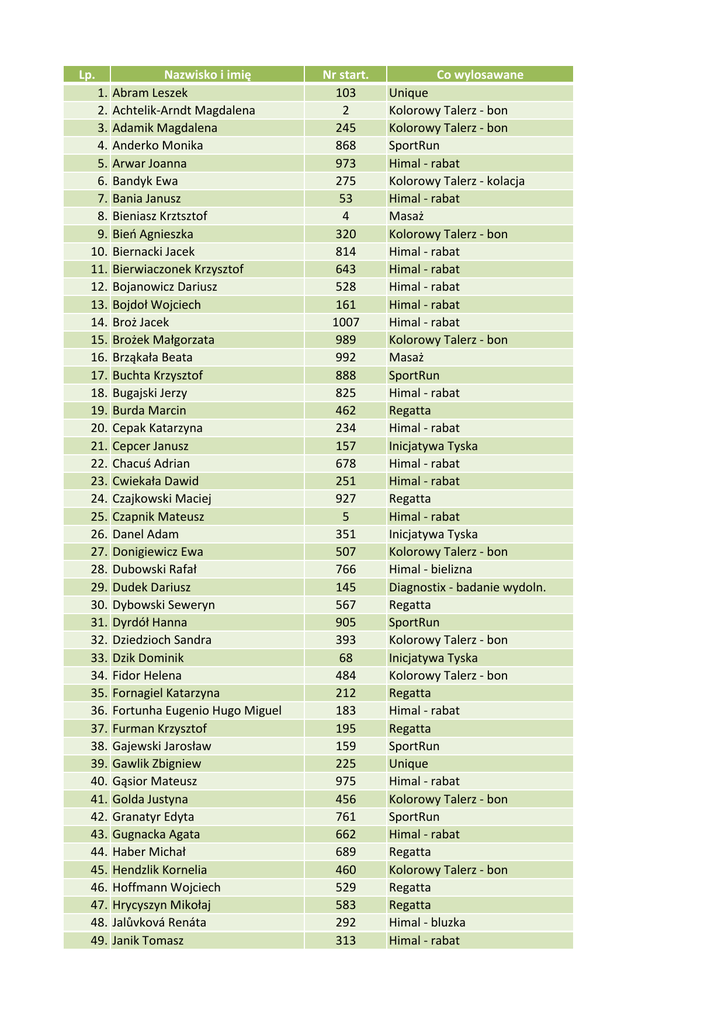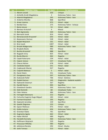 Lp. 1. 2. 3. 4. 5. 6. 7. 8. 9. 10. 11. 12. 13. 14. 15. 16. 17. 18. 19. 20. 21. 22. 23. 24. 25. 26. 27. 28. 29. 30. 31. 32. 33. 34. 35. 36. 37. 38. 39. 40. 41. 42. 43. 44. 45. 46. 47. 48. 49. Nazwisko i imię Abram Leszek Achtelik-Arndt Magdalena Adamik Magdalena Anderko Monika Arwar Joanna Bandyk Ewa Bania Janusz Bieniasz Krztsztof Bień Agnieszka Biernacki Jacek Bierwiaczonek Krzysztof Bojanowicz Dariusz Bojdoł Wojciech Broż Jacek Brożek Małgorzata Brząkała Beata Buchta Krzysztof Bugajski Jerzy Burda Marcin Cepak Katarzyna Cepcer Janusz Chacuś Adrian Cwiekała Dawid Czajkowski Maciej Czapnik Mateusz Danel Adam Donigiewicz Ewa Dubowski Rafał Dudek Dariusz Dybowski Seweryn Dyrdół Hanna Dziedzioch Sandra Dzik Dominik Fidor Helena Fornagiel Katarzyna Fortunha Eugenio Hugo Miguel Furman Krzysztof Gajewski Jarosław Gawlik Zbigniew Gąsior Mateusz Golda Justyna Granatyr Edyta Gugnacka Agata Haber Michał Hendzlik Kornelia Hoffmann Wojciech Hrycyszyn Mikołaj Jalůvková Renáta Janik Tomasz Nr start. 103 2 245 868 973 275 53 4 320 814 643 528 161 1007 989 992 888 825 462 234 157 678 251 927 5 351 507 766 145 567 905 393 68 484 212 183 195 159 225 975 456 761 662 689 460 529 583 292 313 Co wylosawane Unique Kolorowy Talerz - bon Kolorowy Talerz - bon SportRun Himal - rabat Kolorowy Talerz - kolacja Himal - rabat Masaż Kolorowy Talerz - bon Himal - rabat Himal - rabat Himal - rabat Himal - rabat Himal - rabat Kolorowy Talerz - bon Masaż SportRun Himal - rabat Regatta Himal - rabat Inicjatywa Tyska Himal - rabat Himal - rabat Regatta Himal - rabat Inicjatywa Tyska Kolorowy Talerz - bon Himal - bielizna Diagnostix - badanie wydoln. Regatta SportRun Kolorowy Talerz - bon Inicjatywa Tyska Kolorowy Talerz - bon Regatta Himal - rabat Regatta SportRun Unique Himal - rabat Kolorowy Talerz - bon SportRun Himal - rabat Regatta Kolorowy Talerz - bon Regatta Regatta Himal - bluzka Himal - rabat Lp. 50. 51. 52. 53. 54. 55. 56. 57. 58. 59. 60. 61. 62. 63. 64. 65. 66. 67. 68. 69. 70. 71. 72. 73. 74. 75. 76. 77. 78. 79. 80. 81. 82. 83. 84. 85. 86. 87. 88. 89. 90. 91. 92. 93. 94. 95. 96. 97. 98. Nazwisko i imię Jochemczyk Aleksandra Kaczor Joanna Kaduk Sandra Kalinowska Aneta Kasprzycki Rajmund Kempska Agnieszka Kijas Marcin Kloc Marlena Knapik Agnieszka Kocoń Mirosława Kolasa Aneta Konik Grzegorz Kopczyk Kasia Kowalik Marta Kozłowska Ilona Krupa Maciej Kula Katarzyna Kurasz Joanna Kurowski Michał Lasoń Tomasz Lenart Sylwia Lorens Piotr Loska Aleksandra Loska Aleksandra Loska Anita Łata Łukasz Ławińska Katarzyna Magdziak Ewelina Majewska Daria Majos Adrian Meller Grzegorz Michalik Ewa Miszczyk Agnieszka Moskwa Izabela Mróz Krystyna Mścichowska-Bąk Alicja Muc Tomasz Muller Mateusz Murray Alex Musioł Andrzej Muszyńska Bożena Niemiec Andrzej Nocuń Wioletta Nowicka Zuzanna Ogórek Jacek Orlik Anna Orlik Paweł Pach Waldemar Pach Zuzanna Nr start. 650 162 945 410 976 883 205 703 119 307 354 106 553 952 263 258 704 277 128 77 164 102 349 304 305 965 521 679 254 341 974 407 110 224 739 717 37 977 978 389 471 362 765 248 674 214 215 998 997 Co wylosawane Himal - bluzka Kolorowy Talerz - bon Kolorowy Talerz - kolacja Kolorowy Talerz - bon Himal - rabat Kolorowy Talerz - bon Himal - rabat SportRun Kolorowy Talerz - bon Diagnostix - pobyt w hotelu Kolorowy Talerz - kolacja Regatta Kolorowy Talerz - bon Kolorowy Talerz - bon Regatta Himal - rabat Kolorowy Talerz - bon Himal - bluzka Regatta Himal - rabat Kolorowy Talerz - bon Himal - rabat Kolorowy Talerz - bon Himal - rabat Himal - rabat Regatta Kolorowy Talerz - bon Kolorowy Talerz - bon Inicjatywa Tyska SportRun Himal - rabat Kolorowy Talerz - bon Himal - bluzka Kolorowy Talerz - bon Himal - rabat Kolorowy Talerz - kolacja SportRun Himal - rabat Himal - rabat Unique Unique Regatta Kolorowy Talerz - bon Kolorowy Talerz - bon Himal - bielizna Himal - rabat Himal - rabat SportRun Kolorowy Talerz - bon Lp. 99. 100. 101. 102. 103. 104. 105. 106. 107. 108. 109. 110. 111. 112. 113. 114. 115. 116. 117. 118. 119. 120. 121. 122. 123. 124. 125. 126. 127. 128. 129. 130. 131. 132. 133. 134. 135. 136. 137. 138. 139. 140. 141. 142. 143. 144. 145. 146. 147. Nazwisko i imię Papok-Smerczek Karolina Paszek Paulina Pelic Małgorzata Pendolski Franciszek Piecuch Grzegorz Piszczek Kinga Płaszczyca Rafał Podemska Dominika Polak Piotr Porębska Monika Ptaszek Dominika Pudełko Monika Pudlik Michał Rabenda Dominika Romańczuk Marta Różański Tomasz Rurarz Aleksandra Ruszkowski Paweł Rynkiewicz Anna Sienkiewicz Anna Sierocka Patrycja Sitarz Marcin Skoczylas Paulina Słota Magdalena Sobolewski Zdzisław Socha Dorota Sornek Tomasz Stojanowska Marzena Stopa Michał Stoszek Honza Surdziel Magdalena Svozil Libor Szajna Marcin Szmigiel Bartłomiej Szrszeń Artur Szwed Monika Śleziona Piotr Świerczewska Małgorzata Trybus Michał Trzepizur Marta Trzop Katarzyna Turkoniak Marzena Weintritt Anna Węgrzynowicz Klaudia Wiktorczyk Paweł Wilk Barbara Wojtak Magdalena Zbróg Alicja Zelech Rafał Nr start. 716 935 295 111 966 633 213 302 236 434 808 710 793 231 353 980 113 14 579 728 58 15 549 175 983 95 571 887 433 827 117 800 1000 982 981 587 16 418 508 202 301 439 499 377 773 144 804 83 720 Co wylosawane Kolorowy Talerz - bon Kolorowy Talerz - bon Kolorowy Talerz - bon Regatta Himal - rabat Himal - bluzka SportRun Kolorowy Talerz - bon Regatta Kolorowy Talerz - bon Kolorowy Talerz - bon Kolorowy Talerz - kolacja Regatta Himal - bluzka SportRun Himal - rabat Kolorowy Talerz - kolacja Diagnostix - badanie wydoln. Kolorowy Talerz - bon Kolorowy Talerz - bon SportRun SportRun Kolorowy Talerz - bon Kolorowy Talerz - bon Himal - rabat Inicjatywa Tyska Masaż Kolorowy Talerz - bon SportRun Himal - bielizna Kolorowy Talerz - bon Himal - bielizna Regatta Himal - rabat Himal - rabat Kolorowy Talerz - bon Himal - rabat Regatta Masaż SportRun Unique Kolorowy Talerz - bon Himal - rabat Masaż Regatta Kolorowy Talerz - bon Kolorowy Talerz - bon Himal - rabat Regatta Lp. Nazwisko i 