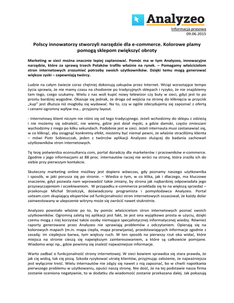 Informacja prasowa 09.06.2015 Polscy innowatorzy stworzyli narzędzie dla e-commerce. e commerce. Kolorowe plamy pomogą sklepom zwiększyć obroty Marketing w sieci można znacznie lepiej zaplanować. Pomóc ma w tym Analyzeo, Analyzeo innowacyjne narzędzie, które za sprawą trzech Polaków trafiło właśnie na rynek. – Pomagamy właścicielom stron internetowych zrozumieć potrzeby swoich użytkowników. Dzięki temu mogą generować większe zyski – zapewniają twórcy. raz chętniej dokonują zakupów przez Internet. Wciąż wzrastające tempo Ludzie na całym świecie coraz życia sprawia, że nie mamy czasu na chodzenie po tradycyjnych sklepach i ryzyko, że nie znajdziemy tam tego, czego szukamy. Wielu z nas woli kupić nowy telewizor czy buty w sieci, gdyż jest j to po prostu bardziej wygodne. Okazuje się jednak, że droga od wejścia na stronę do kliknięcia w przycisk „kup” jest dłuższa niż mogłoby się wydawać. Na to, czy w ogóle zdecydujemy się zapoznać z ofertą i cenami ogromny wpływ ma… przyjazny layout. - Internetowy klient niczym nie różni się od tego tradycyjnego. Jeżeli wchodzimy do sklepu z odzieżą i nie możemy się odnaleźć, nie wiemy, gdzie jest dział męski, a gdzie damski, często zmieszani wychodzimy z niego po kilku sekundach. Podobnie jest w sieci. Jeżeli internauta musi zastanawiać się, w co kliknąć, aby osiągnąć konkretny efekt, możemy być niemal pewni, że właśnie straciliśmy klienta – mówi Piotr Sobieszczak, jeden z twórców aplikacji Analyzeo służącej do badania zachowań użytkowników stron internetowych. etowych. Tę tezę potwierdza econsultancy.com, portal doradczy dla marketerów i pracowników e-commerce. e Zgodnie z jego informacjami aż 88 proc. internautów raczej nie wróci na stronę, która zraziła ich do siebie przy pierwszym kontakcie. Skuteczny marketing ng online możliwy jest dopiero wówczas, gdy poznamy naszego użytkownika i sposób, w jaki porusza się po stronie. – Wiedza o tym, w co klika, jak i dlaczego, ma kluczowe znaczenie, gdyż pozwala nam wprowadzić takie zmiany, by strona jak najbardziej odpowiadała odpowia jego przyzwyczajeniom i oczekiwaniom. W przypadku e-commerce e commerce przekłada się to na większą sprzedaż – przekonuje Michał Strzelczyk, doświadczony programista i pomysłodawca Analyzeo. Portal uxteam.com skupiający ekspertów od funkcjonalności stron internetowych internetowych oszacował, że każdy dolar zainwestowany w ulepszenie witryny może się zwrócić nawet stukrotnie. Analyzeo powstało właśnie po to, by pomóc właścicielom stron internetowych poznać swoich użytkowników. Ogromną zaletą tej aplikacji jest fakt, że jest ona wyjątkowo prosta w użyciu, dzięki czemu mogą z niej korzystać także osoby niemające specjalistycznej informatycznej wiedzy. Również raporty generowane przez Analyzeo nie sprawiają problemów z odczytaniem. Opierają się na kolorowych mapach (m.in. mapa ciepła, ciepła, mapa przewijania), przedstawiających informacje zgodnie z zasadą: im cieplejsza barwa, tym większy ruch. W ten sposób na pierwszy rzut oka widać, które miejsca na stronie cieszą się największym zainteresowaniem, a które są całkowicie pomijane. Wiadomo mo więc np., gdzie powinny się znaleźć najważniejsze informacje. Warto zadbać o funkcjonalność strony internetowej. W sieci bowiem sprawdza się stara prawda, że jak cię widzą, tak cię piszą. Szkoda ryzykować utratę klientów, przyjmując założenie, że najważniejsza najwa jest wyłącznie treść. Wielu internautów nie zdąży się nawet z nią zapoznać, bo w chwili napotkania pierwszego problemu w użytkowaniu, opuści naszą stronę. Nie dość, że na tej podstawie nasza firma firm zostanie oceniona negatywnie, to w dodatku zła wiadomość domość zostanie przekazana dalej. Jak pokazują badania, prawie 70 proc. użytkowników rezygnuje z zakupu w sklepie, którego strona zawiodła ich oczekiwania (źródło: smashingmagazine.com). Obecnie zaledwie nieco ponad połowa firm (55 proc.) sprawdza, czy strona strona jest intuicyjna dla użytkownika. Według raportu econsultancy.com ogromna większość z pozostałej połowy (73 proc.) zdecyduje się na ten krok w ciągu najbliższego roku. – Wyraźniee więc widać, że rynek podąża w kierunku analizowania i już wkrótce konieczność konieczność poznania użytkownika stanie się standardem prowadzenia jakiejkolwiek działalności w sieci – mówi Jakub Puczyłowski, dyrektor sprzedaży Analyzeo. - Często podkreślamy, jakie korzyści z zastosowania Analyzeo może odnieść sektor e-commerce. e Warto jednak pamiętać, że nasza aplikacja skierowana jest do wszystkich, którzy prowadzą stronę internetową, za pomocą której prezentują swoją ofertę.. Nie musi być to zatem strona, która bezpośrednio sprzedaje. Świadczyć może o tym fakt, że zainteresowanie naszym rozwiązaniem rozw wyraził jeden z wiodących polskich portali opinii. Prowadzimy właśnie rozmowy w tej sprawie. Analyzeo polecamy również osobom, które prowadzą np. bloga. Wiedząc, które miejsca na stronie generują największy ruch, będą mogły skuteczniej negocjować stawki reklamowe – wyjaśnia Piotr Sobieszczak. Analyzeo zdobyło dotychczas zaufanie kilkunastu marek. Z narzędzia korzystają m.in. ogólnopolska sieć Akademickich Inkubatorów Przedsiębiorczości czy PayLane, system płatności online. ExclusiveLights, internetowy towy sklep z nowoczesnymi lampami, wprowadził już nawet pierwsze poprawki w wyglądzie strony. Właściciel sklepu, Marcin Hoff, zapewnia, że odbiło się to korzystnie na sprzedaży. Analyzeo to polskie narzędzie do badania zachowań użytkowników stron internetowych. Pozwala sprawdzić m.in. w co klikają i jak przewijają treści. Dzięki temu każdy, kto prowadzi swoją stronę, może ją poprawić i dostosować do nawyków odwiedzających ją internautów. Takie rozwiąz
