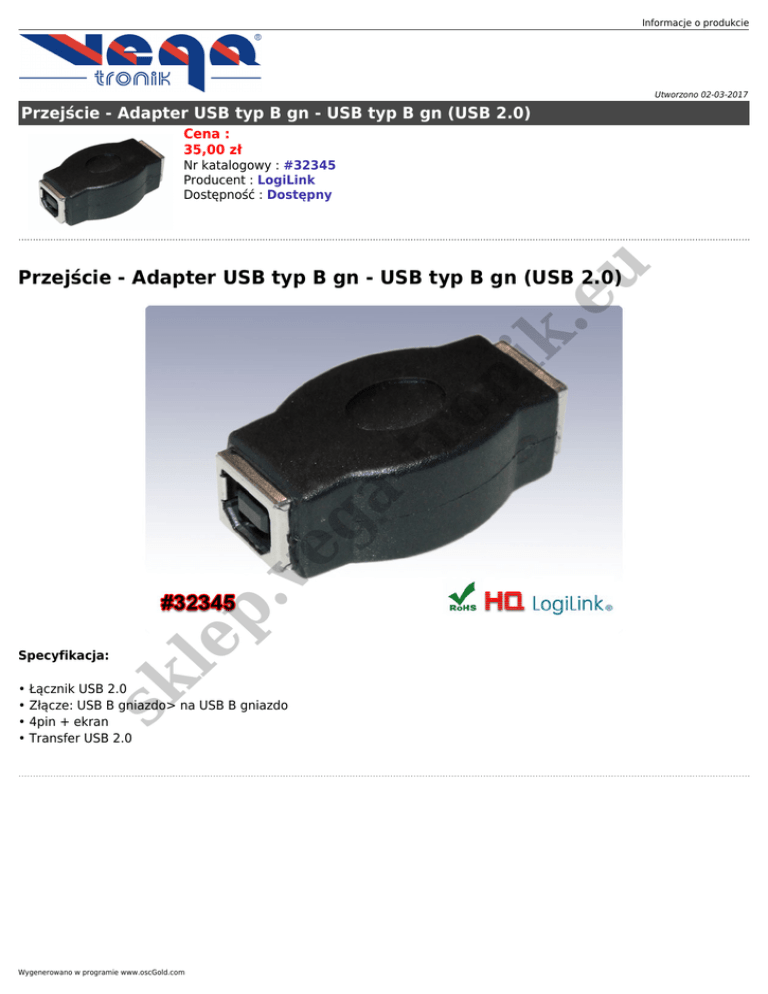 Informacje o produkcie Utworzono 02-03-2017 Przejście - Adapter USB typ B gn - USB typ B gn (USB 2.0) Cena : 35,00 zł eu Nr katalogowy : #32345 Producent : LogiLink Dostępność : Dostępny sk le p. ve g atr on i k. Przejście - Adapter USB typ B gn - USB typ B gn (USB 2.0) Specyfikacja: • Łącznik USB 2.0 • Złącze: USB B gniazdo> na USB B gniazdo • 4pin + ekran • Transfer USB 2.0 Wygenerowano w programie www.oscGold.com