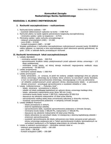 Stalowa Wola 19.07.2011r. Komunikat Zarządu Nadsańskiego Banku Spółdzielczego ROZDZIAŁ I. KLIENCI INDYWIDUALNI I. Rachunki oszczędnościowo – rozliczeniowe 1. Rachunek Konto osobiste – VIP: - wysokość deklarowanych wpływów na konto – 3 000 PLN 2. Rachunek płatny na kaŜde Ŝądanie potwierdzone ksiąŜeczką oszczędnościową: - minimalna wpłata i saldo na ksiąŜeczce – 10 PLN 3. Minimalna wpłata i saldo rachunku prowadzonego w: - dolarach amerykańskich (USD) – 10 USD - euro (EUR) – 10 EUR - funtach brytyjskich (GBP) – 10 GBP 4. Wypłaty gotówkowe z rachunków oszczędnościowo rozliczeniowych powyŜej kwoty 30.000PLN naleŜy zgłaszać, co najmniej w dniu poprzedzającym dzień dokonania operacji gotówkowej do godz. 13.00. w oddziale Banku prowadzącym rachunek II. Rachunki terminowych lokat oszczędnościowych 1. Lokaty standard: - minimalna wartość lokaty - 500 PLN 2. 3. 4. 5. 6. - oprocentowanie środków lokaty podejmowanych przed upływem okresu umownego – 1/5 stopy podstawowej - minimalna kwota lokaty, od której istnieje moŜliwość negocjowania wielkości stopy procentowej - 50 000 PLN Lokaty progresywne: - minimalna wartość lokaty– 1 000 PLN Lokaty promocyjne: - lokaty odnawialne , co oznacza, Ŝe jeŜeli nie zostaną podjęte następnego dnia po upływie okresu umownego, odnawiają się na kolejny okres umowny na warunkach Lokaty Standard, w tym na warunkach oprocentowania zmiennego, obowiązującego w dniu jej odnowienia - od wkładów podejmowanych przed upływem okresu obowiązywania lokaty - w pierwszym okresie umownym - przysługuje oprocentowanie w wysokości wkładów a`vista. Lokaty krótkoterminowe – „ Podwójny Zysk”: - lokata otwierana i prowadzona w złotych, - odsetki od lokaty podlegają kapitalizacji po upływie okresu umownego kaŜdego dnia, - lokata odnawiana maksymalnie przez okres 365 dni (1rok), - minimalna kwota lokaty wynosi 1 000 PLN, maksymalna 20 000 PLN - dopuszcza się załoŜenie maksymalnie 10 lokat przez Klienta, - oprocentowana według stałej stopy procentowej naliczanej w stosunku rocznym, - wysokość oprocentowania podawana w odrębnej Uchwale Zarządu Lokata SANBank Premium: - lokata prowadzona w złotych, - dzienna kapitalizacja odsetek, - oprocentowanie stałe, wysokość oprocentowania podawana w Uchwale Zarządu, - minimalna kwota lokaty 2 000,00 Pln, maksymalna 17 000,00 Pln, - dopuszcza się załoŜenie maksymalnie 20 lokat przez Klienta, - lokata odnawiana na warunkach lokaty 12-miesięcznej z dzienną kapitalizacją odsetek i zmiennym oprocentowaniem, - wysokość oprocentowania dla lokaty odnowionej oraz lokaty zerwanej przed upływem okresu umownego podawana jest w Tabeli oprocentowania środków zgromadzonych na rachunkach bankowych w Pln będącej załącznikiem do Uchwały Zarządu. Lokaty w walutach wymienialnych – minimalne wartości lokat w: - dolarach amerykańskich (USD) – 100 USD - euro (EUR) – 100 EUR - funtach brytyjskich (GBP) – 100 GBP 1 7. Bank ustala następujące terminy przyjmowania lokat terminowych w walutach wymienialnych – 1, 3, 6, 12, 24 miesiące. 8. Warunki prowadzenia lokat w PLN będących nierezydentami – terminy, stawki oprocentowania, okresy kapitalizacji zgodnie z regulacjami lokat terminowych dla osób fizycznych będących rezydentami. III. Wysokość dziennych limitów transakcyjnych dla kart płatniczych i kredytowych: 1. VISA CLASSIC DEBETOWA: - dla kart wydawanych do rachunków konto osobiste standard, E - Konto osobiste, konto osobiste - Senior, konto osobiste Student, konto osobiste Junior • do wysokości salda rachunku, nie więcej niŜ 5 000 PLN – maksymalny dzienny limit wypłat gotówki • do wysokości salda rachunku, nie więcej niŜ 20 000 PLN – maksymalny dzienny limit transakcyjny - dla kart wydanych do rachunków konto osobiste VIP • do wysokości salda rachunku, nie więcej niŜ 10 000 PLN –maksymalny dzienny limit wypłaty gotówki • do wysokości salda rachunku, nie więcej niŜ 50 000 PLN –maksymalny dzienny limit transakcyjny 2. VISA KREDYTOWA: - minimalna kwota limitu kredytowego - 1 000 PLN - maksymalna kwota limitu kredytowego – 20 000 PLN - dzienna maksymalna kwota wypłaty gotówki – 2 000 PLN - dzienny maksymalny limit transakcyjny – do wysokości limitu nie więcej niŜ 20 000 PLN ROZDZIAŁ II. KLIENCI INSTYTUCJONALNI I. Rachunki lokat terminowych dla klientów instytucjonalnych 1. Oprocentowanie środków lokaty terminowej w walucie wymienialnej podejmowanych przed upływem okresu umownego - 1/5 stopy podstawowej 2. Minimalna kwota lokaty, od której istnieje moŜliwość negocjowania wielkości stopy procentowej – 50 000 PLN II. Wysokość dziennych limitów transakcyjnych dla kart płatniczych: VISA BUSINESS DEBETOWA - dla transakcji gotówkowych – 30 000 PLN - dla transakcji bezgotówkowych – 50 000 PLN III. Wypłaty gotówkowe z rachunków powyŜej kwoty 30 000 PLN naleŜy zgłaszać, co najmniej w dniu poprzedzającym dzień dokonania operacji gotówkowej do godz. 13.00. w oddziale Banku prowadzącym rachunek IV. Maksymalna kwota dopuszczalnego debetu w rachunku wynosi – 2 000 PLN V. Pakiety 1. Dla przedsiębiorców prowadzących działalność gospodarczą: - Pakiet Startbiznes* - Pakiet Biznes Komfort - Pakiet Biznes Premium * warunki Pakietu Startbiznes: - dla podmiotów gospodarczych, które prowadzą działalność nie dłuŜej niŜ 12 miesięcy - z pakietu klient moŜe korzystać nie dłuŜej niŜ 12 miesięcy; po upływie 12 miesięcy jeŜeli klient nie zdecyduje inaczej - pakiet zostanie przekształcony na rachunek rozliczeniowy na zasadach ogólnych 2. Dla przedsiębiorców prowadzących działalność rolniczą: - Pakiet Agrobiznes 3. Dla Wspólnot Mieszkaniowych - Pakiet Wspólny Dom - Pakiet Wspólny Dom Plus 4. Dla innych podmiotów niekomercyjnych - Pakiet Partner 2 ROZDZIAŁ III. POZOSTAŁE USTALENIA 1. Rachunki osób małoletnich i ubezwłasnowolnionych 2. 3. 4. 5.