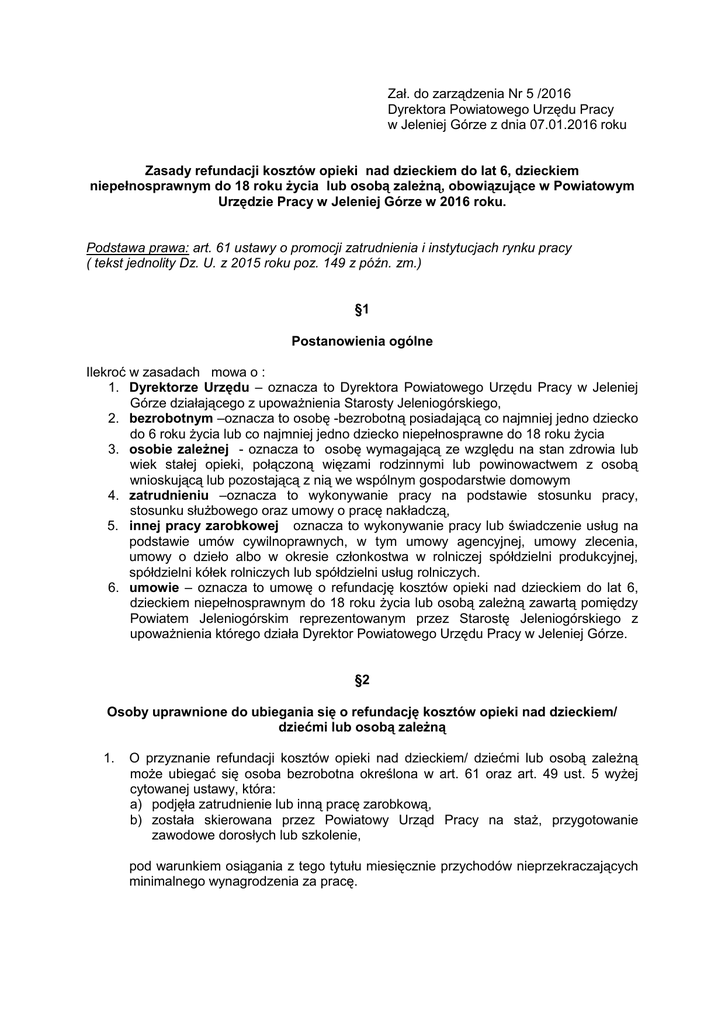 Zał. do zarządzenia Nr 5 /2016 Dyrektora Powiatowego Urzędu Pracy w Jeleniej Górze z dnia 07.01.2016 roku Zasady refundacji kosztów opieki nad dzieckiem do lat 6, dzieckiem niepełnosprawnym do 18 roku życia lub osobą zależną, obowiązujące w Powiatowym Urzędzie Pracy w Jeleniej Górze w 2016 roku. Podstawa prawa: art. 61 ustawy o promocji zatrudnienia i instytucjach rynku pracy ( tekst jednolity Dz. U. z 2015 roku poz. 149 z późn. zm.) §1 Postanowienia ogólne Ilekroć w zasadach mowa o : 1. Dyrektorze Urzędu – oznacza to Dyrektora Powiatowego Urzędu Pracy w Jeleniej Górze działającego z upoważnienia Starosty Jeleniogórskiego, 2. bezrobotnym –oznacza to osobę -bezrobotną posiadającą co najmniej jedno dziecko do 6 roku życia lub co najmniej jedno dziecko niepełnosprawne do 18 roku życia 3. osobie zależnej - oznacza to osobę wymagającą ze względu na stan zdrowia lub wiek stałej opieki, połączoną więzami rodzinnymi lub powinowactwem z osobą wnioskującą lub pozostającą z nią we wspólnym gospodarstwie domowym 4. zatrudnieniu –oznacza to wykonywanie pracy na podstawie stosunku pracy, stosunku służbowego oraz umowy o pracę nakładczą, 5. innej pracy zarobkowej oznacza to wykonywanie pracy lub świadczenie usług na podstawie umów cywilnoprawnych, w tym umowy agencyjnej, umowy zlecenia, umowy o dzieło albo w okresie członkostwa w rolniczej spółdzielni produkcyjnej, spółdzielni kółek rolniczych lub spółdzielni usług rolniczych. 6. umowie – oznacza to umowę o refundację kosztów opieki nad dzieckiem do lat 6, dzieckiem niepełnosprawnym do 18 roku życia lub osobą zależną zawartą pomiędzy Powiatem Jeleniogórskim reprezentowanym przez Starostę Jeleniogórskiego z upoważnienia którego działa Dyrektor Powiatowego Urzędu Pracy w Jeleniej Górze. §2 Osoby uprawnione do ubiegania się o refundację kosztów opieki nad dzieckiem/ dziećmi lub osobą zależną 1. O przyznanie refundacji kosztów opieki nad dzieckiem/ dziećmi lub osobą zależną może ubiegać się osoba bezrobotna określona w art. 61 oraz art. 49 ust. 5 wyżej cytowanej ustawy, która: a) podjęła zatrudnienie lub inną pracę zarobkową, b) została skierowana przez Powiatowy Urząd Pracy na staż, przygotowanie zawodowe dorosłych lub szkolenie, pod warunkiem osiągania z tego tytułu miesięcznie przychodów nieprzekraczających minimalnego wynagrodzenia za pracę. §3 Postępowanie przy ubieganiu się o zawarcie umowy o refundacje kosztów opieki nad dzieckiem lub osobą zależną 1. Podstawą ubiegania się o zwrot kosztów opieki nad dzieckiem / dziećmi lub osobą zależną jest złożenie przez osobę wskazaną w §2 ust. 1 niniejszych zasad wniosku ( zał. nr 1 ) wraz z następującymi dokumentami: a) kserokopią umowy o pracę, umowy cywilno- prawnej itp. (oryginał do wglądu), potwierdzającą podjęcie zatrudnienia lub innej pracy zarobkowej, b) dokument potwierdzający sprawowanie opieki tj. - w przypadku opieki nad dzieckiem/ dziećmi do 6 roku życia – akt urodzenia - w przypadku posiadania dziecka lub dzieci niepełnosprawnych do 18 roku życia – orzeczenie o stopniu niepełnosprawności, - w przypadku opieki nad osobą zależną – orzeczenie o niepełnosprawności oraz dokument potwierdzający stopień pokrewieństwa lub powinowactwa 2. Ilość zawartych w danym roku umów o refundację kosztów opieki nad dzieckiem/ dziećmi lub osobą zależną uzależniona jest od ilości środków będących w dyspozycji Urzędu na ten cel. 3. Wniosek o zwrot kosztów opieki nad dzieckiem/ dziećmi lub osobą zależną wraz z kompletem dokumentów podlega rozpatrzeniu w terminie 30 dni od daty złożenia kompletnego wniosku wraz z załącznikami. 4. Wniosek o zwrot kosztów opieki należy składać w terminie 14 dni od daty podjęcia zatrudnienia, innej pracy zarobkowej, stażu, przygotowania zawodowego dorosłych, szkolenia, pod rygorem negatywnego rozpatrzenia wniosku. 5. Podstawą refundacji jest umowa zawarta pomiędzy Powiatem Jeleniogórskim reprezentowanym przez Starostę Jeleniogórskiego z upoważnienia którego działa Dyrektor Powiatowego Urzędu Pracy w Jeleniej Górze a wnioskodawcą. §4 Warunki refundacji kosztów opieki nad dzieckiem / dziećmi lub osobą zależną 1. Refundacja dokonywana jest na podstawie składanych w Urzędzie comiesięcznych druków rozliczeń ( zał. nr 2 ) wraz z następującymi załącznikami: a) dokumentem potwierdzającym poniesione koszty z tytułu opieki na dzieckiem/ dziećmi ( zaświadczenie o uiszczeniu opłaty, rachunek za przedszkole/ żłobek, dowody wpłaty) lub osobą zależną, b) oświadczeniem o dochodach. 2. Dokumenty, o których mowa w ust. 1 należy złożyć do 5-go dnia każdego następnego miesiąca za miesiąc poprzedni. 3. Niedostarczenie dokumentów w terminie wskazanym w ust. 2 może spowodować odmowę dokonania refundacji za dany miesiąc. 4. Refundacji podlega 100% udokumentowanych kosztów, jednak nie więcej niż 50% zasiłku dla bezrobotnych, o którym mowa w art. 72 ust. 1 pkt 1 ustawy, na każde dziecko, na opiekę którego poniesiono koszty. 5. Refundacji poniesionych kosztów opieki nad dzieckiem/ dziećmi dokonuje się na wniosek osoby uprawnionej przez okres: a) do 6 miesięcy w przypadku podjęcia zatrudnienia lub innej pracy zarobkowej, b) odbywania stażu, przygotowania zawodowego dorosłych lub szkolenia. 6. Refundacja dokonywana jest w okresach miesięcznych z dołu i może być przekazana na rachunek osobisty wnioskodawcy wskazany we wniosku lub wypłacona w kasie Powiatowego Urzędu Pracy. 7. Refundacja kosztów opieki nad dzieckiem/ dziećmi lub osobą zależną przysługuje wyłącznie za okres faktycznego trwania zatrudnienia/ innej pracy zarobkowej, stażu, przygotowania zawodowego lub szkolenia, jak również za dni nieobecności usprawiedliwionej ( zwolnienie lekarskie – druk ZUS ZLA) 8. Refundację za niepełny miesiąc ustala się dzieląc kwotę r
