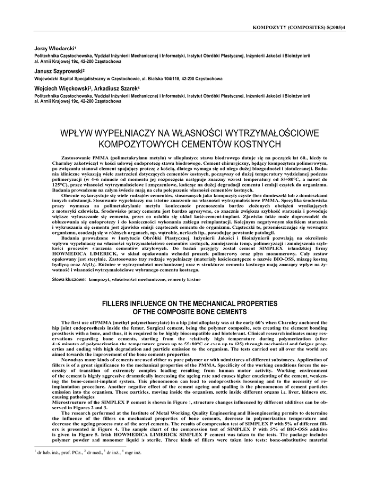 KOMPOZYTY (COMPOSITES) 5(2005)4 Jerzy Włodarski1 Politechnika Częstochowska, Wydział Inżynierii Mechanicznej i Informatyki, Instytut Obróbki Plastycznej, Inżynierii Jakości i Bioinżynierii al. Armii Krajowej 19c, 42-200 Częstochowa Janusz Szyprowski2 Wojewódzki Szpital Specjalistyczny w Częstochowie, ul. Bialska 104/118, 42-200 Częstochowa Wojciech Więckowski3, Arkadiusz Szarek4 Politechnika Częstochowska, Wydział Inżynierii Mechanicznej i Informatyki, Instytut Obróbki Plastycznej, Inżynierii Jakości i Bioinżynierii al. Armii Krajowej 19c, 42-200 Częstochowa WPŁYW WYPEŁNIACZY NA WŁASNOŚCI WYTRZYMAŁOŚCIOWE KOMPOZYTOWYCH CEMENTÓW KOSTNYCH Zastosowanie PMMA (polimetakrylanu metylu) w alloplastyce stawu biodrowego datuje się na początek lat 60., kiedy to Charnley zakotwiczył w kości udowej endoprotezę stawu biodrowego. Cement chirurgiczny, będący kompozytem polimerowym, po związaniu stanowi element spajający protezę z kością, dlatego wymaga się od niego dużej biozgodności i biotolerancji. Badania kliniczne wykazują wiele zastrzeżeń dotyczących cementów kostnych, począwszy od dużej temperatury wydzielanej podczas polimeryzacji (w 4÷6 minucie od momentu jej rozpoczęcia następuje znaczny wzrost temperatury od 55÷80°C, a nawet do 125°C), przez własności wytrzymałościowe i zmęczeniowe, kończąc na dużej degradacji cementu i emisji cząstek do organizmu. Badania prowadzone na całym świecie mają na celu polepszenie własności cementów kostnych. Obecnie wykorzystuje się wiele rodzajów cementów, stosowanych jako kompozyty czyste (bez domieszek) lub z domieszkami innych substancji. Stosowanie wypełniaczy ma istotne znaczenie na własności wytrzymałościowe PMMA. Specyfika środowiska pracy wymusza na polimetakrylanie metylu konieczność przenoszenia bardzo złożonych obciążeń wynikających z motoryki człowieka. Środowisko pracy cementu jest bardzo agresywne, co znacznie zwiększa szybkość starzenia i powoduje większe wyłuszczanie się cementu, przez co osłabia się układ kość-cement-implant. Zjawisko takie może doprowadzić do obluzowania się endoprotezy i do konieczności wykonania zabiegu reimplantacji. Kolejnym negatywnym skutkiem starzenia i wykruszania się cementu jest zjawisko emisji cząsteczek cementu do organizmu. Cząsteczki te, przemieszczając się wewnątrz organizmu, osadzają się w różnych organach, np. wątrobie, nerkach itp., powodując powstanie patologii. Badania prowadzone w Instytucie Obróbki Plastycznej, Inżynierii Jakości i Bioinżynierii pozwalają na określenie wpływu wypełniaczy na własności wytrzymałościowe cementów kostnych, zmniejszenia temp. polimeryzacji i zmniejszenia szybkości procesów starzenia cementów akrylowych. Do badań przyjęty został cement SIMPLEX irlandzkiej firmy HOWMEDICA LIMERICK, w skład opakowania wchodzi proszek polimerowy oraz płyn monomerowy. Cały zestaw opakowany jest sterylnie. Zastosowano trzy rodzaje wypełniaczy (materiały kościozastępcze o nazwie BIO-OSS, miazgę kostną bydlęcą oraz Al2O3). Różnice w wytrzymałości mechanicznej oraz w strukturze cementu kostnego mają znaczący wpływ na żywotność i własności wytrzymałościowe wybranego cementu kostnego. Słowa kluczowe: kompozyt, właściwości mechaniczne, cementy kostne FILLERS INFLUENCE ON THE MECHANICAL PROPERTIES OF THE COMPOSITE BONE CEMENTS The first use of PMMA (methyl polymethacrylate) in a hip joint alloplasty was at the early 60’s when Charnley anchored the hip joint endoprosthesis inside the femur. Surgical cement, being the polymer composite, sets creating the element bonding prosthesis with a bone, and thus, it is required to be highly biocompatible and biotolerant. Clinical research indicates many reservations regarding bone cements, starting from the relatively high temperature during polymerization (after 4÷6 minutes of polymerization the temperature grows up to 55÷80°C or even up to 125) through mechanical and fatigue properties and ending with high degradation and particle emission to the organism. The tests carried out all over the world are aimed towards the improvement of the bone cements properties. Nowadays many kinds of cements are used either as pure polymer or with admixtures of different substances. Application of fillers is of a great significance to the mechanical properties of the PMMA. Specificity of the working conditions forces the necessity of transition of extremely complex loading resulting from human motor activity. Working environment of the cement is highly aggressive dramatically increasing the ageing rate and causes higher enucleating of the cement, weakening the bone-cement-implant system. This phenomenon can lead to endoprosthesis loosening and to the necessity of reimplantation procedure. Another negative effect of the cement ageing and spalling is the phenomenon of cement particles emission into the organism. These particles, moving inside the organism, settle inside different organs i.e. liver, kidneys etc. causing pathologies. Microstructure of the SIMPLEX P cement is shown in Figure 1, structure changes influenced by different additives can be observed in Figures 2 and 3. The research performed at the Institute of Metal Working, Quality Engineering and Bioengineering permits to determine the influence of the fillers on mechanical properties of bone cements, decrease in polymerization temperature and decrease the ageing process rate of the acryl cements. The results of compression test of SIMPLEX P with 5% of different fillers is presented in Figure 4. The sample chart of the compression test of SIMPLEX P with 5% of BIO-OSS additive is given in Figure 5. Irish HOWMEDICA LIMERICK SIMPLEX P cement was taken to the tests. The package includes polymer powder and monomer liquid is sterile. Three kinds of fillers were taken into tests: bone-substitutive material 1 dr hab. inż., prof. PCz., 2 dr med., 3 dr inż., 4 mgr in