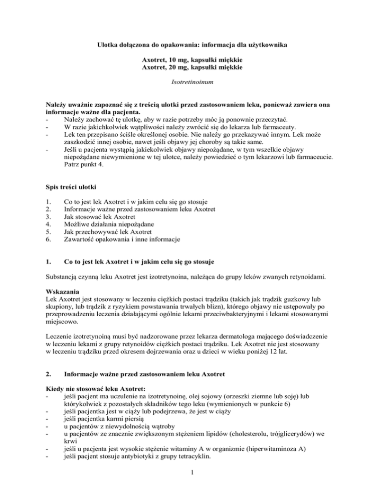 Ulotka dołączona do opakowania: informacja dla użytkownika Axotret, 10 mg, kapsułki miękkie Axotret, 20 mg, kapsułki miękkie Isotretinoinum Należy uważnie zapoznać się z treścią ulotki przed zastosowaniem leku, ponieważ zawiera ona informacje ważne dla pacjenta. Należy zachować tę ulotkę, aby w razie potrzeby móc ją ponownie przeczytać. W razie jakichkolwiek wątpliwości należy zwrócić się do lekarza lub farmaceuty. Lek ten przepisano ściśle określonej osobie. Nie należy go przekazywać innym. Lek może zaszkodzić innej osobie, nawet jeśli objawy jej choroby są takie same. Jeśli u pacjenta wystąpią jakiekolwiek objawy niepożądane, w tym wszelkie objawy niepożądane niewymienione w tej ulotce, należy powiedzieć o tym lekarzowi lub farmaceucie. Patrz punkt 4. Spis treści ulotki 1. 2. 3. 4. 5. 6. Co to jest lek Axotret i w jakim celu się go stosuje Informacje ważne przed zastosowaniem leku Axotret Jak stosować lek Axotret Możliwe działania niepożądane Jak przechowywać lek Axotret Zawartość opakowania i inne informacje 1. Co to jest lek Axotret i w jakim celu się go stosuje Substancją czynną leku Axotret jest izotretynoina, należąca do grupy leków zwanych retynoidami. Wskazania Lek Axotret jest stosowany w leczeniu ciężkich postaci trądziku (takich jak trądzik guzkowy lub skupiony, lub trądzik z ryzykiem powstawania trwałych blizn), którego objawy nie ustępowały po przeprowadzeniu leczenia działającymi ogólnie lekami przeciwbakteryjnymi i lekami stosowanymi miejscowo. Leczenie izotretynoiną musi być nadzorowane przez lekarza dermatologa mającego doświadczenie w leczeniu lekami z grupy retynoidów ciężkich postaci trądziku. Lek Axotret nie jest stosowany w leczeniu trądziku przed okresem dojrzewania oraz u dzieci w wieku poniżej 12 lat. 2. Informacje ważne przed zastosowaniem leku Axotret Kiedy nie stosować leku Axotret: jeśli pacjent ma uczulenie na izotretynoinę, olej sojowy (orzeszki ziemne lub soję) lub którykolwiek z pozostałych składników tego leku (wymienionych w punkcie 6) jeśli pacjentka jest w ciąży lub podejrzewa, że jest w ciąży jeśli pacjentka karmi piersią u pacjentów z niewydolnością wątroby u pacjentów ze znacznie zwiększonym stężeniem lipidów (cholesterolu, trójglicerydów) we krwi jeśli u pacjenta jest wysokie stężenie witaminy A w organizmie (hiperwitaminoza A) jeśli pacjent stosuje antybiotyki z grupy tetracyklin. 1 Ostrzeżenia i środki ostrożności Przed rozpoczęciem stosowania leku Axotret należy omówić to z lekarzem lub farmaceutą. Ważne Izotretynoina ma działanie teratogenne. Oznacza to, że uszkadza płód i zwiększa ryzyko poronienia. Nie należy stosować leku Axotret, jeśli pacjentka jest w ciąży lub może zajść w ciążę w którymkolwiek momencie leczenia oraz w okresie jednego miesiąca po zakończeniu leczenia. Pacjentki w wieku rozrodczym mogą przyjmować lek Axotret wyłącznie, jeśli: - - - - - - U pacjentki występuje ciężka postać trądziku (trądzik guzkowy lub skupiony, lub trądzik z ryzykiem powstawania trwałych blizn), którego objawy nie ustępowały po leczeniu działającymi ogólnie lekami przeciwbakteryjnymi i lekami stosowanymi miejscowo. Lekarz prowadzący wyjaśnił pacjentce na czym polega działanie teratogenne izotretynoiny. Pacjentka rozumie, dlaczego nie może zajść w ciążę oraz jak zapobiec zajściu w ciążę. Pacjentka omówiła z lekarzem prowadzącym stosowanie skutecznej antykoncepcji; lekarz prowadzący przekaże pacjentce informacje dotyczące zapobiegania ciąży, w tym broszurę na temat antykoncepcji opisującą różne metody antykoncepcji. Lekarz prowadzący może skierować pacjentkę do specjalisty w celu zasięgnięcia porady na temat antykoncepcji. Pacjentka zgadza się na stosowanie przynajmniej jednej, a najlepiej dwóch, skutecznych metod antykoncepcyjnych przez okres jednego miesiąca przed rozpoczęciem leczenia izotretynoiną, w trakcie leczenia oraz przez okres jednego miesiąca po zakończeniu leczenia. Przed rozpoczęciem leczenia lekarz prowadzący zaleci wykonanie testu ciążowego, którego wynik musi być negatywny. Pacjentka stosuje skuteczną antykoncepcję nawet, jeśli nie występują u niej miesiączki lub nie jest aktualnie aktywna seksualnie, chyba że lekarz prowadzący stwierdzi, że nie ma takiej konieczności. Pacjentka rozumie i akceptuje konieczność regularnego przeprowadzania kontroli lekarskiej co miesiąc i testów ciążowych według zaleceń lekarza prowadzącego. Pacjentka będzie musiała wykonać test ciążowy po upłynięciu 5 tygodni od zakończenia leczenia izotretynoiną. Pacjentka nie może zajść w ciążę w którymkolwiek momencie leczenia ani przez okres jednego miesiąca po zakończeniu leczenia. Lekarz prowadzący może poprosić pacjentkę (lub jej opiekuna) o podpisanie oświadczenia, w którym pacjentka potwierdzi, że została poinformowana o zagrożeniach, jakie niesie ze sobą leczenie izotretynoiną oraz, że pacjentka akceptuje konieczność zachowania odpowiednich środków bezpieczeństwa. Jeśli pacjentka zajdzie w ciążę w trakcie leczenia izotretynoiną lub w okresie jednego miesiąca po zakończeniu leczenia, musi natychmiast zaprzestać stosowania leku i skontaktować się z lekarzem prowadzącym. Lekarz prowadzący skieruje pacjentkę do specjalisty, w celu przeprowadzenia badań i uzyskania porady. Pisemną informację na ten temat można otrzymać od lekarza prowadzącego. Jeśli pacjentka nie otrzymała tych materiałów, powinna skontaktować się ze swoim lekarzem prowadzącym. Recepty dla kobiet w wieku rozrodczym są ograniczone do ilości wystarczającej na 30 dni leczenia. Kontynuowanie leczenia wymaga ponownego wypisania recepty, a każda recepta jest ważna tylko przez siedem dni. Mężczyźni 2 Leczenie izotretynoiną nie ma szkodliwego wpływu na spermę. Izotretynoina i jej metabolity występują w nasieniu