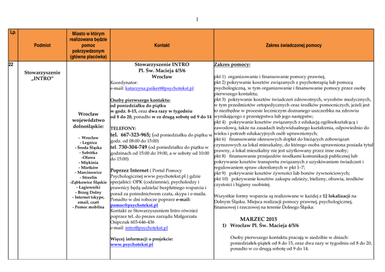1 Lp. Podmiot 22 Stowarzyszenie „INTRO” Miasto w którym realizowana będzie pomoc pokrzywdzonym (główna placówka) Kontakt Stowarzyszenie INTRO Pl. Św. Macieja 4/5/6 Wrocław Zakres świadczonej pomocy Zakres pomocy: pkt 1) organizowanie i finansowanie pomocy prawnej, pkt 2) pokrywanie kosztów związanych z psychoterapią lub pomocą psychologiczną, w tym organizowanie i finansowanie pomocy przez osobę pierwszego kontaktu; pkt 3) pokrywanie kosztów świadczeń zdrowotnych, wyrobów medycznych, Osoby pierwszego kontaktu: w tym przedmiotów ortopedycznych oraz środków pomocniczych, jeŜeli jest od poniedziałku do piątku to niezbędne w procesie leczniczym doznanego uszczerbku na zdrowiu w godz. 8-15, oraz dwa razy w tygodniu Wrocław od 8 do 20, ponadto w co drugą sobotę od 9 do 14 wynikającego z przestępstwa lub jego następstw; województwo pkt 4) pokrywanie kosztów związanych z edukacją ogólnokształcącą i dolnośląskie: TELEFONY: zawodową, takŜe na zasadach indywidualnego kształcenia, odpowiednio do tel. 667-323-965; (od poniedziałku do piątku w wieku i potrzeb edukacyjnych osób uprawnionych; - Wrocław pkt 6) finansowanie okresowych dopłat do bieŜących zobowiązań godz. od 08:00 do 15:00) - Legnica czynszowych za lokal mieszkalny, do którego osoba uprawniona posiada tytuł tel. 730-304-749 (od poniedziałku do piątku w - Środa Śląska prawny, a lokal mieszkalny nie jest uŜytkowany przez inne osoby; - Sobótka godzinach od 15:00 do 19:00, a w soboty od 10:00 pkt 8) finansowanie przejazdów środkami komunikacji publicznej lub -Oława do 15:00) pokrywanie kosztów transportu związanych z uzyskiwaniem świadczeń i - Miękinia - Mietków regulowaniem spraw określonych w pkt 1–7; Poprzez Internet ( Portal Pomocy - Marcinowice pkt 9) pokrywanie kosztów Ŝywności lub bonów Ŝywnościowych; Psychologicznej www.psychotekst.pl ) gdzie - Strzelin pkt 10) pokrywanie kosztów zakupu odzieŜy, bielizny, obuwia, środków -Ząbkowice Śląskie specjaliści: OPK (codziennie), psycholodzy i czystości i higieny osobistej. - Łagiewniki prawnicy będą udzielać bezpłatnego wsparcia i - Brzeg Dolny porad za pośrednictwem czata, skypa i e-maila. Wszystkie formy wsparcia są realizowane w kaŜdej z 12 lokalizacji na - Internet (skype, Ponadto w dni robocze poprzez e-mail: Dolnym Śląsku. Miejsca realizacji pomocy prawnej, psychologicznej, email, czat) - Pomoc mobilna [email protected] finansowej i rzeczowej na terenie Dolnego Śląska: Kontakt ze Stowarzyszeniem Intro równieŜ poprzez tel. do prezes zarządu Małgorzata MARZEC 2015 Osipczuk 603-646-436 1) Wrocław Pl. Św. Macieja 4/5/6 e-mail: [email protected] Koordynator: e-mail: [email protected] Więcej informacji o projekcie: www.psychotekst.pl Osoby pierwszego kontaktu pracują w siedzibie w dniach: poniedziałek-piątek od 8 do 15, oraz dwa razy w tygodniu od 8 do 20, ponadto w co drugą sobotę od 9 do 14. 2 Psycholodzy: Poniedziałek Od 14:00 do 20:00 02.03.2015 09.03.2015 16.03.2015 23.03.2015 30.03.2015 Wtorek Od 10:00 do 20:00 03.03.2015 10.03.2015 17.03.2015 24.03.2015 Od 10:00 do 15:00 31.03.2015 Piątek Od 13:30 do 18:30 13.03.2015 27.03.2015 Sobota: Od 10:00 do 14:00 14.03.2015 Prawnik: Wtorek: Od 16:00 do 21:00 03.03.2015 10.03.2015 17.03.2015 24.03.2015 31.03.2015 Środa: Od 16:00 do 21:00 3 04.03.2015 11.03.2015 18.03.2015 25.03.2015 Sobota: Od 10:00 do 14:00 28.03.2015 2) Legnica Rynek 5/11, siedziba Towarzystwa Miłośników Legnicy Psycholog: Środa: Od 14:30 do 17:30 04.03.2015 Od 15:30 do 18:30 18.03.2015 Od 09:00 do 15:00 11.03.2015 Od 09:00 do 14:00 25.03.2015 Prawnik: Środa: Od 17:00 do 20:00 18.03.2015 25.03.2015 Sobota: Od 09:00 do 14:00 21.03. 2015 28.03. 2015 3) Marcinowice Mysłaków, ul. Tuwima 2, 58-124 Marcinowice, Urząd Gminy Marcinowice Psycholog Wtorek 4 Od 13:00 do 17:00 10.03.2015 Od 13:00 do 15:00 24.03.2015 Prawnik Czwartek Od 15:30 do 19:30 05.03.2015 4) Strzelin ul. Mickiewicza 8, lokal uŜytkowy z zasobów Urzędu Miasta i Gminy Strzelin Psycholog: Środa Od 09:15 do 12:15 04.03.2015 11.03.2015 18.03.2015 25.03.2015 Prawnik: Czwartek: Od 15:00 do 19:00 12.03.2015 19.03.2015 26.03.2015 5) Oława ul. Chrobrego 23 B, Niepubliczny Zakład Opieki Zdrowotnej Oławskie Centrum Medyczne "OMEGA" Psycholog Poniedziałek Od 15:00 do 16:00 i od 19:00 do 21:00 02.03.2015 Od 14:00 do 16:00 i od 19:00 do 20:00 09.03.2015 Od 15:00 do 16:00 i od 19:00 do 21:00 16.03.2015 Od 14:00 do 16:00 i od 19:00 do 20:00 5 23.03.2015 Od 15:00 do 16:00 i od 19:00 do 21:00 30.03.2015 Prawnik: Środa Od 15:30 do 19:30 11.03.2015 6) Ząbkowice Śląskie ul. 1 Maja 15C, siedziba Centrum Terapeutycznego Psycholog Środa Od 16:15 do 20:15 04.03.2015 Prawnik Poniedziałek Od 15:30 do 19:30 23.03.2015 7) Sobótka ul. Strzelców 2/1, pomieszczenia wyodrębnione w Ośrodku Pomocy Społecznej w Sobótce Psycholog Czwartek Od 09:00 do 10:00 05.03.2015 12.03.2015 19.03.2015 26.03.2015 Sobota: Od 10:00 do 12:00 14.03.2015 28.03.2015 Prawnik Wtorek 6 Od 15:30 do 19:30 10.03.2015 8) Środa Śląska Plac Wolności 4, lokal Urzędu Miasta i Gminy Środa Śląska Psycholog Piątek Od 14.00 do 18.00 13.03.2015 27.03.2015 Prawnik Czwartek Od 15:00 do 19:00 19.03.2015 Od 09:00 do 13:00 26.03.2015 9) Łagiewniki ul. Sportowa 10, przy Gminnym Ośrodku Pomocy Społecznej Psycholog: Czwartek Od 16:30 do 18:30 05.03.2015 12.03.2015 19.03.2015 26.03.2015 Prawnik Poniedziałek Od 15:30 do 19:30 09.03.2015 10) Miękinia Gminny Ośrodek Pomocy Społecznej, ul. Kościuszki 41 Psycholog: 7 Piątek Od 09:00 do 13:00 13.03.2015 Prawnik Czwartek Od 10:00 do 14:00 19.03.2015 11) Brzeg Dolny Gminny Ośrodek Pomocy Społecznej, ul. Rynek 18 Psycholog Piątek Od 14:00 do 18:00 06.03.2015 20.03.2015 Prawnik Środa Od 09:00 do 13:00 04.03.2015 Od 14:00 do 18:00 18.03.2015 12) Mietków Milin, ul. Chłopska 9, w świetlicy wiejskiej Psycholog Sobota Od 12:30 do 16:30 14.03.2015 28.03.2015 Prawnik Środa 15:30 do 19:30 25.03.201
