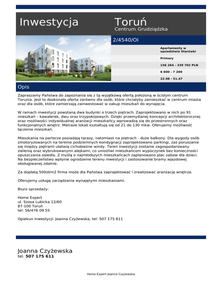 Inwestycja Toruń Centrum Grudziądzka , 2/4540/OI Apartamenty w sąsiedztwie Starówki Primary 156 264 - 339 702 PLN 6 600 - 7 200 22.98 - 51.47 Opis Zapraszamy Państwa do zapoznania się z tą wyjątkową ofertą położoną w ścisłym centrum Torunia. Jest to doskonała oferta zarówno dla osób, które chciałyby zamieszkać w centrum miasta oraz dla osób, które zamierzają zainwestować w zakup mieszkań do wynajęcia. W ramach inwestycji powstaną dwa budynki o trzech piętrach. Zaprojektowano w nich po 91 mieszkań – kawalerek, dwu oraz trzypokojowych. Dzięki przemyślanej koncepcji architektonicznej oraz możliwości indywidualnej aranżacji mieszkańcy wprowadzą się do przestronnych oraz funkcjonalnych wnętrz. Metraże lokali kształtują się od 21 do 130 mkw. Oferujemy możliwość łączenia mieszkań. Mieszkania na parterze posiadają tarasy, natomiast na piętrach - duże balkony. Dla wygody osób zmotoryzowanych na terenie podziemnych kondygnacji zaprojektowano parkingi, zaś poruszanie się między piętrami ułatwią cichobieżne windy. Teren inwestycji zostanie zagospodarowany zielenią oraz wybrukowanymi alejkami, co umożliwi mieszkańcom wypoczynek bez konieczności opuszczania osiedla. Z myślą o najmłodszych mieszkańcach zaplanowano plac zabaw dla dzieci. Na bezpieczeństwo wpłynie ogrodzenie terenu inwestycji i zastosowanie bramy wjazdowej obsługiwanej zdalnie. Za dopłatą 500zł/m2 firma może dla Państwa zaprojektować i zrealizować aranżację wnętrza. Oferujemy usługę zarządzania wynajętymi mieszkaniami. Biuro sprzedaży: Home Expert ul. Szosa Lubicka 12/60 87-100 Toruń tel: 56/476 09 55 Opiekun inwestycji: Joanna Czyżewska, tel: 507 175 611 Joanna Czyżewska tel. 507 175 611 Home Expert Joanna Czyżewska email: [email protected] Home Expert Joanna Czyżewska Powered by TCPDF (www.tcpdf.org)