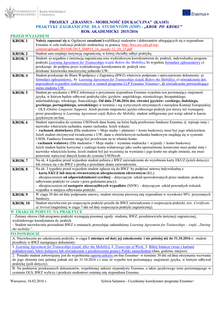 PROJEKT „ERASMUS - MOBILNOŚĆ EDUKACYJNA” (KA103) PRAKTYKI ZAGRANICZNE DLA STUDENTÓW (SMP) - „KROK PO KROKU” ROK AKADEMICKI 2015/2016 PRZED WYJAZDEM Należy zapoznać się z: Ogólnymi zasadami kwalifikacji studentów i doktorantów ubiegających się o stypendium KROK 1 KROK 2 KROK 3 KROK 4 KROK 5 KROK 6 KROK 7 KROK 8 KROK 9 KROK 10 Erasmus w celu realizacji praktyki studenckiej za granicą: http://bwz.uw.edu.pl/wpcontent/uploads/2015/06/2015_SMP15_16_zasady-12_10_15.pdf Student sam znajduje instytucję zagraniczną, w której chciałby odbyć praktykę. Student: a) uzgadnia z instytucją zagraniczną oraz wydziałowym koordynatorem ds. praktyk, indywidualny program praktyki Learning Agreement for Traineeships (część Before the Mobility), b) wypełnia formularz zgłoszeniowy c) przekazuje do podpisu przez wydziałowego koordynatora ds. praktyk oraz dziekana/ kierownika macierzystej jednostki UW. Student przekazuje do Biura Współpracy z Zagranicą (BWZ) właściwie podpisane i opieczętowane dokumenty: a) formularz zgłoszeniowy, b) Learning Agreement for Traineeships (część Before the Mobility), c) oświadczenie dot. poprzednich wyjazdów realizowanych w ramach programu LLP Erasmus/ Erasmus+, d) oświadczenie potwierdzające status studenta UW. Student po uzyskaniu z BWZ informacji o przyznaniu stypendium Erasmus wypełnia test poziomujący znajomość języka, w którym będzie odbywać praktykę (dot. języków: angielskiego, niemieckiego, hiszpańskiego, niderlandzkiego, włoskiego, francuskiego. Od dnia 27.06.2016 dot. również języków: czeskiego, duńskiego, greckiego, portugalskiego, szwedzkiego) w terminie i wg wytycznych otrzymanych z narzędzia Komisji Europejskiej – OLS (Online Linguistic Support). Jeżeli poziom znajomości języka roboczego praktyk jest niższy niż wymagany przez pracodawcę w Learning Agreement część Before the Mobility, student zobligowany jest wziąć udział w kursie językowym on-line. Student wprowadza do systemu USOSweb dane konta, na które będą przelewane fundusze Erasmus, tj. wpisuje imię i nazwisko właściciela rachunku, numer rachunku. Jeżeli wskaże: - rachunek złotówkowy (Dla studentów > Moje studia > płatności > konto bankowe), musi być jego właścicielem. Jeżeli student otrzymywał świadczenia z UW, dane o złotówkowym rachunku bankowym znajdują się w systemie USOS. Fundusze Erasmus mogą być przelewane na to właśnie konto. - rachunek walutowy (Dla studentów > Moje studia > wymiana studencka > wyjazdy > konto bankowe). Jeżeli student będzie korzystać z cudzego konta walutowego jako osoba upoważniona, koniecznie musi podać imię i nazwisko właściciela konta. Jeżeli student był już wcześniej na wymianie i jego konto nie uległo zmianie, nie musi ponownie wpisywać danych konta do systemu USOSweb. Na ok. 4 tygodnie przed wyjazdem student pobiera z BWZ zaświadczenie do wyrobienia karty EKUZ (jeżeli dotyczy) lub zwraca się z do BWZ z prośbą o przesłanie skanu zaświadczenia. Na ok. 3 tygodnie przed wyjazdem student zgłasza się do BWZ by podpisać umowę indywidualną z: - kartą EKUZ lub innym równoważnym ubezpieczeniem zdrowotnym (KL); - ubezpieczeniem od odpowiedzialności cywilnej – dotyczącym szkód spowodowanych przez studenta podczas odbywania praktyki (w czasie i poza godzinami pracy); - ubezpieczeniem od następstw nieszczęśliwych wypadków (NNW) – dotyczącym szkód powstałych wskutek wypadku w miejscu odbywania praktyki. W ciągu 30 dni od daty podpisania umowy, student otrzyma pierwszą ratę stypendium w wysokości 90% przyznanych funduszy. Student niezwłocznie po rozpoczęciu praktyki prześle do BWZ zaświadczenie o rozpoczęciu praktyki, tzw. Certificate of Arrival (najpóźniej w ciągu 7 dni od daty rozpoczęcia praktyki zagranicznej). W TRAKCIE POBYTU NA PRAKTYCE – Zmiany okresu i/lub programu praktyki wymagają pisemnej zgody: studenta, BWZ, przedstawiciela instytucji zagranicznej, wydziałowego koordynatora ds. praktyk. – Student niezwłocznie powiadomi BWZ o zmianach, przesyłając uaktualniony Learning Agreement for Traineeships – część „During the mobility”. PO POWROCIE A. Niezwłocznie po zakończeniu praktyki, w ciągu 1 miesiąca od daty jej zakończenia i nie później niż do 31.10.2016 r. student przedłoży w BWZ następujące dokumenty: 1. Learning Agreement for Traineeships (część After the Mobility); 2. Transcript of Work; 3. Bilety lotnicze (wraz z kartami pokładowymi), bilety kolejowe lub oświadczenie o przekroczeniu granicy Polski samochodem (data, godzina, miejsce). 2. Ponadto student zobowiązany jest do wypełnienia raportu-ankiety on-line Erasmus+ w terminie 30 dni od dnia otrzymania wezwania do jego złożenia (nie później jednak niż do 31.10.2016 r.) oraz że wypełni test poziomujący znajomość języka, w którym odbywał praktykę (jeśli dotyczy). B. Na podstawie przekazanych dokumentów, wypełnionej ankiety stypendysty Erasmus, a także językowego testu poziomującego w systemie OLS, BWZ wyliczy i przekaże studentowi ostatnią ratę stypendium Erasmus. Warszawa, 18.02.2016 r. Sylwia Salamon - Uczelniany koordynator programu Erasmus+