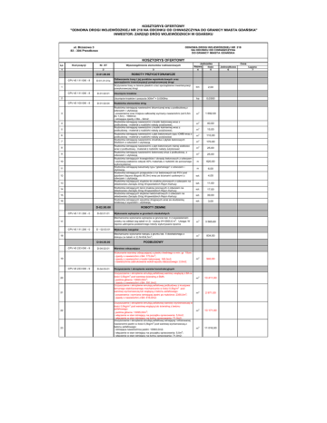 KOSZTORYS OFERTOWY "ODNOWA DROGI WOJEWÓDZKIEJ NR 218 NA ODCINKU OD CHWASZCZYNA DO GRANICY MIASTA GDAŃSKA" INWESTOR: ZARZĄD DRÓG WOJEWÓDZKICH W GDAŃSKU ul. Brzozowa 3 83 - 304 Przodkowo ODNOWA DROGI WOJEWÓDZKIEJ NR 218 NA ODCINKU OD CHWASZCZYNA DO GRANICY MIASTA GDAŃSKA KOSZTORYS OFERTOWY Lp. Kod pozycji 1 Nr. ST Wyszczególnienie elementów rozliczeniowych 2 3 D-01.00.00 ROBOTY PRZYGOTOWAWCZE Odtworzenie trasy i jej punktów wysokościowych oraz sporządzenie inwentaryzacji powykonawczej drogi Wytyczenie trasy w terenie płaskim oraz sporządzenie inwentaryzacji powykonawczej drogi CPV 45 111 000 - 8 D-01.01.01a CPV 45 111 000 - 8 D-01.02.01 Usunięcie krzaków CPV 45 100 000 - 8 D-01.02.04 Rozbiórka elementów dróg 1 2 2 Usunięcie krzaków i poszycia 300m = 0,0300ha Rozbiórka istniejącej nawierzchni bitumicznej wraz z podbudową z odwozem i utylizacją: - poszerzenia oraz miejsca całkowitej wymiany nawierzchni (od 0,5m do 1,5m) - 1660m2; - istniejące zjazdy z BA - 32m2; Rozbiórka istniejącej nawierzchni z kostki betonowej wraz z podbudową - materiał z rozbiórki należy zutylizować; Rozbiórka istniejącej nawierzchni z kostki kamiennej wraz z podbudową - materiał z rozbiórki należy zutylizować; 3 4 5 Rozbiórka istniejącej nawierzchni z płyt betonowych typu IOMB wraz z podbudową - materiał z rozbiórki należy zutylizować Rozbiórka istniejącej nawierzchni chodnika z płytek betonowych 50x50cm z odwozem i utylizacją 6 7 Rozbiórka istniejącej nawierzchni z płyt betonowych różnej wielkości wraz z podbudową - materiał z rozbiórki należy zutylizować Rozbiórka istniejącej nawierzchni betonowej wraz z podbudową z odwozem i utylizacją 8 9 Rozbiórka istniejących krawężników i obrzeży betonowych z odwozem i utylizacją (założono odzysk 40% materiału z rozbiórki do ponownego wykorzystania) Rozbiórka istniejącej balustrady typu "gdańskiego" z odwozem i utylizacją Rozbiorka istniejących przepustów z rur betonowych lub PCV pod zjazdami (łączna długość 80,0m) wraz ze ścianami czołowymi z odwozem i utylizacją Rozbiórka istniejących slupków do znaków pionowych z odwozem na składowisko Zarządu Dróg Wojewódzkich Rejon Kartuzy 10 11 12 13 Rozbiórka istniejących tarcz znaków pionowych z odwozem na składowisko Zarządu Dróg Wojewódzkich Rejon Kartuzy Rozbiórka istniejących słupków hektometrowych z odwozem na składowisko Zarządu Dróg Wojewódzkich Rejon Kartuzy Rozbiórka istniejących wpustów drogowych wraz ze studzienką ściekową z wywozem i utylizacją 14 15 16 D-02.00.00 CPV 45 111 200 - 0 D-02.01.01 CPV 45 111 200 - 0 D - 02.03.01 D-04.02.01 CPV 45 233 000 - 9 20 21 22 23 D-04.03.01 0,0300 m 2 1 692,00 m 2 40,00 m 2 15,00 m2 110,00 m2 170,00 m 2 25,00 m2 25,00 m 620,00 m 6,00 szt. 4,00 szt. 11,00 szt. 17,00 szt. 39,00 szt. 3,00 m3 3 565,60 3 834,50 m2 940,00 m PODBUDOWY Warstwa odsączająca Wykonanie warstwy odsączającej z piasku średniego o min. gr. 15cm: - zjazdy o nawierzchni z BA: 773,0m 2; - zjazdy o nawierzchni z kostki betonowej: 165,0m2; - nawierzchnia zabrukowania wokół wpustu deszczowego: 2,0m2; 19 ha Wykonanie nasypów D-04.00.00 CPV 45 233 000 - 9 2,00 Wykonanie wykopów w gruntach nieskalistych Mechaniczne wykonanie nasypu z gruntu kat. II dowiezionego z dokopu (w tabeli nr 2) N=834,5m 3; 18 km ROBOTY ZIEMNE Mechaniczne wykonanie wykopów w gruncie kat. II z wywiezieniem urobku na odkład (wg tabeli nr 2) - wykop W=3565,6 m 3. Uwaga: W rejonie uzbrojenia podziemnego roboty wykonywane ręcznie 17 Jednostka Nazwa Ilość 4 5 Oczyszczenie i skropienie warstw konstrukcyjnych Oczyszczenie i skroplenie emulsją asfaltową warstwy wiążącej z BA w ilości 0,5kg/m 2 pod warstwę ścieralną z SMA: 2 - jezdnia główna: 12820,00m ; - zjazdy o nawierzchni z BA: 591,0m2; Oczyszczenie i skroplenie emulsją asfaltową podbudowy z kruszywa łamanego stabilizowanego mechanicznie w ilości 0,5kg/m 2 pod warstwę wyrównawczą lub wiążącą z betonu asfaltowego: - poszerzenia i wymiana istniejącej jezdni po rozbiórce: 2355,0m 2; - zjazdy o nawierzchni z BA: 616,0m2; Oczyszczenie i skroplenie emulsją asfaltową warstwy wyrównawczej w 2 ilości 0,5kg/m pod warstwę wiążącą lub ścieralną z betonu asfaltowego: - jezdnia główna: 13095,00m 2; - włączenie w stan istniejący na początku opracowania: 5,0m2; - włączenie w stan istniejący na końcu opracowania: 71,0m2; Oczyszczenie i skroplenie emulsją asfaltową istniejącej i sfrezowanej nawierzchni jezdni w ilości 0,5kg/m 2 pod warstwę wyrównawczą z betonu asfaltowego: - istniejąca nawierzchnia jezdni: 10940,0m2; 2 - włączenie w stan istniejący na początku opracowania: 5,0m ; - włączenie w stan istniejący na końcu opracowania: 71,0m2; m 2 m2 13 411,00 2 971,00 2 13 171,00 m2 11 016,00 m Cena Jednostkowa 6 Łączna 7 KOSZTORYS OFERTOWY "ODNOWA DROGI WOJEWÓDZKIEJ NR 218 NA ODCINKU OD CHWASZCZYNA DO GRANICY MIASTA GDAŃSKA" INWESTOR: ZARZĄD DRÓG WOJEWÓDZKICH W GDAŃSKU 1 CPV 45 233 000 - 9 2 3 D-04.04.02 Podbudowa z kruszywa łamanego stabilizowanego mechanicznie Wykonanie podbudowy z kruszywa łamanego stabilizowanego mechanicznie o gr. 10 cm: 2 - chodnik z płytek betonowych: 260,0m ; Wykonanie podbudowy z kruszywa łamanego stabilizowanego mechanicznie o gr. 15 cm: 2 - zjazdy o nawierzchni z BA: 652m ; 2 - zjazdy z kostki betonowej: 165m ; - nawierzchnia zabrukowania wokół wpustu deszczowego: 2,0m2; Wykonanie podbudowy z kruszywa łamanego stabilizowanego mechanicznie o gr. 20 cm: 2 - poszerzenia i miejsca wymiany istniejącej jezdni: 2702,0m ; 24 25 26 CPV 45 233 000 - 9 D-04.05.01 D-05.00.00 CPV 45 233 000 - 9 D-05.03.05a 28 D-05.03.05b 29 30 31 CPV 45 233 000 - 9 45112000 - 5 D-06.03.01a 33 CPV 45 233 000 - 9 D-05.03.11 D-05.03.13 35 CPV 45 233 000 - 9 D-05.03.23 36 CPV 45 233 000 - 9 D-05.03.26 37 D-06.00.00 CPV 45 233 000 - 9 45112000 - 5 38 D-06.01.01 260,00 m2 819,00 m2 2 702,00 m2 3 765,00 2 571,00 m2 597,00 m2 12 9