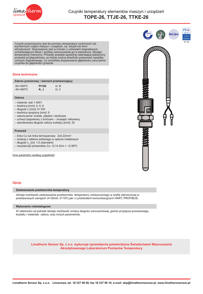 Czujniki temperatury elementów maszyn i urządzeń SENSOR TOPE-26, TTJE-26, TTKE-26 Czujnik przeznaczony jest do pomiaru temperatury ruchomych lub wymiennych części maszyn i urządzeń, np. łożysk lub form wtryskowych. Wyposażony jest w króciec z uchwytem bagnetowym, umożliwiającym łatwe i szybkie zamocowanie go w elemencie, którego temperaturę mierzymy. Ponadto posiada sprężynę osłaniającą elastyczny przewód przyłączeniowy, po której można dowolnie przesuwać nasadkę uchwytu bagnetowego, co umożliwia dopasowanie głębokości zanurzenia czujnika do głębokości gniazda. Dane techniczne Zakres pomiarowy / element przetwarzający -50÷400ºC -40÷400ºC Pt100 K, J kl. B kl. 2 Osłona – materiał: stal 1.4541 – średnica [mm]: 4; 5; 6 – długość L [mm]: 0÷100 – średnica sprężyny [mm]: 6 – zakończenie: kuliste, płaskie i stożkowe – uchwyt bagnetowy z króćcem – mosiądz niklowany – standardowa długość osłony kulistej L[mm]: 32 Przewód – linka Cu lub linka termoparowa: 2x0,22mm2 – izolacja z włókna szklanego w oplocie metalowym – długość Lp [m]: 1,5 (standard) – rezystancja przewodów Cu ~0,14 Ω/m = ~0,36ºC Inne parametry według uzgodnień Opcje Zastosowanie przetwornika temperatury Istnieje możliwość zastosowania przetwornika temperatury umieszczonego w szafie sterowniczej w podstawowych wersjach (4÷20mA, 0÷10V) jak i z protokołami komunikacyjnymi HART, PROFIBUS. Wykonanie niekatalogowe W zależności od potrzeb istnieje możliwość zmiany długości zanurzeniowej, gwintu przyłącza procesowego, kształtu i materiału osłony, oraz innych parametrów. Limatherm Sensor Sp. z o.o. wykonuje sprawdzenia potwierdzone Świadectwem Wzorcowania Akredytowanego Laboratorium Pomiarów Temperatury Limatherm Sensor Sp. z o.o. Limanowa, tel. 18 337 99 00, fax 18 337 99 10, e-mail: [email protected], www.limathermsensor.pl Czujniki temperatury elementów maszyn i urządzeń SENSOR TOPE-26, TTJE-26, TTKE-26 Izolacje przewodów kompensacyjnych / termoelektrycznych Zakres temperatury pracy [°C] Właściwości PCW (PCV) -10÷105 Stosowany w łagodnych warunkach otoczenia. Wodoodporny i elastyczny Yc-polwinit -10÷105 Stosowany w łagodnych warunkach otoczenia. Wodoodporny i elastyczny FEP-teflon -50÷200 Odporny na działanie olejów, kwasów i innych agresywnych cieczy. Dobra elastyczność giętkość. Si-silikon -50÷180 Wodoodporny, elastyczny stosowany w warunkach podwyższonej wilgotności. Ws-włókno szklane -60÷400 Dobra odporność na wysoką temperaturę. Słaba odporność na wnikanie cieczy. 200 Lp Materiał izolacji Uwagi: Dodatkowo na przewody zakładane są oploty/ekrany/miedziane lub stalowe zapobiegające zakłóceniom elektrycznym, równocześnie podwyższające odporność izolacji przewodów na uszkodzenia mechaniczne. W przypadku dłuższego odcinka przewodu, aplikacja może wymagać uziemienia, aby zminimalizować ingerencję "hałasu" w obwodzie pomiarowym. ø6 4 standard 32 mm M12×1 M14×1,5 ø6 L L d ø5 ø4 ø6 Tolerancje klas rezystorów i czujników z rezystorami Pt wg normy PN-EN 60751 Typy spoin pomiarowych dla termoelementów Klasy czujników Zakres stosowania dla rezystorów [°C] Wzór na obliczenie dopuszczalnych odchyłek [°C] AA 0÷150 T = ±(0,10 + 0,0017 |t|) A -30÷300 T = ±(0,15 + 0,002 |t|) B -50÷500 T = ±(0,3 + 0,005 |t|) | t |- wartość bezwzględna temperatury Obwód pomiarowy SO SP 1 x Pt100 2-przew 2 x Pt100 3-przew 4-przew 2-przew 3-przew 4-przew x x x 1 x TC 2 x TC 2-przew 2-przew x Tolerancja dla klas termoelementów wg normy PN-EN 60584 Typ termoelementu Klasa 1 Zakres stosowania [°C] J Fe-CuNi K NiCr-NiAl Klasa 2 Tolerancja [°C] Zakres stosowania [°C] Tolerancja [°C] od -40 do +375 od +375 do +750 ±1,5 ±0,004 |t| od -40 do +333 od +333 do +750 ±2,5 ±0,0075 |t| od -40 do +375 od +375 do +1000 ±1,5 ±0,004 |t| od -40 do +333 od +333 do +1200 ±2,5 ±0,0075 |t| | t |- wartość bezwzględna temperatury Limatherm Sensor Sp. z o.o. Limanowa, tel. 18 337 99 00, fax 18 337 99 10, e-mail: [email protected], www.limathermsensor.pl Czujniki temperatury elementów maszyn i urządzeń SENSOR TOPE-26, TTJE-26, TTKE-26 Rodzaje końcówek pomiarowych Kuliste Stożkowe ø5 ø6 ø5; 6 ø4 ø6 Płaskie ø5 ø4 ø5; 6 ø6 ø5 ø5; 6 ø4 Rodzaje króćców przyłączeniowych M12x1 M14x1,5 Schematy połączeń Pt100 (rezystor termometryczny) 2-przewodowy 3-przewodowy biały 2-przewodowy 4-przewodowy biały czerwony czerwony białły żółty 2xPt100/3 2xPt100/2 Pt100/4 Pt100/3 Pt100/2 biały czerwony 3-przewodowy biały żółty biały czarny czerwony czerwony czerwony czarny czarny czerwony czerwony TC (termoelement) + + czarny FeCu-Ni /J/ - zielony NiCr-NiAl /K/ - biały biały Rodzaje i kolorystyka przewodów według normy EU D GB F USA Termoelement typu J czarny czarny niebieski czerwony czarny biały niebieski niebieski czerwony czerwony brązowy zielony niebieski żółty czarny żółty czarny czarny biały czerwony Termoelement typu K zielony zielony biały zielony fioletowy żółty fioletowy żółty żółty czerwony Limatherm Sensor Sp. z o.o. Limanowa, tel. 18 337 99 00, fax 18 337 99 10, e-mail: [email protected], www.limathermsensor.pl Czujniki temperatury elementów maszyn i urządzeń SENSOR TOPE-26, TTJE-26, TTKE-26 Kod wyrobu Element pomiarowy 1 OP rezystor Pt TJ termoelement Fe-CuNi /J/ TK termoelement NiCr-NiAl /K/ Zakończenie końcówki pomiarowej 2 P płaskie K kuliste S stożkowe Długość osłony 32 3 32mm inne parametry wg uzgodnień Średnica osłony 6 4 ø6mm inne parametry wg uzgodnień Wymiar gwintu króćca przyłączeniowego M12x1 5 gwint metryczny M12x1 inne parametry wg uzgodnień Typ rezystora lub / typ spoiny dla termoelementu 6 Pt100 Pt100/Pt500/Pt1000 SO spoina odizolowana SP spoina uziemiona Dokładność 7 A lub B dla rezystora pomiarowego 1 lub 2 dla termoelementu Obwód pomiarowy (dla rezystora) 8 2 2 - przewodowy 3 3 - przewodowy 4 4 - pr
