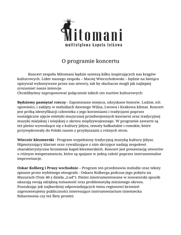 O programie koncertu Koncert zespołu Mitomani będzie syntezą kilku inspirujących nas kręgów kulturowych. Lider naszego zespołu – Maciej Wierzchołowski – będzie na bieżąco opisywał wykonywane przez nas utwory, tak by słuchacze mogli jak najlepiej zrozumieć nasze intencje. Chcielibyśmy zaproponować połączenie takich oto nurtów kulturowych: Będziemy pamiętać rzeczy - Zapomniane miejsca, odzyskane historie. Ludzie, ich opowieści, i zaklęty w melodiach dawnego Wilna, Lwowa i Krakowa klimat. Koncert jest próbą identyfikacji człowieka z jego korzeniami i tradycjami poprzez nostalgiczne ujęcie estetyki muzycznej przedwojennych kawiarni oraz tradycyjnej muzyki miejskiej i wiejskiej z okresu międzywojennego. W programie zawarte są też pieśni wywodzące się z kultury jidysz, tematy bałkańskie i romskie, które przywędrowały do Polski razem z przybyszami z różnych stron. Wieczór klezmerski - Program wypełniony tradycyjną muzyką kultury jidysz. Hipnotyzujący klarnet oraz rywalizujące z nim skrzypce nadają zespołowi charakterystyczne brzmienie kapel klezmerskich. Koncert jest prezentacją utworów o różnym temperamencie, które są spajane w jedną całość poprzez instrumentalne improwizacje. Oskar Kolberg i Prusy wschodnie – Program ten przedstawia melodie oraz teksty spisane przez wybitnego etnografa - Oskara Kolberga podczas jego pobytu na Mazurach (Tom 40 z dzieła „Lud”). Pieśni zinstrumentowane w nowatorski sposób ukazują swoją odrębną tożsamość oraz problematykę minionego okresu. Poszukując jak najbardziej odpowiadających temu regionowi brzmień zaprezentujemy publiczności interesujące instrumentarium (niemiecka fisharmonia czy też flety proste).