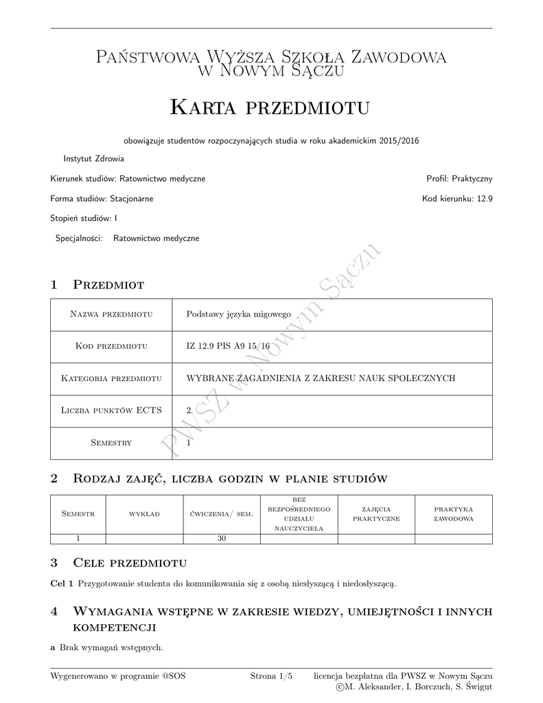Państwowa Wyższa Szkola Zawodowa w Nowym Sa˛czu Karta przedmiotu obowia˛zuje studentów rozpoczynaja˛cych studia w roku akademickim 2015/2016 Instytut Zdrowia Kierunek studiów: Ratownictwo medyczne Profil: Praktyczny Forma studiów: Stacjonarne Kod kierunku: 12.9 Stopień studiów: I IZ 12.9 PIS A9 15/16 Kategoria przedmiotu WYBRANE ZAGADNIENIA Z ZAKRESU NAUK SPOLECZNYCH Liczba punktów ECTS SZ Kod przedmiotu 2 PW Semestry 2 Podstawy je˛zyka migowego No wy Nazwa przedmiotu m Przedmiot w 1 Ratownictwo medyczne Sa˛ cz u Specjalności: 1 Rodzaj zaje˛ć, liczba godzin w planie studiów Semestr wyklad 1 3 ćwiczenia/ sem. bez bezpośredniego udzialu nauczyciela zaje˛cia praktyczne praktyka zawodowa 30 Cele przedmiotu Cel 1 Przygotowanie studenta do komunikowania sie˛ z osoba˛ nieslysza˛ca˛ i niedoslysza˛ca˛. 4 Wymagania wste˛pne w zakresie wiedzy, umieje˛tności i innych kompetencji a Brak wymagań wste˛pnych. Wygenerowano w programie @SOS Strona 1/5 licencja bezplatna dla PWSZ w Nowym Sa˛czu c M. Aleksander, I. Borczuch, S. Świgut Państwowa Wyższa Szkola Zawodowa w Nowym Sa˛czu Efekty ksztalcenia 5 EK1 Wiedza: Zna podstawowe poje˛cia i terminologie˛ z zakresu inwalidztwa narza˛du mowy. EK2 Wiedza: Posiada podstawowa˛ wiedze˛ dotycza˛ca˛ budowy i funkcji aparatu mowy. EK3 Umieje˛tności: Posluguje sie˛ znakami poje˛ciowymi je˛zyka migowego w systemie je˛zykowo - migowym w zakresie przekazywania i odbioru. EK4 Kompetencje spoleczne: Upowszechnia idee integracji spolecznej i niesienia pomocy osobom niepelnosprawnym. Treści programowe C2 C3 C4 Liczba godzin 4 6 5 5 10 30 7 PW SZ w C5 Sa˛ cz u C1 m Lp ćwiczenia/sem. Tematyka zaje˛ć Opis szczególowy bloków tematycznych Zagadnienia rehabilitacji nieslysza˛cych. Problematyka inwalidztwa. Przyczyny i konsekwencje gluchoty. Wplyw gluchoty na mowe˛. Zawodowe i spoleczne konsekwencje gluchoty. Środki porozumiewania sie˛ nieslysza˛cych i z nieslysza˛cymi mowa, pismo, fonogesty, alfabet palcowy, gestykulacja, je˛zyk migowy. Teorie daktylografii. Prawidla przekazywania palcowego. Alfabet palcowy a mowa. Znaki i zasady uzupelniaja˛ce daktylografie˛ Usprawnianie palców i nadgarstków. Przekazywanie i odbiór znaków liter. Przekazywanie znaków określaja˛cych liczby. Ideologia, ideografia. Zasady systemu je˛zyka migowego. Zasady systemu je˛zykowo migowego i przekazu uproszczonego w tym systemie. Slownictwo podstawowe i specjalistyczne. Poslugiwanie sie˛ slownikiem ilustrowanym, gestogramami. Odczytywanie przekazów gestograficznych . 10 Razem No wy 6 Metody dydaktyczne M1 Praca w grupach M2 Praca z podre˛cznikiem M3 Konsultacje Wygenerowano w programie @SOS Strona 2/5 licencja bezplatna dla PWSZ w Nowym Sa˛czu c M. Aleksander, I. Borczuch, S. Świgut Państwowa Wyższa Szkola Zawodowa w Nowym Sa˛czu 8 Obcia˛żenie praca˛ studenta Średnia liczba godzin na zrealizowanie aktywności Forma aktywności 9 Sa˛ cz u Godziny kontaktowe z nauczycielem akademickim, w tym: Godziny wynikaja˛ce z planu studiów 30 Konsultacje przedmiotowe 0 Egzaminy i zaliczenia w sesji 0 Godziny bez udzialu nauczyciela akademickiego wynikaja˛ce z nakladu pracy studenta, w tym: Przygotowanie sie˛ do zaje˛ć, w tym studiowanie zalecanej literatury 20 Opracowanie wyników 0 Przygotowanie raportu, projektu, prezentacji, dyskusji 0 Sumaryczna liczba godzin dla przedmiotu wynikaja˛ca z 50 calego nakladu pracy studenta Sumaryczna liczba punktów ECTS dla przedmiotu 2 Sposoby oceny Ocena formuja˛ca m F1 Zaliczenie pisemne No wy F2 Aktywność na zaje˛ciach F3 Ćwiczenie praktyczne w F4 Obserwacja SZ Kryteria oceny Efekt ksztalcenia 1 Na ocene˛ 5 Na ocene˛ 3 Na ocene˛ 4 Na ocene˛ 5 PW Na ocene˛ 3 Na ocene˛ 4 Miejsce weryfikacji Z pomoca˛ nauczyciela posluguje sie˛ podstawowymi poje˛ciami i terminologia˛ z zakresu inwalidztwa narza˛du mowy. Posluguje sie˛ podstawowymi poje˛ciami i terminologia˛ z zakresu inwalidztwa narza˛du mowy, z niewielka˛ pomoca˛ nauczyciela. Samodzielnie posluguje sie˛ podstawowymi poje˛ciami i terminologia˛ z zakresu inwalidztwa narza˛du mowy. Efekt ksztalcenia 2 Omawia budowe˛ i funkcje˛ aparatu mowy z pomoca˛ nauczyciela. ćwiczenia/ sem. Miejsce weryfikacji ćwiczenia/ sem. Opis weryfikacji EK 1 Aktywność na zaje˛ciach, zaliczenie pisemne. Opis weryfikacji EK 2 Aktywność na zaje˛ciach, zaliczenie pisemne. Omawia budowe˛ i funkcje˛ aparatu mowy z niewielka˛ pomoca˛ nauczyciela. Samodzielnie omawia budowe˛ i funkcje˛ aparatu mowy. Wygenerowano w programie @SOS Strona 3/5 licencja bezplatna dla PWSZ w Nowym Sa˛czu c M. Aleksander, I. Borczuch, S. Świgut Państwowa Wyższa Szkola Zawodowa w Nowym Sa˛czu Efekt ksztalcenia 3 Na ocene˛ 3 Na ocene˛ 4 Opis weryfikacji EK 4 Aktywność na zaje˛ciach, obserwacja. ćwiczenia/ sem. w Na ocene˛ 5 Rozumie potrzebe˛ upowszechniania idei integracji spolecznej i niesienia pomocy osobom niepelnosprawnym po ukierunkowaniu przez nauczyciela. Rozumie potrzebe˛ upowszechniania idei integracji spolecznej i niesienia pomocy osobom niepelnosprawnym po niewielkim ukierunkowaniu przez nauczyciela. Samodzielnie upowszechnia idee integracji spolecznej i niesienia pomocy osobom niepelnosprawnym. Miejsce weryfikacji Sa˛ cz u Na ocene˛ 5 Aktywność na zaje˛ciach, zaliczenie pisemne, ćwiczenie praktyczne. ćwiczenia/ sem. m Na ocene˛ 4 Posluguje sie˛ znakami poje˛ciowymi je˛zyka migowego w systemie je˛zykowo - migowym w zakresie przekazywania i odbioru z pomoca˛ nauczyciela. Posluguje sie˛ znakami poje˛ciowymi je˛zyka migowego w systemie je˛zykowo - migowym w zakresie przekazywania i odbioru z niewielka˛ pomoca˛ nauczyciela. Biegle posluguje sie˛ znakami poje˛ciowymi je˛zyka migowego w systemie je˛zykowo - migowym w zakresie przekazywania i odbioru. Efekt ksztalcenia 4 Opis weryfikacji EK 3 No wy Na ocene˛ 3 Miejsce weryfikacji SZ Ocena do indeksu (ocena podsumowuja˛ca) PW Średnia arytmetyczna ocen z wszystkich efek