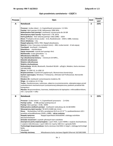 Nr sprawy: RN-T-16/2013 Załącznik nr 1.5 Opis przedmiotu zamówienia – CZĘŚĆ 5 Pozycja A Opis Notebook 2 Stawka VAT 23% 1 23% ilość Procesor: Liczba rdzeni – 4, Częstotliwość procesora 2.2 GHz Pamięć: Ilość pamięci 8 GB, taktowanie 1066 MHz Maksymalna ilość pamięci: możliwość rozszerzenia do 16 GB Wewnętrzny dysk twardy: Pojemność 1 TB, SATA Karta graficzna: Ilość własnej pamięci video [MB] – 1024 Ekran: Przekątna ekranu [cale] - 15.6, Rozdzielczość - 1920 x 1080, matowy Ekran dotykowy – nie, Napęd optyczny: DVD+/-RW, Napęd wbudowany Bateria: Li-Ion, Czas pracy na baterii [min] – 300, Liczba komór - 6 lub więcej Touchpad: touchpad + trackpoint, Klawiatura: - standardowa Opcje rozszerzeń: czytnik kart pamięci 4in1 Multimedia: Liczba głośników – 2, Wbudowany mikrofon: – tak, Typ wbudowanej kamery: – minimum 0.9 MPix , Głośniki wbudowane Wejście mikrofonowe Wyjście słuchawkowe Komunikacja: WLAN, Bluetooth, Standard WLAN - a/b/g/n, Modem, Karta sieciowa 10/100/1000 Złącza: 2x USB 3.0, 1x USB 2.0 Bezpieczeństwo: Czytnik linii papilarnych, Wzmocniona konstrukcja System operacyjny: Windows 7 Enterprise, Ultimate lub Professional, Sterowniki Windows 7 Modem 3G: możliwość zamontowania modemu 3G Waga: nie większa niż 2.5 kg Torba: Dwukomorowa, nylonowa, odporna na przemoczenie, zabezpieczająca przed uszkodzeniami mechanicznymi (usztywniona);zabezpieczony paskiem przedział dla komputera Myszka: Bezprzewodowa, laserowa, dedykowana do laptopów z mikroodbiornikiem, min. 2 przyciski + rolka B Notebook Procesor: Liczba rdzeni – 4, Częstotliwość procesora - 2.4 GHz Pamięć cache: 6 MB pamięci podręcznej L3 Pamięć: Ilość pamięci - 8 GB, DDR3 Maksymalna wielkość pamięci: możliwość rozbudowy do 16 GB DDR3 Wewnętrzny dysk twardy1 TB SATA (5400 obr./min) Ekran Wyświetlacz Full HD o przekątnej 43,9 cm (17,3'''') z podświetleniem LED i powłoką antyodblaskową (1920 x 1080) – ekran matowy. Napędy optyczne: Napęd SuperMulti DVD±R/RW z obsługą nośników dwuwarstwowych Gniazda rozszerzeń:1 czytnik cyfrowych kart nośników Zewnętrzne porty wejścia/wyjścia: 1 port VGA; 1 port HDMI; 1 wyjście słuchawkowe; 1 wejście mikrofonowe; 1 port USB 2.0; 3 porty USB 3.0; 1 gniazdo RJ45 Technologie bezprzewodowe: Karta sieciowa Intel 802.11 b/g/n z obsługą technologii WiDi; Bluetooth Interfejs sieciowy: Wbudowana karta sieciowa Gigabit Ethernet 10/100/1000 Str. 1 Nr sprawy: RN-T-16/2013 Załącznik nr 1.5 Zarządzanie bezpieczeństwem: Zintegrowany czytnik linii papilarnych Klawiatura: Pełnowymiarowa podświetlana klawiatura z odizolowanymi klawiszami i klawiaturą numeryczną Urządzenie wskazujące: Tabliczka dotykowa z obsługą sterowania dotykowego i z wyłącznikiem Kamera internetowa: Kamera internetowa z wbudowanym zespołem dwóch mikrofonów cyfrowych Typ baterii: 6-ogniwowy, litowo-jonowy Torba Mysz: bezprzewodowa Zainstalowany system operacyjny: BRAK C Komputer stacjonarny 2 0% 2 0% Procesor: co najmniej 4-rdzeniowy (8 wątków), co najmniej 3.5 GHz Pamięć: 32 GB RAM, Płyta główna: wolne złącza: PCI-Express x16 (1), PCI-Express x1 (2), PCI (2) Dysk twardy: 2 TB SATA Napęd optyczny: DVD+/-RW Karta graficzna: może być zintegrowana Karta dźwiękowa: zintegrowana Zewnętrzne porty we-wy : Audio, 1 x RJ45 (Gigabit Ethernet), 2 x USB 3.0, 6 x USB 2.0 Zasilacz: 750 W Obudowa: Zainstalowane dodatkowe wentylatory Klawiatura: przewodowa Myszka: optyczna bezprzewodowa System Operacyjny: BRAK D Monitor: 27 cali, rozdzielczość 1920 x 1080, jasność min. 300 Cd/m Str. 2 2