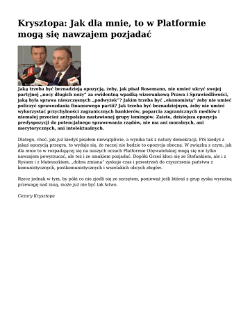 Krysztopa: Jak dla mnie, to w Platformie mogą się nawzajem pozjadać Jaką trzeba być beznadzieją opozycją, żeby, jak pisał Rosemann, nie umieć ukryć swojej partyjnej „nocy długich noży” za ewidentną wpadką wizerunkową Prawa i Sprawiedliwości, jaką była sprawa nieszczęsnych „podwyżek”? Jakim trzeba być „ekonomistą” żeby nie umieć policzyć sprawozdania finansowego partii? Jak trzeba być beznadziejnym, żeby nie umieć wykorzystać przychylności zagranicznych bankierów, poparcia zagranicznych mediów i niemałej przecież antypolsko nastawionej grupy lemingów. Zaiste, dzisiejsza opozycja predyspozycji do potencjalnego sprawowania rządów, nie ma ani moralnych, ani merytorycznych, ani intelektualnych. Dlatego, choć, jak już kiedyś pisałem niewątpliwie, a wynika tak z natury demokracji, PiS kiedyś z jakąś opozycją przegra, to wydaje się, że raczej nie będzie to opozycja obecna. W związku z czym, jak dla mnie to w rozpadającej się na naszych oczach Platformie Obywatelskiej mogą się nie tylko nawzajem powyrzucać, ale też i ze smakiem pozjadać. Dopóki Grześ kłoci się ze Stefankiem, ale i z Rysiem i z Mateuszkiem, „dobra zmiana” zyskuje czas i przestrzeń do czyszczenia państwa z komunistycznych, postkomunistycznych i wszelakich obcych złogów. Rzecz jednak w tym, by póki co nie zjedli się ze szczętem, ponieważ jeśli któraś z grup zyska wyraźną przewagę nad inną, może już nie być tak łatwo. Cezary Krysztopa