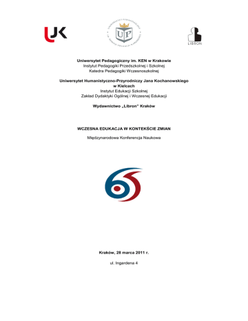 Uniwersytet Pedagogiczny im. KEN w Krakowie Instytut Pedagogiki Przedszkolnej i Szkolnej Katedra Pedagogiki Wczesnoszkolnej Uniwersytet Humanistyczno-Przyrodniczy Jana Kochanowskiego w Kielcach Instytut Edukacji Szkolnej Zakład Dydaktyki Ogólnej i Wczesnej Edukacji Wydawnictwo „Libron” Kraków WCZESNA EDUKACJA W KONTEKŚCIE ZMIAN Międzynarodowa Konferencja Naukowa Kraków, 28 marca 2011 r. ul. Ingardena 4 Patronat Naukowy JM Rektor Uniwersytet Humanistyczno-Przyrodniczy Jana Kochanowskiego w Kielcach prof. zw. dr hab. Regina Renz JM Rektor Uniwersytetu Pedagogicznego im. KEN w Krakowie prof. zw. dr hab. Michał Śliwa Patronat Medialny „Życie Szkoły” Przewodnicząca Konferencji prof. dr hab. Irena Adamek Komitet Naukowy prof. dr hab. Józefa Bałachowicz prof. dr. hab. Olena Bykovska prof. dr hab. Krystyna Gąsiorek prof. dr hab. Sławomir Koziej prof. dr hab. Hanna Krauze-Sikorska prof. dr hab. Bożena Muchacka prof. PhDr. Milan Portik PhD. prof. dr hab. Zdzisław Ratajek prof. dr hab. Jolanta Szempruch Komitet Organizacyjny dr Zuzanna Zbróg dr Anna Szkolak PROGRAM KONFERENCJI 9.00 – UROCZYSTE OTWARCIE KONFERENCJI (aula) Jego Magnificencja Rektor Uniwersytetu Pedagogicznego im. KEN w Krakowie prof. zw. dr hab. Michał Śliwa prof. dr hab. Irena Adamek – przewodnicząca konferencji, dyrektor Instytutu Pedagogiki Przedszkolnej i Szkolnej UP w Krakowie prof. dr hab. Sławomir Koziej – dyrektor Instytutu Edukacji Szkolnej UJK w Kielcach 9.15-13.10 SESJA PLENARNA (aula) Przewodniczą: prof. dr hab. Irena Adamek, prof. dr hab. Sławomir Koziej 9.15-9.40 prof. dr hab. Irena Adamek (Uniwersytet Pedagogiczny w Krakowie) Uczenie uczenia się – wspieranie edukacyjne ucznia 9.40-10.05 prof. dr hab. Józefa Bałachowicz (APS w Warszawie) Indywidualizacja jako postulat i konieczność współczesnej edukacji początkowej 10.05-10.30 prof. dr. hab. Iryna Zaitseva (Ukraińskie Centrum Oceniania Jakości Edukacji w Kijowie) Testowanie jak sposób oceny jakości filologicznej edukacji: tak albo nie 10.30-10.55 prof. dr. hab. Olena Bykovska (Instytut Ekologii, Ekonomii i Prawa, Narodowy Uniwersytet Pedagogiczny im. M. P. Dragomanowa w Kijowie) Edukacja na Ukrainie w kontekście zmian 10.55 – 11.30 PRZERWA KAWOWA 11.30-11.55 prof. dr hab. Jolanta Szempruch (Uniwersytet Humanistyczno-Przyrodniczy Jana Kochanowskiego w Kielcach) Nauczyciel wobec wyzwań edukacyjnych późnej nowoczesności 11.55-12.20 prof. PhDr. Milan Portik PhD., PaedDr.Erika Novotná PhD. (Prešovská Univerzita v Prešove, Słowacja) Teacher Training in the Context of Pre-primary Education 12.20-12.45 prof. dr hab. Hanna Krauze-Sikorska (UAM w Poznaniu) Diagnoza społecznego funkcjonowania dzieci z utrudnieniami w rozwoju w klasie szkolnej jako warunek tworzenia skutecznej „sieci wsparcia” zorientowanej na jednostkę i grupę 12.45-13.10 dr Eugenia Rostańska (Uniwersytet Śląski w Katowicach) Aktywność językowa jako cecha relacji dziecko-dorosły SEKCJA I (s. 201) Polityka oświatowa państwa a wyrównywanie szans edukacyjnych Przewodniczą: dr Bożena Pawlak, dr Joanna Żądło Część 1.: 14.30 – 16.00 dr Anita Famuła-Jurczak (Uniwersytet Zielonogórski) Zmiany w systemie edukacji drogą do wyrównania szans edukacyjnych dr Joanna Skibska (Akademia Techniczno-Humanistyczna w Bielsku-Białej) Kształcenie uczniów ze specjalnymi potrzebami edukacyjnymi – zmiany systemowe mgr Ewelina Majewska-Pyrkosz (SP nr 42 w Sosnowcu, Uniwersytet Śląski w Katowicach) Dziecko ze specjalnymi potrzebami edukacyjnymi w kontekście zmian PhDr. Martina Fasnerová, Ph.D. (Univerzita Palackého v Olomouci, Czechy) Kurikulráni reforma – nositelka zmĕn v edukacji v ČR mgr Bożena Kurasz (Zespół Szkół nr 8 w Żorach) Rozwój społeczny dziecka a zapisy podstawy programowej mgr Zuzana Portikova (Prešovská Univerzita v Prešove, Słowacja) Cudzie jazyky v počiatočnom vzdelávaní v kontexte súčasnej kurikulárnej reformy na Slovensku. Foreign Languages in Pre-primary Education in the Context of the Slovak Educational Reform dr Bożena Pawlak (Uniwersytet Pedagogiczny w Krakowie) Zmiany w edukacji wczesnoszkolnej – dlaczego? dla kogo? Część 2.: 16.15 – 17.30 mgr Agnieszka Potempa (University of Oulu, Finlandia) Wczesna edukacja i opieka nad dzieckiem w Finlandii – ogólny dobrostan dzieci i rodziny, rozwój i nauka Doc. Phdr. Ľuba Sičáková, phd. (Prešovská Univerzita v Prešove, Słowacja) Propriá v primárnej edukácii dr Zuzanna Zbróg ((Uniwersytet Humanistyczno-Przyrodniczy Jana Kochanowskiego w Kielcach) Wyrównywanie szans edukacyjnych w kontekście dostępności edukacji przedszkolnej mgr Karichkovska Svitlana (Narodowy Uniwersytet Pedagogiczny im. M. P. Dragomanowa w Kijowie) Fachowe przygotowanie nauczycieli w uniwersytetach Ukrainy i Polski: analiza porównawcza dr Barbara Bilewicz-Kuźnia, dr Teresa Parczewska (UMCS w Lublinie) Telewizja lokalna w wyrównywaniu szans edukacyjnych małego dziecka dr Danuta Morańska (Uniwersytet Śląski w Katowicach) Netbooki w edukacji wczesnoszkolnej, czyli czy komputery odciążyły tornistry dr Joanna Żądło (Uniwersytet Pedagogiczny w Krakowie) Możliwości indywidualizacji procesu kształcenia w edukacji wczesnoszkolnej SEKCJA II (sala 212) Potrzeby i możliwości dzieci a wymagania programowe Przewodniczą: dr Anna Jakubowicz-Bryx, dr Ingrid Paśko Część 1.: 14.30 – 16.00 dr Beata Oelszlaeger (Uniwersytet Śląski w Katowicach) Uczenie się uczniów klas młodszych – stare i nowe wyzwania dr Aldona Kopik (Uniwersytet Humanistyczno-Przyrodniczy Jana Kochanowskiego w Kielcach), mgr Monika Zatorska (Europejska Agencja Rozwoju w Kielcach) Wielointeligentna edukacja dla dziecka dr Iwona Samborska (Akademia Techniczno-Humanistyczna w Bielsku-Białej) Potrzeby i możliwości doświadczania świata przez dziecko – nowe konteksty Agnieszka Podbilska (Uniwersytet Rzeszowski) Nowe spojrzenie na rozwój dzieci w świetle znowelizowanego progra