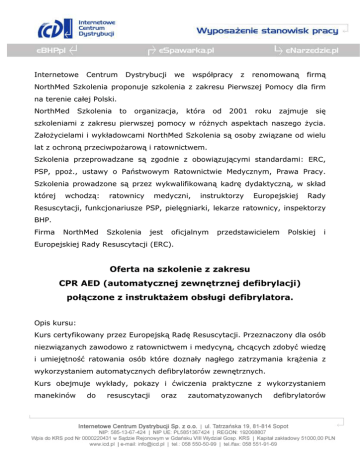 Internetowe Centrum Dystrybucji we współpracy z renomowaną firmą NorthMed Szkolenia proponuje szkolenia z zakresu Pierwszej Pomocy dla firm na terenie całej Polski. NorthMed Szkolenia to organizacja, która od 2001 roku zajmuje się szkoleniami z zakresu pierwszej pomocy w różnych aspektach naszego życia. Założycielami i wykładowcami NorthMed Szkolenia są osoby związane od wielu lat z ochroną przeciwpożarową i ratownictwem. Szkolenia przeprowadzane są zgodnie z obowiązującymi standardami: ERC, PSP, ppoż., ustawy o Państwowym Ratownictwie Medycznym, Prawa Pracy. Szkolenia prowadzone są przez wykwalifikowaną kadrę dydaktyczną, w skład której wchodzą: ratownicy medyczni, instruktorzy Europejskiej Rady Resuscytacji, funkcjonariusze PSP, pielęgniarki, lekarze ratownicy, inspektorzy BHP. Firma NorthMed Szkolenia jest oficjalnym przedstawicielem Polskiej i Europejskiej Rady Resuscytacji (ERC). Oferta na szkolenie z zakresu CPR AED (automatycznej zewnętrznej defibrylacji) połączone z instruktażem obsługi defibrylatora. Opis kursu: Kurs certyfikowany przez Europejską Radę Resuscytacji. Przeznaczony dla osób niezwiązanych zawodowo z ratownictwem i medycyną, chcących zdobyć wiedzę i umiejętność ratowania osób które doznały nagłego zatrzymania krążenia z wykorzystaniem automatycznych defibrylatorów zewnętrznych. Kurs obejmuje wykłady, pokazy i ćwiczenia praktyczne z wykorzystaniem manekinów do resuscytacji oraz zautomatyzowanych defibrylatorów zewnętrznych. Przed kursem uczestnicy otrzymują materiały szkoleniowe. Zajęcia prowadzą instruktorzy Europejskiej Rady Resuscytacji. Celem kursu jest nabycie umiejętności resuscytacyjnych jako prowadzenia ratownik, zgodnie podstawowych z najnowszymi zabiegów wytycznymi Europejskiej Rady Resuscytacji. Tematyka kursu: • Rozpoznanie osoby u której nastąpiło zatrzymanie krążenia. • Przeprowadzenie podstawowych zabiegów resuscytacyjnych. • Poznanie najczęstszych przyczyn zatrzymania krążenia. • Ułożenie poszkodowanego w pozycji bezpiecznej. • Wykonanie defibrylacji u osób dorosłych z zatrzymaniem krążenia, wykorzystując automatyczny defibrylator zewnętrzny (AED). • Szkolenie instruktażowe z obsługi technicznej defibrylatora. Kryteria szkolenia: • Forma: wykład i instruktaż + ćwiczenia. • Czas trwania: uzależniony od liczby uczestników. • Termin szkolenia: po akceptacji przez obie strony. • Miejsce szkolenia: obiekty Firmy. • Koszt szkolenia jednej osoby: − Certyfikowany przez Europejską Radę Resuscytacji – 250,00zł + 23%VAT (grupa min.12 osób/max.36 osób), − Certyfikat obowiązujący na terenie Polski – 130,00zł + 23%VAT (grupa min.10 osób/max.36 osób). − w/w ceny obowiązują w miastach: Gdańsk, Katowice, Łódź, Płock, Poznań, Szczecin, Warszawa i rejonach do 30km od granic tych miast, − w pozostałych rejonach należy doliczyć koszt w wysokości 0,95zł + 23%VAT za każdy kilometr dojazdu z najbliższego w/w miasta. W przypadku chęci zorganizowania szkolenia prosimy o przesłanie informacji na adres [email protected] zawierającej: • nazwę i adres zgłaszającego, • miejsce szkolenia, • rodzaj szkolenia, • wielkość grupy, • preferowaną datę szkolenia.