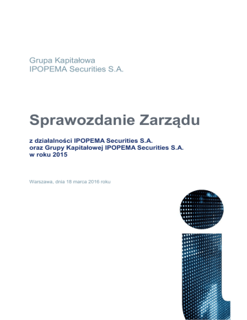 Grupa Kapitałowa IPOPEMA Securities S.A. Sprawozdanie Zarządu z działalności IPOPEMA Securities S.A. oraz Grupy Kapitałowej IPOPEMA Securities S.A. w roku 2015 Warszawa, dnia 18 marca 2016 roku Sprawozdanie Zarządu z działalności IPOPEMA Securities S.A. i Grupy Kapitałowej IPOPEMA Securities S.A. za rok 2015 Spis treści 1. Informacje podstawowe ................................................................................................................................ 3 2. Podstawowe dane finansowe i omówienie sytuacji finansowej Grupy IPOPEMA ......................................... 4 3. Istotne zdarzenia i czynniki, które miały wpływ na osiągane wyniki finansowe ............................................. 7 4. Czynniki mogące mieć wpływ na wyniki osiągane w roku 2016 .................................................................... 8 5. Działalność IPOPEMA Securities oraz Grupy IPOPEMA .............................................................................. 9 5.1 Główne rynki działalności, główni odbiorcy i dostawcy IPOPEMA Securities oraz Grupy IPOPEMA ... 9 5.2 Struktura organizacyjna Grupy Kapitałowej IPOPEMA Securities ...................................................... 10 5.3 Strategia i perspektywy rozwoju Grupy Kapitałowej IPOPEMA Securities ......................................... 10 5.4 Transakcje z jednostkami powiązanymi.............................................................................................. 11 5.5 Wybrane zdarzenia korporacyjne w 2015 r. oraz w roku 2016 do dnia sporządzenia sprawozdania . 11 5.6 Nagrody i wyróżnienia ........................................................................................................................ 11 5.7 Badania i rozwój ................................................................................................................................. 12 5.8 Zmiany podstawowych zasad zarządzania......................................................................................... 12 6. Kapitał i akcjonariat IPOPEMA Securities S.A. ........................................................................................... 13 6.1 Zmiana wysokości kapitału zakładowego IPOPEMA Securities S.A. ................................................. 13 6.2 Zmiana wysokości kapitału pozostałych spółek z Grupy IPOPEMA ................................................... 13 6.3 Akcjonariat IPOPEMA Securities S.A. ................................................................................................ 13 6.4 Nabycie akcji własnych ....................................................................................................................... 13 6.5 System kontroli programów akcji pracowniczych ................................................................................ 13 7. Informacje dotyczące osób zarządzających i nadzorujących ...................................................................... 14 8. Postępowania sądowe i administracyjne..................................................................................................... 16 9. Umowy kredytowe, poręczenia, gwarancje i inne umowy ........................................................................... 17 10. Czynniki ryzyka i zagrożenia ....................................................................................................................... 18 11. Informacje o podmiocie badającym sprawozdania finansowe..................................................................... 22 12. Oświadczenie o stosowaniu ładu korporacyjnego ....................................................................................... 23 2 Sprawozdanie Zarządu z działalności IPOPEMA Securities S.A. i Grupy Kapitałowej IPOPEMA Securities S.A. za rok 2015 Wstęp Niniejsze Sprawozdanie Zarządu zostało przygotowane zgodnie z Rozporządzeniem Ministra Finansów w sprawie informacji bieżących i okresowych przekazywanych przez emitentów papierów wartościowych oraz warunków uznawania za równoważne informacji wymaganych przepisami prawa państwa niebędącego państwem członkowskim, jak również zgodnie z Międzynarodowymi Standardami Sprawozdawczości Finansowej oraz Ustawą o rachunkowości. 1. Informacje podstawowe Grupa Kapitałowa IPOPEMA Securities S.A. („Grupa IPOPEMA”) jest instytucją finansową specjalizującą się w usługach brokerskich i analizach spółek oraz usługach bankowości inwestycyjnej (poprzez IPOPEMA Securities S.A. – jednostka dominująca, „Spółka”), tworzeniu i zarządzaniu zamkniętymi i otwartymi funduszami inwestycyjnymi oraz zarządzaniu aktywami (poprzez IPOPEMA Towarzystwo Funduszy Inwestycyjnych S.A. – jednostka zależna, „IPOPEMA TFI”, „Towarzystwo”), jak również usługach doradztwa gospodarczego i informatycznego (poprzez IPOPEMA Business Consulting Sp. z o.o. – jednostka zależna, „IPOPEMA BC”). Historia działalności IPOPEMA sięga maja 2003 r., kiedy to został założony Dom Inwestycyjny IPOPEMA S.A. świadczący usługi doradztwa w zakresie przygotowania i realizacji transakcji na rynku kapitałowym. W ramach strategii świadczenia kompleksowych usług bankowości inwestycyjnej, w czerwcu 2005 r. powstał, jako spółka zależna od DI IPOPEMA, Dom Maklerski IPOPEMA S.A. koncentrujący się na czynnościach związanych z realizacją ofert publicznych. W II połowie 2006 r. działalność DI IPOPEMA została przeniesiona do DM IPOPEMA, którego nazwa została zmieniona na IPOPEMA Securities S.A. Od października 2006 r. zakres usług oferowanych przez Spółkę został poszerzony o usługi brokerskie na rynku wtórnym na Giełdzie Papierów Wartościowych w Warszawie, a w kolejnych latach – na rynkach zagranicznych. W 2007 r. Grupa IPOPEMA została rozszerzona o IPOPEMA TFI, w 2008 r. – o IPOPEMA Business Consulting, a w 2011 r. – o IPOPEMA Asset Management, która w listopadzie 2015 r. zost