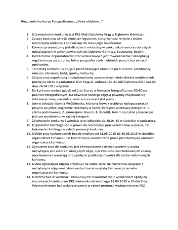 Regulamin Konkursu Fotograficznego „Moje ulubione…” 1. Organizatorem konkursu jest PKZ Klub Osiedlowy Krąg w Dąbrowie Górniczej. 2. Zasady konkursu określa niniejszy regulamin, który wchodzi w życie z dniem rozpoczęcia konkursu i obowiązuje do czasu jego zakończenia. 3. Konkurs przeznaczony jest dla dzieci i młodzieży w wieku szkolnym oraz dorosłych mieszkających w takich powiatach jak: Dąbrowa Górnicza, Sosnowiec, Będzin. 4. Dostarczenie organizatorowi prac konkursowych jest równoznaczne z akceptacją regulaminu przez autorów lub w przypadku osób nieletnich przez ich prawnych opiekunów. 5. Tematyką konkursu są zdjęcia przedstawiające ulubione przez autora: przedmioty, miejsca, zdarzenia, ludzi, sporty, hobby itp. 6. Zdjęcia oraz wypełnioną i podpisaną kartę uczestnictwa należy składać osobiście lub pocztą na adres organizatora: Klub Krąg ul. Ludowa 19a 41-300 Dąbrowa Górnicza do dnia 24.04.2015 włącznie. 7. Do konkursu można zgłosić od 1 do 3 prac w formacie fotograficznym 20x30 na papierze fotograficznym. Na odwrocie każdego zdjęcia powinny znajdować się informacje: imię, nazwisko i wiek autora oraz tytuł pracy. 8. Jury w składzie: Kamila Wróblewska, Martyna Nowak wybierze najlepsze prace i przyzna po jednej nagrodzie rzeczowej w każdej kategorii wiekowej (kategorie: 1. szkoła podstawowa, 2. gimnazjum i liceum, 3. dorośli). Jury może także przyznać po jednym wyróżnieniu w każdej kategorii. 9. Zakończenie konkursu i wernisaż prac odbędzie się 28.04.15 w siedzibie organizatora. 10. Organizator zastrzega sobie prawo do reprodukcji prac uczestników w prasie, TV, Internecie i katalogu w celach promocji konkursu. 11. Odbiór prac konkursowych będzie możliwy od 28.05.2015 do 30.06.2015 w siedzibie organizatora konkursu. Po tym terminie nieodebrane prace przechodzą na własność organizatora konkursu. 12. Zgłoszenie prac do konkursu jest równoznaczne z oświadczeniem iż osoba nadsyłająca jest autorem niniejszych zdjęć, a prawa osób sportretowanych zostały unormowane i wyrażają one zgodę na publikację również dla celów reklamowych konkursu. 13. Osoba zgłaszająca zdjęcia przyjmuje na siebie wszelkie roszczenia związane z nadsyłanymi zdjęciami, które osoby trzecie mogłyby kierować przeciwko organizatorom konkursu. 14. Uczestnictwo w wernisażu konkursu jest równoznaczne z wyrażeniem zgody na rozpowszechnianie przez PKZ wizerunku utrwalonego 28.04.2015 w Klubie Krąg. Wizerunek może być wykorzystywany w celach promocji wydarzenia oraz PKZ.
