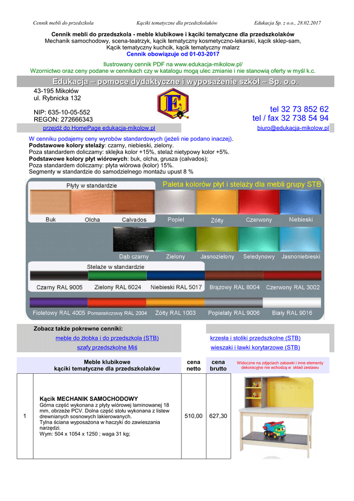 Cennik mebli do przedszkola Kąciki tematyczne dla przedszkolaków Edukacja Sp. z o.o., 28.02.2017 Cennik mebli do przedszkola - meble klubikowe i kąciki tematyczne dla przedszkolaków Mechanik samochodowy, scena-teatrzyk, kącik tematyczny kosmetyczno-lekarski, kącik sklep-sam, Kącik tematyczny kuchcik, kącik tematyczny malarz Cennik obowiązuje od 01-03-2017 Ilustrowany cennik PDF na www.edukacja-mikolow.pl/ Wzornictwo oraz ceny podane w cennikach czy w katalogu mogą ulec zmianie i nie stanowią oferty w myśl k.c. Edukacja – pomoce dydaktyczne i wyposażenie szkół – Sp. o.o. 43-195 Mikołów ul. Rybnicka 132 tel 32 73 852 62 tel / fax 32 738 54 94 NIP: 635-10-05-552 REGON: 272666343 przejdź do HomePage edukacja-mikolow.pl [email protected] W cenniku podajemy ceny wyrobów standardowych (jeżeli nie podano inaczej). Podstawowe kolory stelaży: czarny, niebieski, zielony. Poza standardem doliczamy: sklejka kolor +15%, stelaż nietypowy kolor +5%. Podstawowe kolory płyt wiórowych: buk, olcha, grusza (calvados); Poza standardem doliczamy: płyta wiórowa (kolor) 15%. Segmenty w standardzie do samodzielnego montażu upust 8 % Zobacz także pokrewne cenniki: meble do żłobka i do przedszkola (STB) krzesła i stoliki przedszkolne (STB) szafy przedszkolne Miś wieszaki i ławki korytarzowe (STB) Meble klubikowe kąciki tematyczne dla przedszkolaków cena netto cena brutto 510,00 627,30 Kącik MECHANIK SAMOCHODOWY 1 Górna część wykonana z płyty wiórowej laminowanej 18 mm, obrzeże PCV. Dolna część stołu wykonana z listew drewnianych sosnowych lakierowanych. Tylna ściana wyposażona w haczyki do zawieszania narzędzi. Wym: 504 x 1054 x 1250 ; waga 31 kg; Widoczne na zdjęciach zabawki i inne elementy dekoracyjne nie wchodzą w skład zestawu Cennik mebli do przedszkola Kąciki tematyczne dla przedszkolaków Kącik CZYTELNICZ – MIŚ 2 3 Korpus wykonany z płyty wiórowej laminowanej 18 mm. Szuflady zawieszane na prowadnicach rolkowych. Plecy z płyty HDF 3,2 mm lakierowanej. Drzwi zawieszone na zawiasach puszkowych. Poduszka kącika czytelniczego Miś 690,00 848,70 20,00 24,60 Kącik KOSMETYCZNO-LEKARSKI (biurko + kozetka + 4 taboret + regał) Biurko: wykonane z płyty wiórowej laminowanej 18 mm, oklejonej obrzeżem PCV; wymiary: gł. 500 x szer. 700 x wys. 530; waga 13 kg; Kozetka: wykonana z rury stalowej, malowanej farbą proszkową. Materac tapicerowany skórą syntetyczną zmywalną; wymiary: gł. 450 x szer. 1300 x wys. 450; waga 8,5 kg; Regał: wykonane z płyty wiórowej laminowanej 18 mm, oklejonej obrzeżem PCV; wymiary: gł. 250 x szer. 500 x wys. 1150; waga 15,5 kg; Taboret: wykonany z rury stalowej malowanej farbą proszkową, siedzisko wykonane ze sklejki 15 mm malowanej lakierem akrylowym; Fi 280 x wys. 310; waga 2,2 kg; 950,00 1168,50 5 Kącik KOSMETYCZNO-LEKARSKI kozetka 385,00 473,55 6 Kącik KOSMETYCZNO-LEKARSKI biurko 260,00 319,80 7 Kącik KOSMETYCZNO-LEKARSKI taboret 50,00 61,50 8 Kącik KOSMETYCZNO-LEKARSKI regał 255,00 313,65 9 Kącik KUCHCIK Wykonana z płyty wiórowej laminowanej 18 mm, oklejonej obrzeżem PCV. Komplet składa się z trzech elementów zestawionych ze sobą: lodówka – szafka dolna - szafka górna gł. 350 x szer. 1550 x wys. 1120; Waga 70 kg; 803,00 987,69 Kącik RELIGIJNY 10 Korpus wykonany z płyty wiórowej laminowanej 18 mm Plecy z płyty HDF 3,2 mm lakierowanej. Drzwi zawieszone na zawiasach puszkowych. Wypełnienie górnych drzwi – kratka 650,00 z tworzywa sztucznego. Nogi wykonane z kształtownika stalowego 40 x 40 x 1,5 mm, malowanego proszkowo, obrzeże PCV. Wym: 455 x 800 x 1550 ; waga 41 kg; 799,50 Kącik KREATYWNY 11 Korpus wykonany z płyty wiórowej laminowanej 18 mm. Szuflady zawieszane na prowadnicach rolkowych. Na plecach regału zamontowana tablica korkowa z wypełnieniem z miękkiej płyty pilśniowej. Obrzeża PCV. Wym: 450 x 1000 x 1350 ; waga 59 kg; 690,00 848,70 Edukacja Sp. z o.o., 28.02.2017 Cennik mebli do przedszkola Kąciki tematyczne dla przedszkolaków Kącik KAWIARENKA LALEK (regał, stół, 2x taboret) 12 Regał wykonany z płyty wiórowej laminowanej 18 mm. Ściana tylna wykonana z płyty HDF 3,2 mm lakierowanej. Ozdoby wykonane z płyty MDF surowej, malowanej farbą akrylową, zabezpieczoną dodatkowo lakierem bezbarwnym. Szuflady zawieszane na prowadnicach rolkowych. Uchwyty i stopki malowane farbą proszkową. Stelaż stołu i taboretów wykonany z rur fi 20 x 1,5 mm i fi 25 x 1,5 mm, malowany proszkowo. Blat stołu wykonany z płyty wiórowej 18 mm. Siedziska taboretów wykonane ze sklejki liściastej 18 mm, malowanej farbą akrylową zabezpieczoną dodatkowo lakierem bezbarwnym. obrzeże PCV. Regał domek: 400 x 800 x 1530; waga: 48 kg Stolik kawiarniany: 450 x 450 x 530; waga: 4,2 kg Taboret: 280 x 280 x355; waga: 2,5 kg 884,00 1087,32 13 Kącik KAWIARENKA LALEK regał 690,00 848,70 14 Kącik KAWIARENKA LALEK stolik 90,00 110,70 15 Kącik KAWIARENKA LALEK taboret 52,00 63,96 Edukacja Sp. z o.o., 28.02.2017