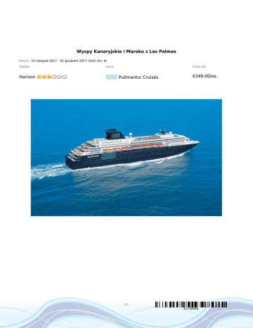 Wyspy Kanaryjskie i Maroko z Las Palmas Termin: 25 listopad 2017 - 02 grudzień 2017 (ilość dni: 8) Statek: Horizon Linia: Cena od: Pullmantur Cruises €349.00/os. 1/3 EV:49409 TRASA REJSU dzień 1 Data Port Wpłynięcie Wypłynięcie sobota 25.11.2017 Las Palmas, Gran Canaria / Wyspy Kanaryjskie --:-- 21:00 08:00 20:00 09:00 17:00 Legenda Hiszpania dzień 2 niedziela 26.11.2017 Santa Cruz de Tenerife, Teneryfa / Wyspy Kanaryjskie Hiszpania dzień 3 poniedziałek 27.11.2017 Santa Cruz de la Palma, La Palma / Wyspy Kanaryjskie Hiszpania dzień 4 wtorek 28.11.2017 Dzień na morzu --:-- --:-- dzień 5 środa 29.11.2017 Agadir 07:00 19:00 czwartek 30.11.2017 Arrecife, Lanzarote / Wyspy Kanaryjskie 13:00 20:00 09:00 18:00 08:00 --:-- dzień 6 Maroko Hiszpania dzień 7 dzień 8 piątek 01.12.2017 Corralejo, Fuerteventura sobota 02.12.2017 Las Palmas, Gran Canaria / Wyspy Kanaryjskie Hiszpania Hiszpania CENNIK Cena katalogowa Kabina wewnętrzna od €349.00 Kabina zewnętrzna z oknem od €379.00 Kabina zewnętrzna z balkonem od €464.00 Suite (apartament) od €609.00 Kabina jednoosobowa na zapytanie 3 i 4 osoba dorosła w kabinie na zapytanie Cena promocyjna 2/3 EV:49409 dziecko od 2 do 17 lat jako 3 i 4 osoba w kabinie na zapytanie dziecko od 0 do 2 lat jako 3 i 4 osoba w kabinie na zapytanie Opłaty portowe €200.00 Uwaga! Ceny za osobę w kabinie dwuosobowej. Cena zawiera: zakwaterowanie w kabinie wybranej kategorii; wyżywienie - 3 główne posiłki, przekąski między posiłkami, bufet lub przekąski o północy; podstawowy pakiet all inclusive; serwis bagażowy podczas wejścia i zejścia ze statku; serwis kabinowy; korzystanie ze wszystkich urządzeń sportowo - rekreacyjnych znajdujących się na pokładzie statku (basen, jacuzzi, sala fitness, itp.); udział we wszystkich imprezach organizowanych na statku (przedstawienia w teatrze, koncerty, programy animacyjne itp.). Cena nie zawiera: kosztów dojazdu do portu; ewentualnych noclegów w hotelu przed/po rejsie i transferów; wycieczek fakultatywnych w trakcie rejsu; korzystania z punktów usługowych (fryzjer, pralnia, fotograf, salon piękności i odnowy biologicznej, internet) i wydatków osobistych; napiwków dla obsługi na statku (kwota uzależniona od długości rejsu); ubezpieczenia KL, NNW i bagaż, kosztów wiz (tam gdzie wymagane). 3/3 EV:49409