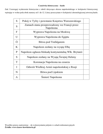 Czasówka historyczna – hasło Zad. Uszereguj wydarzenia historyczne z tabeli dotyczące okresu napoleońskiego w kolejności historycznej, wpisując w wolne pola obok numery od 1 do 12. Litery przeczytane w kolejności chronologicznej utworzą hasło. S Pokój w Tylży i powstanie Księstwa Warszawskiego S Zamach stanu przeprowadzony we Francji przez Napoleona F Wyprawa Napoleona na Moskwę U Wyprawa Napoleona do Egiptu Ó Bitwa pod Trafalgarem K Napoleon zesłany na wyspę Elbę P Napoleon ogłasza blokadę kontynentalną Wlk. Brytanii S Napoleon zesłany na Wyspę Świętej Heleny T Koronacja Napoleona na cesarza I Odwrót Wielkiej Armii napoleońskiej z Rosji N Bitwa pod Lipskiem A Śmierć Napoleona Wszelkie prawa zastrzeżone – do wykorzystania jedynie w celach niekomercyjnych Źródło: www.know-howhistoria.pl