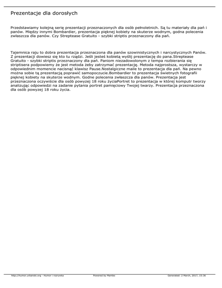 Prezentacje dla dorosłych Przedstawiamy kolejną serię prezentacji przeznaczonych dla osób pełnoletnich. Są tu materiały dla pań i panów. Między innymi Bombardier, prezentacja pięknej kobiety na skuterze wodnym, godna polecenia zwłaszcza dla panów. Czy Streptease Gratuito - szybki striptis przeznaczony dla pań. Tajemnica raju to dobra prezentacja przeznaczona dla panów szowinistycznych i narcystycznych Panów. Z prezentacji dowiesz się kto tu rządzi. Jeśli jesteś kobietą wyślij prezentację do pana.Streptease Gratuito - szybki striptis przeznaczony dla pań. Paniom niezadowolonym z tempa rozbierania się striptisera podpowiemy że jest metoda żeby zatrzymać prezentację. Metoda najprostsza, wystarczy w odpowiednim momencie nacisnąć klawisz Pause.Nostalgiczne maile to prezentacja dla pań. Na pewno można sobie tą prezentacją poprawić samopoczucie.Bombardier to prezentacja świetnych fotografii pięknej kobiety na skuterze wodnym. Godne polecenia zwłaszcza dla panów. Prezentacja jest przeznaczona oczywiście dla osób powyzej 18 roku życiaPortret to prezentacja w której komputr tworzy analizując odpowiedzi na zadanie pytania portret pamięciowy Twojej twarzy. Prezentacja przeznaczona dla osób powyzej 18 roku życia. http://humor.urbanski.org - Humor i rozrywka Powered by Mambo Generated: 2 March, 2017, 15:36