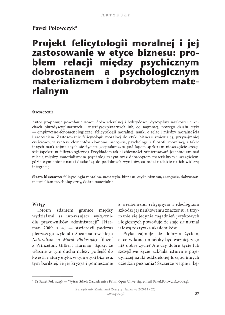 A Paweł Polowczyk* Projekt felicytologii moralnej i jej zastosowanie w etyce biznesu: problem relacji między psychicznym dobrostanem a psychologicznym materializmem i dobrobytem materialnym Streszczenie Autor proponuje powołanie nowej doświadczalnej i hybrydowej dyscypliny naukowej o cechach pluridyscyplinarnych i interdyscyplinarnych lub, co najmniej, nowego działu etyki — empiryczno-fenomenologicznej felicytologii moralnej, nauki o relacji między moralnością i szczęściem. Zastosowanie felicytologii moralnej do etyki biznesu zmienia ją, przynajmniej częściowo, w syntezę elementów ekonomii szczęścia, psychologii i filozofii moralnej, a także innych nauk zajmujących się życiem gospodarczym pod kątem spektrum nieszczęście-szczęście (spektrum felicytologiczne). Przykładem takiej zbieżności zainteresowań jest studium nad relacją między materializmem psychologicznym oraz dobrobytem materialnym i szczęściem, gdzie wymienione nauki dochodzą do podobnych wyników, co rodzi nadzieję na ich większą integrację. Słowa kluczowe: felicytologia moralna, metaetyka biznesu, etyka biznesu, szczęście, dobrostan, materializm psychologiczny, dobra materialne Wstęp „Moim zdaniem granice między wydziałami są interesujące wyłącznie dla pracowników administracji” [Harman 2009, s. 4] — stwierdził podczas pierwszego wykładu Shearmanowskiego Naturalism in Moral Philosophy filozof z Princeton, Gilbert Harman. Sądzę, że właśnie w tym duchu należy podejść do kwestii natury etyki, w tym etyki biznesu, tym bardziej, że jej kryzys i pomieszanie z wierzeniami religijnymi i ideologiami szkodzi jej naukowemu znaczeniu, a trzymanie się jedynie zagadnień językowych i logicznych powoduje, że staje się niemal jałową rozrywką akademików. Etyka zajmuje się dobrym życiem, a co w końcu miałoby być ważniejszego niż dobre życie? Ale czy dobre życie lub szczęśliwe życie zakłada istnienie pojedynczej nauki oddzielonej fosą od innych dziedzin poznania? Szczerze wątpię i bę- * Dr Paweł Polowczyk — Wyższa Szkoła Zarządzania / Polish Open University, e-mail: [email protected]. Zarządzanie Zmianami Zeszyty Naukowe 2/2011 (52) www.pou.pl 37 Z Z / dę starał się wykazać w tym artykule, że potrzeba zintegrowanego wysiłku wielu dyscyplin naukowych po to, aby sensownie zająć się dobrym życiem. Obecnie nie ma jednej zintegrowanej felicytologii, rozumianej jako nauka o szczęściu, tym bardziej nie istnieje felicytologia moralna, ani na poziomie dyscyplinarnym, ani na poziomie instytucjonalnym, choć jest wiele mniej lub bardziej rozproszonych badań, które należą do tej dziedziny. Przyznając jej należne prawa w dyskursie naukowym, jednocześnie zmieniamy obowiązujący model, a nawet paradygmat etyki, w tym etyki biznesu. Zamiast myśleć o niej jako o analizie języka moralności, dociekaniach czysto transcendentalnych lub swego rodzaju katechezie, którą trzeba przyjąć na wiarę, zaczynamy rozumieć, że etyka jest także nauką doświadczalną i przynajmniej częściowo empiryczną. Artykuł podzieliłem na dwie główne części. W pierwszej szkicuję obraz felicytologii moralnej jako nowego obszaru badań naukowych. Podaję jej definicję oraz opisuję relację między nią, felicytologią ogólną, etyką, w tym etyką biznesu, i innymi naukami zajmującymi się spektrum rozciągającym się od szczęścia do nieszczęścia. Prezentuję powód, dla którego warto zajmować się szczęściem i dlaczego szczęście jest wartością, oraz rację, dla której felicytologia moralna powinna być uznana za fragment etyki. Omawiam definicje oraz typologie szczęścia wywodzące się przede wszystkim z filozofii i psychologii. Argumentuję, że jest ona dziedziną hybrydową o właściwościach interdyscyplinarnych i pluridyscyplinarnych oraz że przyjęcie orientacji konsekwencjalistycznej pociąga za sobą doświadczalny (w tym empiryczny) charakter badań etycznych oraz jest zgodne z ich charakterem normatywnym. 38 W części drugiej zajmuję się zastosowaniem felicytologii moralnej w etyce biznesu. Podstawowe pytania w etyce życia ekonomicznego brzmią: Czy szukając szczęścia jako ludzie biznesu, menedżerowie, pracownicy czy konsumenci, znajdziemy je w pieniądzach i dobrach materialnych? Czy materializm, a nawet chciwość jest właściwą postawą uczestnika życia gospodarczego, tą która prowadzi do szczęścia? Te pytania pojawiają się w nowym świetle w ramach doświadczalnych felicytologicznych badań nad relacją między materializmem psychologicznym, posiadaniem dóbr materialnych i szczęściem. Ich wynik, zarówno w filozofii moralnej, jak i w psychologii oraz ekonomii szczęścia, jest uderzająco podobny: materializm prowadzi do zmniejszenia subiektywnego dobrego samopoczucia oraz obniża poziom moralny ludzi, posiadanie dóbr materialnych sprzyja szczęściu, ale tylko do pewnego poziomu, a bogactwo nie jest warunkiem koniecznym i wystarczającym do szczęścia. Prezentacja wyników tych poszukiwań posłuży jako przykład zastosowania felicytologii moralnej w obszarze etyki działalności gospodarczej i wykazaniu, że felicytologia moralna praktycznie już istnieje w formie zaczątkowej, a jej stosowanie prowadzi do postępu naukowego na polu zajmowanym od czasów starożytnych przez filozofię moralną. 1. Felicytologia moralna W podrozdziale pierwszym proponuję autorskie definicje oraz podział felicytologii moralnej nawiązujący do trzech obszarów etyki naukowej wyróżnionych przez Harrisa. W podrozdziale drugim uzasadniam, dlaczego warto zajmować się szczęściem i dlaczego szczęście jest wartością, powołując się na powszech- Zarządzanie Zmianami Zeszyty Naukowe 2/2011 (52) www.pou.pl A ność ludzkiego poszukiwania szczęścia i przyjemności. Psychologiczny hedonizm czy też — szerzej — felicytocentryzm może być dobrą racją nie tylko dla budowania koncepcji szczęścia, ale i 