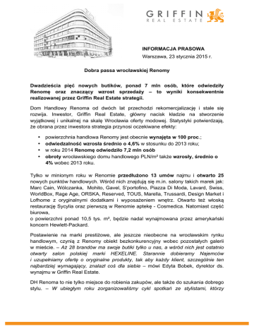 INFORMACJA PRASOWA Warszawa, 23 stycznia 2015 r. Dobra passa wrocławskiej Renomy Dwadzieścia pięć nowych butików, ponad 7 mln osób, które odwiedziły Renomę oraz znaczący wzrost sprzedaży – to wyniki konsekwentnie realizowanej przez Griffin Real Estate strategii. Dom Handlowy Renoma od dwóch lat przechodzi rekomercjalizację i stale się rozwija. Inwestor, Griffin Real Estate, główny nacisk kładzie na stworzenie wyjątkowej i unikalnej na skalę Wrocławia oferty modowej. Statystyki potwierdzają, że obrana przez inwestora strategia przynosi oczekiwane efekty: • • • • powierzchnia handlowa Renomy jest obecnie wynajęta w 100 proc.; odwiedzalność wzrosła średnio o 4,6% w stosunku do 2013 roku; w roku 2014 Renomę odwiedziło 7,2 mln osób obroty wrocławskiego domu handlowego PLN/m² także wzrosły, średnio o 4% wobec 2013 roku. Tylko w minionym roku w Renomie przedłużono 13 umów najmu i otwarto 25 nowych punktów handlowych. Wśród nich znajdują się m.in. salony takich marek jak: Marc Cain, Wólczanka, Mohito, Gavel, S’portofino, Piazza Di Moda, Lavard, Swiss, WorldBox, Rage Age, ORSKA, Reserved, TOUS, Marella, Trussardi, Design Market i Lofhome z oryginalnymi dodatkami i wyposażeniem wnętrz. Otwarto też włoską restaurację Sycylia oraz pierwszą w Renomie aptekę - Cosmedica. Natomiast część biurowa, o powierzchni ponad 10,5 tys. m², będzie nadal wynajmowana przez amerykański koncern Hewlett-Packard. Postawienie na marki prestiżowe, ale jeszcze nieobecne na wrocławskim rynku handlowym, czynią z Renomy obiekt bezkonkurencyjny wobec pozostałych galerii w mieście. – Aż 28 brandów ma swoje butiki tylko u nas, a wśród nich jest ostatnio otwarty salon polskiej marki HEXELINE. Starannie dobieramy Najemców i uzupełniamy ofertę o oryginalne produkty, tak aby każdy klient, szczególnie ten najbardziej wymagający, znalazł coś dla siebie – mówi Edyta Bobek, dyrektor ds. wynajmu w Griffin Real Estate. DH Renoma to nie tylko miejsce do robienia zakupów, ale także do szukania dobrego stylu. – W ubiegłym roku zorganizowaliśmy cykl spotkań ze stylistami, którzy dokonali wielu efektowych metamorfoz wśród naszych klientek. Nawiązaliśmy także współpracę z blogerami modowymi, którzy przygotowali ciekawe stylizacje w oparciu o ofertę butików dostępnych w Renomie – mówi Barbara Wójcik, dyrektor DH Renoma. Dom Handlowy położony przy ul. Świdnickiej to jednak nie tylko oferta modowa. Renoma razem z Griffin Art Space wspiera sztukę i wydarzenia kulturalne. W tym roku w przestrzeniach galerii odbyły się m.in. dwie wystawy: Istvana Kantor MEDIA REVOLT oraz RYSPOPIS. Renoma była także mecenasem i głównym sponsorem spektaklu w reżyserii Mai Kleczewskiej „Cienie. Eurydyka mówi:”. Po raz kolejny na dachu domu handlowego zorganizowano też Kino Letnie, które jak co roku cieszyło się dużym zainteresowaniem. O GRIFFIN GROUP Griffin Real Estate to wiodący i dynamicznie rozwijający się inwestor na rynku nieruchomości komercyjnych w Europie Środkowej i Wschodniej. W Polsce firma realizuje inwestycje we wszystkich największych miastach. W portfolio firmy znajduje się m.in. DH Renoma we Wrocławiu, Centrum Biurowe Lubicz I&II w Krakowie, katowicki Supersam, Centrum Akademickie POLONEZ w Poznaniu, Green Horizon w Łodzi, oraz wiele obiektów biurowych i handlowo-usługowych, a także działek inwestycyjnych w Warszawie. Flagową inwestycją firmy jest rewitalizacja Hali Koszyki w Warszawie i stworzenie na jej terenie wielofunkcyjnego kompleksu z częścią biurową i usługowo – restauracyjną oraz w mniejszym stopniu handlową. Projekt został nagrodzony głosami publiczności podczas Gali Eurobuild Awards 2014 w kategorii „Największe Osiągnięcie Biznesowe Roku”. Griffin Real Estate jest także laureatem prestiżowej nagrody Opportunistic Investor of the Year 2014 w międzynarodowym konkursie CEE Investment & Green Building Awards. Griffin Real Estate wspiera liczne inicjatywy społeczne, w tym Fundację Edukacyjną Jana Karskiego. W przestrzeniach należących do Griffin realizowane są również projekty artystyczne, inicjowane przez Griffin Art Space, instytucję powołaną aby wspierać i promować sztukę.