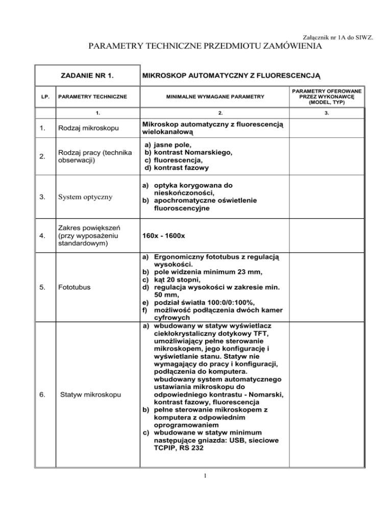 Załącznik nr 1A do SIWZ. PARAMETRY TECHNICZNE PRZEDMIOTU ZAMÓWIENIA ZADANIE NR 1. LP. MIKROSKOP AUTOMATYCZNY Z FLUORESCENCJĄ PARAMETRY TECHNICZNE MINIMALNE WYMAGANE PARAMETRY 1. 1. Rodzaj mikroskopu 2. Rodzaj pracy (technika obserwacji) 2. Mikroskop automatyczny z fluorescencją wielokanałową a) b) c) d) jasne pole, kontrast Nomarskiego, fluorescencja, kontrast fazowy 3. System optyczny a) optyka korygowana do nieskończoności, b) apochromatyczne oświetlenie fluoroscencyjne 4. Zakres powiększeń (przy wyposaŜeniu standardowym) 160x - 1600x 5. Fototubus 6. Statyw mikroskopu a) Ergonomiczny fototubus z regulacją wysokości. b) pole widzenia minimum 23 mm, c) kąt 20 stopni, d) regulacja wysokości w zakresie min. 50 mm, e) podział światła 100:0/0:100%, f) moŜliwość podłączenia dwóch kamer cyfrowych a) wbudowany w statyw wyświetlacz ciekłokrystaliczny dotykowy TFT, umoŜliwiający pełne sterowanie mikroskopem, jego konfigurację i wyświetlanie stanu. Statyw nie wymagający do pracy i konfiguracji, podłączenia do komputera. wbudowany system automatycznego ustawiania mikroskopu do odpowiedniego kontrastu - Nomarski, kontrast fazowy, fluorescencja b) pełne sterowanie mikroskopem z komputera z odpowiednim oprogramowaniem c) wbudowane w statyw minimum następujące gniazda: USB, sieciowe TCPIP, RS 232 1 PARAMETRY OFEROWANE PRZEZ WYKONAWCĘ (MODEL, TYP) 3. d) wbudowane w statyw filtry neutralne pozwalające na ustawienie minimum 16 poziomów transmisji dla światła przechodzącego, e) minimum sześciopozycyjna, automatyczna karuzela filtrów FL, szybka wymiana filtrów bez narzędzi oraz bez wyłączania mikroskopu, f) filtry fluorescencyjne do fluorochromów: - DAPI, - eGFP - o transmisji powyŜej 50 %, - Rodamin - o transmisji powyŜej 50 %, - Cy5, g) elektroniczna szybka migawka odcinająca światło fluorescencyjne bez wyłączania zasilania, h) wbudowany w statyw mikroskopu port do podłączenia aparatu cyfrowego, podział światła 50:50% 7. 8. 9. 10. Okulary Obiektywy a) 16x, pole widzenia min. 16 mm, b) z regulacjami dioptryjnymi w zakresie +/- 5 dioptrii, c) moŜliwość zastosowania okularów 10x o polu widzenia min. 23 mm Semiplanapochromatyczne do kontrastu Nomarskiego i fluorescencji, o podwyŜszonym kontraście: a) 10x/N.A. 0,30, b) 20x/N.A. 0,50, c) 40x/N.A. 0,75, d) 100x/N.A. 1,30 Oil Ogniskowanie (mechanizm) a) ustawianie ostrości w osi Z przy pomocy silnika krokowego. Krok 25 nm lub mniejszy. b) współosiowe osobne śruby mikro/makro do ustawiania ostrości, połoŜone na jednej wysokości z pokrętłami sterowania stolikiem. Misa/ uchwyt rewolwerowy a) uchwyt rewolwerowy obiektywów minimum 6-cio gniazdowy, b) automatyczny, c) wyposaŜony w indywidualne gniazda dla suwaków Nomarskiego 2 11. Stolik 12. Kondensor 13. Oświetlenie halogenowe a) posuw preparatu w osiach X i Y (ukryte prowadnice) b) skala posuwu x i y, c) stolik obracany o co najmniej 240 stopni d) regulowana o co najmniej 15 mm wysokość pokręteł sterujących ruchem preparatu, e) pokrętła po prawej stronie, f) regulowana siła obrotu pokręteł w osiach X i Y a) kondensor aplanatyczno achromatyczny, b) co najmniej ośmiopozycyjny automatyczny, c) N.A. 0,9, d) kontrast fazowy (3 pozycje), e) pryzmaty do kontrastu Nomarskiego (3 pozycje), f) jasne pole, g) ciemne pole oświetlacz halogenowy o mocy min. 100 Wat a) oświetlacz z palnikiem rtęciowym o mocy 100 Wat, b) automatyczne samoczynne justowanie/centrowanie palnika rtęciowego (po wymianie palnika oraz po kaŜdorazowym załączeniu zasilania), c) regulacja intensywności fluorescencji w zakresie od 2% do 100% 14. Oświetlenie fluorescencyjne 15. Zasilanie Zasilacz zewnętrzny 100V...240V AC/ 50...60Hz/ minimum 230VA 16. Pokrowiec Zestaw antystatyczny (pokrowiec, osłony na okulary) Aparat cyfrowy – szt. 2 a) matryca minimum 14,7 mln pikseli, b) zoom optyczny: minimum 5x, c) ogniskowa (ekwiwalent dla 35mm) [mm]: 28-140, d) jasność obiektywu [f/]: 2.8-4.5, e) stabilizacja: optyczna, f) czas otwarcia migawki: 15-1/4000 s, g) pomiar światła: matrycowy, centralnie waŜony uśredniony, punktowy, h) rozmiar LCD TFT [cale]: 3, i) autofokus: 9 punktowy AiAF, 1 punktowy AF. j) format zapisu danych: JPEG, RAW, AVI,WAVE, k) Złącza: USB 2.0, USB 2.0 Hi-Speed, TV out, l) zasilacz sieciowy 17. 3 18. 19. Oprogramowanie do aparatów cyfrowych – szt. 2. System do analizy cytogenetycznej Program do akwizycji i archiwizacji obrazu mikroskopowego umoŜliwiający obsługę aparatu cyfrowego, a) importowanie i eksportowanie obrazów w kilkunastu dostępnych formatach (min. bmp, tif, jpg, gif), b) obróbka obrazu (jasność, kontrast, gamma, kolor), c) wprowadzanie opisów do obrazów, pomiary interaktywne (długość, obwód, powierzchnia, kąt) d) moŜliwość zapamiętania ustawień aparatu, skalowanie układu, e) drukowanie a) kamera cyfrowa - rozdzielczość min.: 1390 (H) x 1040 (V) pikseli, - progresywne skanowanie, - wymiar pikseli : 6,45 um x 6,45 um - wymiary aktywnego sensora: 2/3 cala - częstość odświeŜania obrazu: 12,5/25 klatek/sek. - dynamika efektywna: ≥ 1:1500 (≥63dB) - układ zapobiegający rozogniskowaniu (Anti-Blooming) - czas ekspozycji do ok. 10 sek. - wyjście cyfrowe: 12-bit, RS-644 (LVDS), o niskim poziomie szumów b) zestaw komputerowy; procesor IntelCore TM2 Duo serii E (2,66 Hz, 333Hz FSB, 2 MB L2 cache) 1GB DDR, HD 160GB, DVDRW 16x, frame grabber, Monitor SAMSUNG SM223BW z serii Sync Master - LCD 21.6 cala c) oprogramowanie: c 1) Akwizycja obrazu – automatyczna kontrola ekspozycji i kontrastu. Definiowane przez uŜytkownika pole zbieranego obrazu. c 2) Oprogramowanie bazy danych 1. Relacyjna baza danych obsługująca wszystkie moduły systemu. 2. Funkcja Wizard – własne wydruki + kreator ideogramów. 3. Zaawansowany wydruk kariotypu. 4. Przypisywanie komórek do specyficznych klas i sortowanie według nich do dalszej analizy. 5. Jedna baza obsługująca wszystkie moduły systemu. 6. Galeria porówn