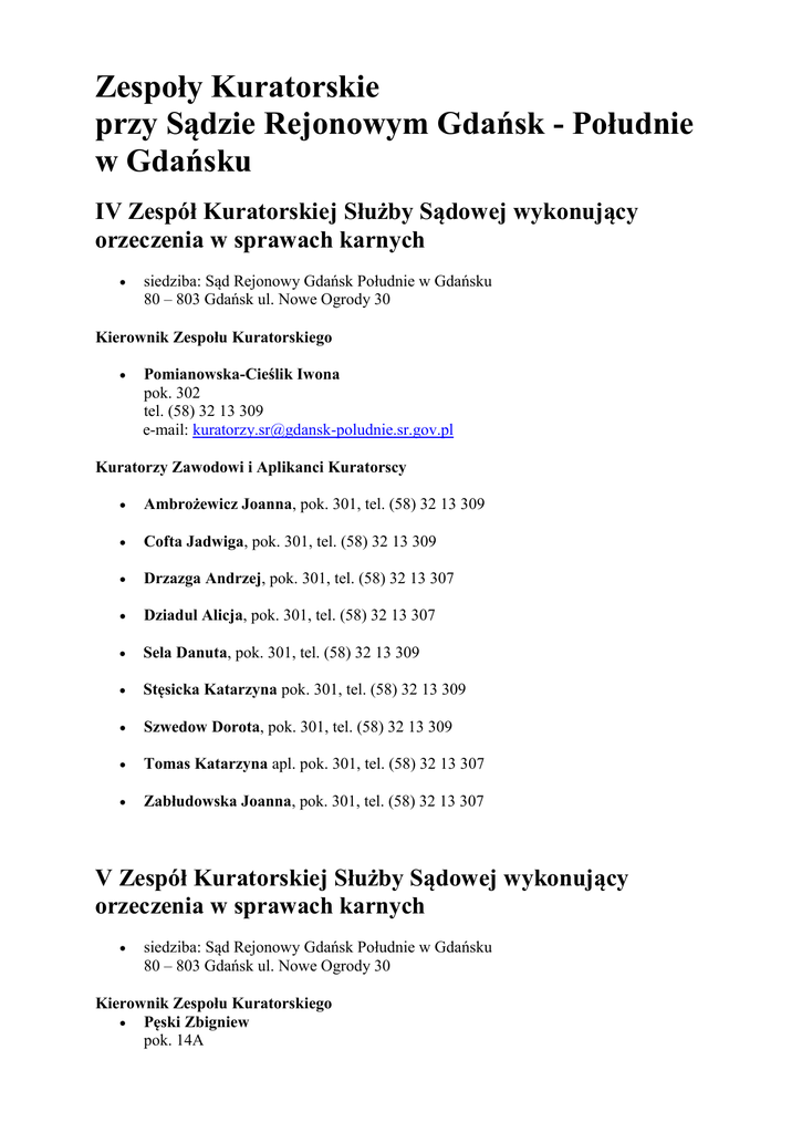 Zespoły Kuratorskie przy Sądzie Rejonowym Gdańsk - Południe w Gdańsku IV Zespół Kuratorskiej Służby Sądowej wykonujący orzeczenia w sprawach karnych siedziba: Sąd Rejonowy Gdańsk Południe w Gdańsku 80 – 803 Gdańsk ul. Nowe Ogrody 30 Kierownik Zespołu Kuratorskiego Pomianowska-Cieślik Iwona pok. 302 tel. (58) 32 13 309 e-mail: [email protected] Kuratorzy Zawodowi i Aplikanci Kuratorscy Ambrożewicz Joanna, pok. 301, tel. (58) 32 13 309 Cofta Jadwiga, pok. 301, tel. (58) 32 13 309 Drzazga Andrzej, pok. 301, tel. (58) 32 13 307 Dziadul Alicja, pok. 301, tel. (58) 32 13 307 Sela Danuta, pok. 301, tel. (58) 32 13 309 Stęsicka Katarzyna pok. 301, tel. (58) 32 13 309 Szwedow Dorota, pok. 301, tel. (58) 32 13 309 Tomas Katarzyna apl. pok. 301, tel. (58) 32 13 307 Zabłudowska Joanna, pok. 301, tel. (58) 32 13 307 V Zespół Kuratorskiej Służby Sądowej wykonujący orzeczenia w sprawach karnych siedziba: Sąd Rejonowy Gdańsk Południe w Gdańsku 80 – 803 Gdańsk ul. Nowe Ogrody 30 Kierownik Zespołu Kuratorskiego Pęski Zbigniew pok. 14A tel. (58) 32 13 352 e-mail: [email protected] Kuratorzy Zawodowi i Aplikanci Kuratorscy Babińska Ewa, pok. 14A, tel. (58) 32 13 352 Intek Jolanta, pok. 7A, tel. (58) 32 13 301 Kosecka-Wittstock Agnieszka, pok. 44, tel. (58) 32 13 300 Kucewicz Ewa, pok. 302, tel. (58) 32 13 309 Lipski Marek, pok. 7A, tel. (58) 32 13 301 Puzdrowska Beata, pok. 7A, tel. (58) 32 13 301 Skarbek Elżbieta, pok. 14A, tel. (58) 32 13 352 Spłocharski Paweł, pok. 44, tel. (58) 32 13 300 Zwoiński Łukasz apl., pok. 44, tel. (58) 32 13 300 I Zespół Kuratorskiej Służby Sądowej do wykonywania orzeczeń w sprawach rodzinnych i nieletnich siedziba: Sąd Rejonowy Gdańsk-Południe w Gdańsku 80-803 Gdańsk, ul. 3 Maja 9A Sekretariat Zespołu pokój 3.27, tel./fax. (58) 32 42 712, godziny przyjęć interesantów: poniedziałek – piątek – godz. 9.00 – 14.00 email: [email protected] Kierownik Zespołu Kuratorskiego Stegenda Alina pok. 3.30, tel. (58) 32 42 710 Kuratorzy Zawodowi Bettin-Źrubek Małgorzata pok. 3.29, tel. (58) 32 42 711 Bryl-Bernacka Bożena pok. 3.32, tel. (58) 32 42 714 Biegańska Beata pok. 3.32, tel. 58 32 42 714 Graban Tomasz pok. 3.31, tel. (58) 32 42 713 Jarocka Justyna pok. 3.30, tel. (58) 32 42 710 Kaliczyńska Wioletta pok. 3.29, tel. (58) 32 42 711 Leusz Maria pok. 3.31, tel. (58) 32 42 713 Łożyńska-Chmielowska Małgorzata pok. 3.31, tel. (58) 32 42 713 Pyrzak Marzena pok. 3.31, tel. (58) 32 42 713 II Zespół Kuratorskiej Służby Sądowej do wykonywania orzeczeń w sprawach rodzinnych i nieletnich siedziba: Sąd Rejonowy Gdańsk-Południe w Gdańsku 80-802 Gdańsk, ul. 3 maja 9A budynek C, II piętro Sekretariat Zespołu sekretarka: Jabłońska-Knut Katarzyna pok. C 3.27; tel./fax. (58) 32 42 712, email: [email protected] Godziny przyjęć interesantów: poniedziałek-piątek - godz. 9.00-14.00 Kierownik Zespołu Kuratorskiego Szydłowski Jerzy pok. C 2.29, tel. (58) 32 42 715 e-mail: [email protected] Kuratorzy Zawodowi i Aplikanci Kuratorscy Barczewska Mirosława, pok. C 2.28, tel. (58) 32 42 718 e-mail: [email protected] Bojko Ewa pok. C 2.27, tel. (58) 32 42 717 e-mail: [email protected] Ciszewska Grażyna pok. C 2.30, tel. (58) 32 42 716 e-mail: [email protected] Galon Magdalena pok. C 2.30, tel. (58) 32 42 716 e-mail: [email protected] Sopek Agata pok. C 2.30, tel. (58) 32 42 716 e-mail: [email protected] Struciński Norbert apl. pok. C 2.30, tel. (58) 32 42 716 e-mail: [email protected] Szulczewska Joanna pok. C 2.28, tel. (58) 32 42 718 e-mail: [email protected] Szyc Ewa pok. C 2.27, tel. (58) 32 42 717 e-mail: [email protected] Wendt Małgorzata pok. C 2.28, tel. (58) 32 42 718 e-mail: [email protected] Wincesewicz Daniela pok. C 2.27, tel. (58) 32 42 717 e-mail: [email protected] Wiśniewska Anna pok. C 2.28, tel. (58) 32 42 718 e-mail: [email protected] III Zespół Kuratorskiej Służby Sądowej do wykonywania orzeczeń w sprawach rodzinnych i nieletnich siedziba: Sąd Rejonowy Gdańsk Południe w Gdańsk 80-803 Gdańsk, ul. 3 Maja 9A budynek C III piętro Sekretariat Zespołu pok. C 3.27, tel./fax. (58) 32 42 712 godziny przyjęć sekretariatu: poniedziałek - piątek 9.00- 14.00 email: [email protected] Kierownik Zespołu Kuratorskiego Krzemińska Beata pok. C 1.20, tel. (58) 32 42 720 Kuratorzy Zawodowi i Aplikanci Kuratorscy Barcz Hanna pok. C 1.24, tel. (58) 32 42 723 Brylowski Franciszek pok. C 1.22, tel. (58) 32 42 721 Czarnowska Marlena apl. pok. C 1.25, tel. (58) 32 42 724 Danowska Dorota pok. C 1.26, tel. (58) 32 42 722 Grabowska-Gorlewicz Ilona pok. C 1.25, tel. (58) 32 42 724 Gorzkowska Natalia apl. pok. C 1.22, tel. (58) 32 42 721 Kondracka Jadwiga C 1.26, tel. (58) 32 42 722 Kusiak Regina pok. C 1.26, tel. (58) 32 42 722 Mieszczak Iwona pok. C 1.22, tel. (58) 32 42 721 Milewczyk-Radziun Magdalena pok. C 1.22, tel. (58) 32 42 721 Radecka Elżbieta pok. C 1.26, tel. (58) 32 42 722 Sławek - Żebrowska Elżbieta pok. C 1.22, tel. (58) 32 42 721 Specjał Edyta pok. C 1.24, tel. (58) 32 42 723 Wierciszewski Witold pok. C 1.24, tel. (58) 32 42 723