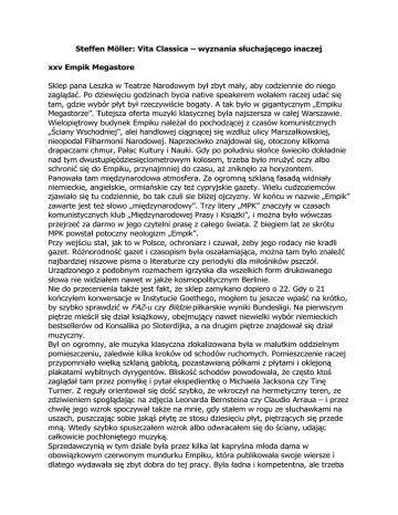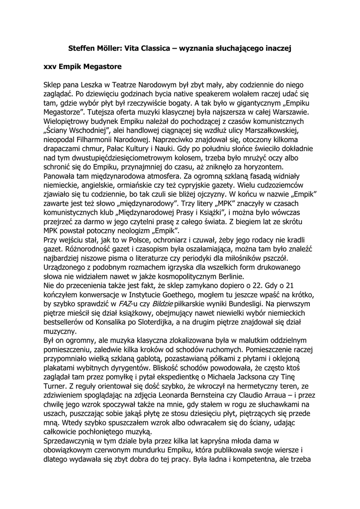 Steffen Möller: Vita Classica – wyznania słuchającego inaczej xxv Empik Megastore Sklep pana Leszka w Teatrze Narodowym był zbyt mały, aby codziennie do niego zaglądać. Po dziewięciu godzinach bycia native speakerem wolałem raczej udać się tam, gdzie wybór płyt był rzeczywiście bogaty. A tak było w gigantycznym „Empiku Megastorze”. Tutejsza oferta muzyki klasycznej była najszersza w całej Warszawie. Wielopiętrowy budynek Empiku należał do pochodzącej z czasów komunistcznych „Ściany Wschodniej”, alei handlowej ciągnącej się wzdłuż ulicy Marszałkowskiej, nieopodal Filharmonii Narodowej. Naprzeciwko znajdował się, otoczony kilkoma drapaczami chmur, Pałac Kultury i Nauki. Gdy po południu słońce świeciło dokładnie nad tym dwustupięćdziesięciometrowym kolosem, trzeba było mrużyć oczy albo schronić się do Empiku, przynajmniej do czasu, aż zniknęło za horyzontem. Panowała tam międzynarodowa atmosfera. Za ogromną szklaną fasadą widniały niemieckie, angielskie, ormiańskie czy też cypryjskie gazety. Wielu cudzoziemców zjawiało się tu codziennie, bo tak czuli sie bliżej ojczyzny. W końcu w nazwie „Empik” zawarte jest też słowo „międzynarodowy”. Trzy litery „MPK” znaczyły w czasach komunistycznych klub „Międzynarodowej Prasy i Książki”, i można było wówczas przejrzeć za darmo w jego czytelni prasę z całego świata. Z biegiem lat ze skrótu MPK powstał potoczny neologizm „Empik”. Przy wejściu stał, jak to w Polsce, ochroniarz i czuwał, żeby jego rodacy nie kradli gazet. Różnorodność gazet i czasopism była oszałamiająca, można tam było znaleźć najbardziej niszowe pisma o literaturze czy periodyki dla miłośników pszczół. Urządzonego z podobnym rozmachem igrzyska dla wszelkich form drukowanego słowa nie widziałem nawet w jakże kosmopolitycznym Berlinie. Nie do przecenienia także jest fakt, że sklep zamykano dopiero o 22. Gdy o 21 kończyłem konwersacje w Instytucie Goethego, mogłem tu jeszcze wpaść na krótko, by szybko sprawdzić w FAZ-u czy Bildzie piłkarskie wyniki Bundesligi. Na pierwszym piętrze mieścił się dział książkowy, obejmujący nawet niewielki wybór niemieckich bestsellerów od Konsalika po Sloterdijka, a na drugim piętrze znajdował się dział muzyczny. Był on ogromny, ale muzyka klasyczna zlokalizowana była w malutkim oddzielnym pomieszczeniu, zaledwie kilka kroków od schodów ruchomych. Pomieszczenie raczej przypomniało wielką szklaną gablotą, pozastawianą półkami z płytami i oklejoną plakatami wybitnych dyrygentów. Bliskość schodów powodowała, że często ktoś zaglądał tam przez pomyłkę i pytał ekspedientkę o Michaela Jacksona czy Tinę Turner. Z reguły orientował się dość szybko, że wkroczył na hermetyczny teren, ze zdziwieniem spoglądając na zdjęcia Leonarda Bernsteina czy Claudio Arraua – i przez chwilę jego wzrok spoczywał także na mnie, gdy stałem w rogu ze słuchawkami na uszach, puszczając sobie jakąś płytę ze stosu dziesięciu płyt, piętrzących się przede mną. Wtedy szybko spuszczałem wzrok albo odwracałem się do ściany, udając całkowicie pochłoniętego muzyką. Sprzedawczynią w tym dziale była przez kilka lat kapryśna młoda dama w obowiązkowym czerwonym mundurku Empiku, która publikowała swoje wiersze i dlatego wydawała się zbyt dobra do tej pracy. Była ładna i kompetentna, ale trzeba się było wobec niej niezwykle grzecznie zachowywać, by tak kompetencja się ujawniła. Prawdopodobnie marzyła po cichu o własnym festiwalu literatury gdzieś w Galicji czy na Mazurach. * Niestety humorzasta poetka często była chora. Stawiało mnie to za każdym razem w kłopotliwej sytuacji, bo, by posłuchać płyt, musiałem wyjść na zewnątrz do działu z muzyką rozrywkową. Była tam okrągła lada, jaskrawo oświetlona silnymi reflektorami. Stanowiła serce całego działu, i siedział za nią długowłosy chłopczyk, niespełna dwudziestoletni, którego zadaniem było zdejmowanie celofanowych powłoczek z płyt CD i puszczanie muzyki niezdecydowanym klientom. Żeby uprzyjemnić sobie tę żmudną pracę, prowadził z nimi luźne pogawędki o muzyce: Metallica podobno gra zawsze na początku swoich koncertów kawałki Ennia Morricone. Dasz wiarę? Przy czym marszczył z obrzydzeniem twarz, jakby wpadł na trop najbardziej gorszącego skandalu. Kiedy podałem mu do rozpakowania płytę z muzyką klasyczną, zamilkł, zlustrował mnie krótkim spojrzeniem, zdjął celofanową folię i wyjął płytę z opakowania, trzymając ją końcami palców, po czym zapytał, czy chcę zabrać książeczkę. Następnie przydzielił mi jedno z osiemnastu stanowisk: - Trójka. Nigdy nie komentował wybranych przeze mnie płyt, choćby zdawkowym: „A, to wczesny Brahms” czy „Jeśli koncerty fortepianowe Mozarta, to tylko grane przez Alfreda Brendla”. Kiedy po przesłuchaniu zwracałem mu płytę, pytał: - Bierze ją pan? Do wszystkich innych klientów mówił konsekwentnie na ty, tylko do mnie na pan. Gdy odpowiadałem „tak”, wkładał płytę do przezroczystego antykradzieżowego pojemnika i oddawał mi bez słowa; kiedy mówiłem „nie” odkładał ją bez słowa na bok, gdzie piętrzyły się niezakupione kompakty. Następnie znów zwracał się wesoło do pierwszego lepszego klienta, rzucając nerwowo nożyk do folii na stół. – Freedom to Love mają przyjechać jesienią do Katowic, jedziesz? Ani trochę nie zyskałem w jego oczach szacunku, gdy pewnego dnia przyszedłem z płytą Pearl Jam. Nadal witał mnie z obojętną twarzą. Nie dał się zwieść takimi sztuczkami. Dla niego już na zawsze byłem dziadkiem z działu klasycznego. * Rzecz jasna, że ucieszyłem się bardzo, gdy kapryśna poetka wróciła do pracy. Mogłem znów stać w dziale klasycznym ze słuchawkami na uszach, żeby testować nieznane mi nowości. Stałem przy ścianie, nieobecnym wzrokiem sk