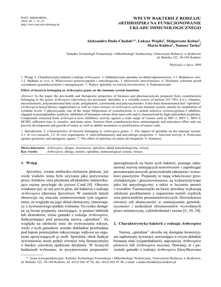 WP£YW BAKTERII Z RODZAJU ARTHROSPIRA NA FUNKCJONOWANIE UK£ADU IMMUNOLOGICZNEGO POST. MIKROBIOL., 2010, 49, 1, 1523 http://www.pm.microbiology.pl Aleksandra Duda-Chodak*1, £ukasz Wajda1, Ma³gorzata Kobus1, Maria Kubica1, Tomasz Tarko1 1 Katedra Technologii Fermentacji i Mikrobiologii Technicznej, Uniwersytet Rolniczy w Krakowie ul. Balicka 122, 30-149 Kraków Wp³ynê³o w lipcu 2009 1. Wstêp. 2. Charakterystyka bakterii z rodzaju Arthrospira. 3. Oddzia³ywanie spiruliny na uk³ad odpornociowy. 3.1. Badania in vitro. 3.2. Badania in vivo. 4. W³aciwoci przeciwzapalne i antyalergiczne. 5 Aktywnoæ antywirusowa. 6. Dzia³anie ochronne przed czynnikami genotoksycznymi i mutagennymi. 7. Wp³yw spiruliny na rozwój nowotworów. 8. Podsumowanie Effect of bacteria belonging to Arthrospira genus on the immune system functions Abstract: In the paper the pro-health and therapeutic properties of biomass and pharmaceuticals prepared from cyanobacteria belonging to the genus Arthrospira (Spirulina) are presented. Spirulina is a valuable source of protein (5570% d.w.), vitamins, microelements, polyunsaturated fatty acids, polyphenols, carotenoids and polysaccharides. It has been demonstrated that spirulina (Arthrospira-based dietary supplements) as well as water extracts of Arthrospira activate immune system, mainly by modulation of cytokine levels. C-phycocyanin, one of the major biliproteins of cyanobacteria, is a potent selective cyclooxygenase-2 inhibitor, engaged in prostaglandins synthesis, inhibition of histamine release from mast cells and is characterized by high antioxidant properties. Compounds extracted from Arthrospira have inhibitory activity against a wide range of viruses such as HIV-1, HSV-1, HSV-2, HCMV, influenza type A, measles, and many more. Extracts from cyanobacteria have antimutagenic and anticancer effect and can prevent development and growth of tumor as well as inhibit metastasis or proliferation of cancer cells. 1. Introduction. 2. Characteristics of bacteria belonging to Arthrospira genus. 3. The impact of spirulina on the immune system. 3.1. In vivo research. 3.2. In vitro experiments. 4. Anti-inflammatory and anti-allergic properties. 5. Antiviral activity. 6. Protection against genotoxic and mutagenic agents. 7. The effect of spirulina on tumor development. 8. Summary S³owa kluczowe: Arthrospira, alergia, nowotwory, spirulina, uk³ad immunologiczny, wirusy Key words: Arthrospira, allergy, tumors, spirulina, immunological system, viruses 1. Wstêp Spirulina, zwana niebiesko-zielonym glonem, ju¿ wiele wieków temu by³a u¿ywana jako po¿ywienie przez Azteków oraz plemiona afrykañskie zamieszkuj¹ce rejony przyleg³e do jeziora Czad [9]. Obecnie wiadomo ju¿, ¿e nie jest to glon, ale bakteria z rodzaju Arthrospira (dawniej Spirulina). W ostatnich latach obserwuje siê znaczne zainteresowanie tym organizmem, ze wzglêdu na jego sk³ad chemiczny, interesuj¹cy z ¿ywieniowego punktu widzenia. Na rynku dostêpne s¹ liczne preparaty zawieraj¹ce, w postaci tabletek lub ekstraktów, ró¿ne gatunki z rodzaju Arthrospira, funkcjonuj¹ce pod potoczn¹ nazw¹ spirulina. Ze wzglêdu na zdolnoæ sinic do wytwarzania toksyn, wiele z tych gatunków zosta³o dok³adnie przebadane pod k¹tem potencjalnie toksycznego wp³ywu na organizm spo¿ywaj¹cych je osób. Spirulina, obok funkcji ¿ywieniowej mo¿e pe³niæ równie¿ rolê farmaceutyku o bardzo szerokim spektrum dzia³ania. W licznych badaniach wykazano, ¿e przyjmowanie preparatów sporz¹dzonych na bazie tych bakterii, pomaga zahamowaæ rozwój istniej¹cych nowotworów i zapobiegaæ powstawaniu nowych, przeciwdzia³a zaka¿eniu i wzrostowi paso¿ytów. Preparaty te maj¹ w³aciwoci przeciwbakteryjne i przeciwwirusowe, s¹ wykorzystywane jako lek antyalergiczny, a tak¿e w leczeniu anemii i wrzodów. Farmaceutyki na bazie spiruliny wykazuj¹ zdolnoæ poch³aniania z organizmu metali ciê¿kich oraz pierwiastków promieniotwórczych. Dowiedziono równie¿ ich skutecznoci w zmniejszaniu genotoksycznoci i uszkodzeñ chromosomów wywo³anych przez mitomycynê, cyklofosfamid i uretan [5, 10, 34]. 2. Charakterystyka bakterii z rodzaju Arthrospira Nazw¹ spirulina okrela siê dostêpne komercyjnie suplementy ¿ywnoci, zawieraj¹ce w swym sk³adzie biomasê sinic (cyjanobakterii), najczêciej Arthrospira platensis lub Arthrospira maxima. Dawniej, te i pozosta³e gatunki z rodzaju Arthrospira klasyfikowano * Autor korespondencyjny: Katedra Technologii Fermentacji i Mikrobiologii Technicznej, Uniwersytet Rolniczy w Krakowie, ul. Balicka 122, 30-149 Kraków, tel. (012) 662 47 92, fax. (012) 662 47 98, e-mail: [email protected] 16 ALEKSANDRA DUDA-CHODAK, £UKASZ WAJDA, MA£GORZATA KOBUS, MARIA KUBICA, TOMASZ TARKO jako rodzaj Spirulina. Obecnie przyjmuje siê, ¿e stanowi¹ one odrêbny rodzaj [46], niemniej jednak stara nazwa jest bardzo popularna i nadal stosowana, szczególnie w jêzyku potocznym. Spirulina jest bogatym ród³em bia³ka szacuje siê, ¿e stanowi ono 5570% suchej masy. Zawiera te¿ witaminy z grupy B (B1, B2, B3, B6, B9, B12), witaminê D, kwas askorbinowy, tokoferole. Biomasa tych sinic jest bogata w nienasycone kwasy t³uszczowe, w tym T-3 i T-6. Do najwa¿niejszych (do 30%) nale¿y kwas (-linolenowy (GLA), wystêpuj¹cy tak¿e w mleku karmi¹cych matek, bêd¹cy prekursorem prostaglandyny E1. Ponadto, spirulina zapewnia tak¿e kwas linolenowy (ALA), alfa-linolowy (LA), stearydynowy (SDA), eikozapentaenowy (EPA), dokozaheksaenowy (DHA) oraz arachidonowy (AA). Spirulina jest bogatym ród³em wielu minera³ów: potasu, wapnia, chromu, miedzi, ¿elaza, magnezu, manganu, fosforu, selenu, sodu i cynku. Zawiera liczne barwniki, w tym chlorofil a, ksantofile, karotenoidy (szczególnie bogata jest w $-karoten) oraz inne substancje o w³aciwociach antyoksydacyjnych (fikocyjaniny, taniny itd.) [3, 4, 37]. Stanowi¹c tak bogate ród³o ró¿norodnych sk³adników od¿ywczych i bioaktywnych, spirulina wykazuje szereg w³