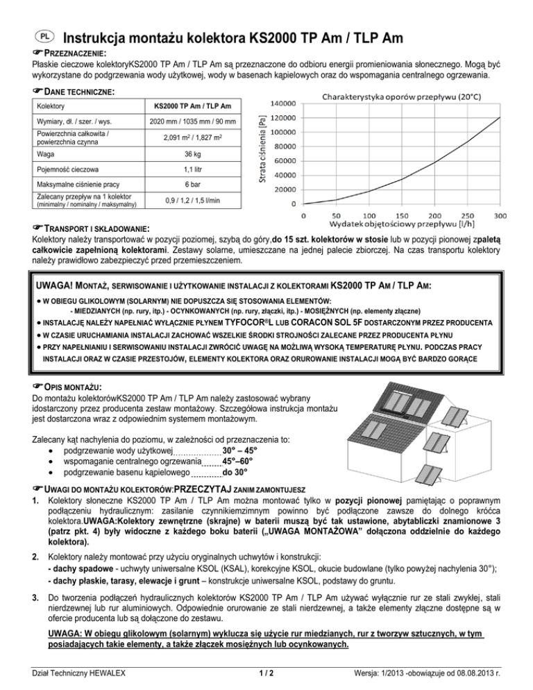 Instrukcja montażu kolektora KS2000 TP Am / TLP Am PRZEZNACZENIE: Płaskie cieczowe kolektoryKS2000 TP Am / TLP Am są przeznaczone do odbioru energii promieniowania słonecznego. Mogą być wykorzystane do podgrzewania wody użytkowej, wody w basenach kąpielowych oraz do wspomagania centralnego ogrzewania. DANE TECHNICZNE: Kolektory KS2000 TP Am / TLP Am Wymiary, dł. / szer. / wys. 2020 mm / 1035 mm / 90 mm Powierzchnia całkowita / powierzchnia czynna 2,091 m2 / 1,827 m2 Waga 36 kg Pojemność cieczowa 1,1 litr Maksymalne ciśnienie pracy 6 bar Zalecany przepływ na 1 kolektor (minimalny / nominalny / maksymalny) 0,9 / 1,2 / 1,5 l/min TRANSPORT I SKŁADOWANIE: Kolektory należy transportować w pozycji poziomej, szybą do góry,do 15 szt. kolektorów w stosie lub w pozycji pionowej zpaletą całkowicie zapełnioną kolektorami. Zestawy solarne, umieszczane na jednej palecie zbiorczej. Na czas transportu kolektory należy prawidłowo zabezpieczyć przed przemieszczeniem. UWAGA! MONTAŻ, SERWISOWANIE I UŻYTKOWANIE INSTALACJI Z KOLEKTORAMI KS2000 TP AM / TLP AM: W OBIEGU GLIKOLOWYM (SOLARNYM) NIE DOPUSZCZA SIĘ STOSOWANIA ELEMENTÓW: - MIEDZIANYCH (np. rury, itp.) - OCYNKOWANYCH (np. rury, złączki, itp.) - MOSIĘŻNYCH (np. elementy złączne) INSTALACJĘ NALEŻY NAPEŁNIAĆ WYŁĄCZNIE PŁYNEM TYFOCOR®L LUB CORACON SOL 5F DOSTARCZONYM PRZEZ PRODUCENTA W CZASIE URUCHAMIANIA INSTALACJI ZACHOWAĆ WSZELKIE ŚRODKI STROJNOŚCI ZALECANE PRZEZ PRODUCENTA PŁYNU PRZY NAPEŁNIANIU I SERWISOWANIU INSTALACJI ZWRÓCIĆ UWAGĘ NA MOŻLIWĄ WYSOKĄ TEMPERATURĘ PŁYNU. PODCZAS PRACY INSTALACJI ORAZ W CZASIE PRZESTOJÓW, ELEMENTY KOLEKTORA ORAZ ORUROWANIE INSTALACJI MOGĄ BYĆ BARDZO GORĄCE OPIS MONTAŻU: Do montażu kolektorówKS2000 TP Am / TLP Am należy zastosować wybrany idostarczony przez producenta zestaw montażowy. Szczegółowa instrukcja montażu jest dostarczona wraz z odpowiednim systemem montażowym. Zalecany kąt nachylenia do poziomu, w zależności od przeznaczenia to: podgrzewanie wody użytkowej 30° – 45° wspomaganie centralnego ogrzewania 45°–60° podgrzewanie basenu kąpielowego do 30° UWAGI DO MONTAŻU KOLEKTORÓW:PRZECZYTAJ ZANIM ZAMONTUJESZ 1. Kolektory słoneczne KS2000 TP Am / TLP Am można montować tylko w pozycji pionowej pamiętając o poprawnym podłączeniu hydraulicznym: zasilanie czynnikiemzimnym powinno być podłączone zawsze do dolnego króćca kolektora.UWAGA:Kolektory zewnętrzne (skrajne) w baterii muszą być tak ustawione, abytabliczki znamionowe 3 (patrz pkt. 4) były widoczne z każdego boku baterii („UWAGA MONTAŻOWA” dołączona oddzielnie do każdego kolektora). 2. Kolektory należy montować przy użyciu oryginalnych uchwytów i konstrukcji: - dachy spadowe - uchwyty uniwersalne KSOL (KSAL), korekcyjne KSOL, okucie budowlane (tylko powyżej nachylenia 30°); - dachy płaskie, tarasy, elewacje i grunt – konstrukcje uniwersalne KSOL, podstawy do gruntu. 3. Do tworzenia podłączeń hydraulicznych kolektorów KS2000 TP Am / TLP Am używać wyłącznie rur ze stali zwykłej, stali nierdzewnej lub rur aluminiowych. Odpowiednie orurowanie ze stali nierdzewnej, a także elementy złączne dostępne są w ofercie producenta lub są dołączone do zestawu. UWAGA: W obiegu glikolowym (solarnym) wyklucza się użycie rur miedzianych, rur z tworzyw sztucznych, w tym posiadających takie elementy, a także złączek mosiężnych lub ocynkowanych. Dział Techniczny HEWALEX 1/2 Wersja: 1/2013 -obowiązuje od 08.08.2013 r. Zalecana minimalna średnica rur przewodowych SNP przy podłączaniu pojedynczej baterii kolektorówto DN16: Ilość kolektorów KS2000 TP Am / TLP Am Dopuszczalna długość orurowania (zasilanie + powrót)SNP-DN16 2 szt. 120 m 3 szt. 60 m 4 szt. 30 m 5 szt. 20 m Dla większej liczby kolektorów średnicę i długość orurowania należy skonsultować z producentem. 4. Kolektory KS2000 TP Am / TLP Am możnałączyć ze sobą przy użyciu zestawów przyłączeniowych ZPKS Am, dostarczonych przez producenta, w baterię do 8 sztuk, podłączoną do instalacji naprzemiennie (rys. 5.1a). Przy baterii do 5 sztuk, ze względu na meandryczną budowę absorbera, dopuszcza się również podłączenie jednostronne (rys. 5.1b).Należy zwrócić uwagę na właściwe umiejscowienie tabliczek znamionowych. Dostępne są następujące możliwości połączeń: 4.1.Połączenia szeregowe dla kolektorów KS2000 TP Am / TLP Am a) Połączenie szeregowe dwustronne (1 – zasilanie, 2 – powrót, 3 – tabliczka znamionowa) b) Połączenie szeregowe jednostronne (1 – zasilanie, 2 – powrót, 3 – tabliczka znamionowa) 4.2.Połączenia równoległe dla kolektorów KS2000 TP Am / TLP Am – zasilanie, 2 – powrót, 3 – tabliczka znamionowa ) 5. W instalacjach składających się z powyżej 8 (1szt. kolektorów czyli odpowiednio powyżej 14,6 m² powierzchni czynnej, kolektory należy łączyć ze sobą w baterie o takiej samej wielkości, np. 2x 5 szt., 2x 6 szt., 3x 4 szt., 2x 8 szt., 4x 5 szt., itp. Do łączenia kolektorów pomiędzy sobą w poszczególnych bateriach, wykorzystać specjalne zestawy przyłączeniowe ZPKS Am, dostarczone przez producenta. Następnie baterie kolektorów należy łączyć w układzie równoległym z zachowaniem zasady Tichelmann’a (patrz pkt 4.2).Montaż kolektorów w dużych instalacjach zaleca się przeprowadzać przy użyciu oryginalnych uchwytów dostarczonych przez producenta (patrz. pkt 2). 6. Niezależnie od miejsca zamontowania kolektorów zaleca się podłączenie metalowych elementów mocowania oraz samego kolektora do instalacji odgromowej wykonanej zgodnie z przepisami obowiązującymi dla jej wykonania. 7. Konstrukcja kolektora oraz dostarczone wraz z nim systemy mocujące zapewniają wytrzymałość na wiatr o ciśnieniu 550 Pa, z uwzględnieniem wszelkich dodatkowych przeciążeń. Należy także zwrócić uwagę na prawidłowe zamontowanie systemu montażowego do konstrukcji dachu lub innego