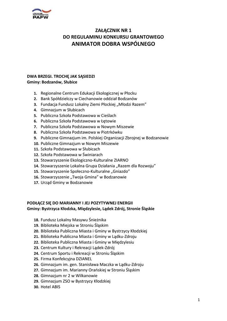 ZAŁĄCZNIK NR 1 DO REGULAMINU KONKURSU GRANTOWEGO ANIMATOR DOBRA WSPÓLNEGO DWA BRZEGI. TROCHĘ JAK SĄSIEDZI Gminy: Bodzanów, Słubice 1. 2. 3. 4. 5. 6. 7. 8. 9. 10. 11. 12. 13. 14. 15. 16. 17. Regionalne Centrum Edukacji Ekologicznej w Płocku Bank Spółdzielczy w Ciechanowie oddział Bodzanów Fundacja Fundusz Lokalny Ziemi Płockiej „Młodzi Razem” Gimnazjum w Słubicach Publiczna Szkoła Podstawowa w Cieślach Publiczna Szkoła Podstawowa w Łętowie Publiczna Szkoła Podstawowa w Nowym Miszewie Publiczna Szkoła Podstawowa w Piotrkówku Publiczne Gimnazjum im. Polskiej Organizacji Zbrojnej w Bodzanowie Publiczne Gimnazjum w Nowym Miszewie Szkoła Podstawowa w Słubicach Szkoła Podstawowa w Świniarach Stowarzyszenie Ekologiczno-Kulturalne ZIARNO Stowarzyszenie Lokalna Grupa Działania „Razem dla Rozwoju” Stowarzyszenie Społeczno-Kulturalne „Gniazdo” Stowarzyszenie „Twoja Gmina” w Bodzanowie Urząd Gminy w Bodzanowie PODŁĄCZ SIĘ DO MARIANNY I JEJ POZYTYWNEJ ENERGII Gminy: Bystrzyca Kłodzka, Międzylesie, Lądek Zdrój, Stronie Śląskie 18. 19. 20. 21. 22. 23. 24. 25. 26. 27. 28. 29. 30. Fundusz Lokalny Masywu Śnieżnika Biblioteka Miejska w Stroniu Śląskim Biblioteka Publiczna Miasta i Gminy w Bystrzycy Kłodzkiej Biblioteka Publiczna Miasta i Gminy w Lądku-Zdroju Biblioteka Publiczna Miasta i Gminy w Międzylesiu Centrum Kultury i Rekreacji Lądek-Zdrój Centrum Sportu i Rekreacji w Stroniu Śląskim Firma Konfekcyjna DZIANEL Gimnazjum im. gen. Stanisława Maczka w Lądku-Zdroju Gimnazjum im. Marianny Orańskiej w Stroniu Śląskim Gimnazjum nr 2 w Wilkanowie Gimnazjum ZSO w Bystrzycy Kłodzkiej Hotel ABIS 1 31. 32. 33. 34. 35. 36. 37. 38. 39. 40. 41. 42. 43. 44. 45. 46. 47. 48. 49. 50. 51. 52. 53. 54. 55. 56. 57. 58. Liceum Ogólnokształcące w Bystrzycy Kłodzkiej Liceum Ogólnokształcące Lądek-Zdrój Miejsko Gminny Ośrodek Kultury w Bystrzycy Kłodzkiej Miejsko Gminny Ośrodek Kultury w Międzylesiu Muzeum Filumenistyczne Państwowa Szkoła Muzyczna I stopnia w Bystrzycy Kłodzkiej Samorządowe Gimnazjum przy Zespole Szkolno-Przedszkolnym w Domaszkowie Stowarzyszenie „Artystyka” Stowarzyszenie Przyjaciół Bystrzycy Kłodzkiej Stowarzyszenie „Zdanie” Szkoła Podstawowa nr 1 w Bystrzycy Kłodzkiej Szkoła Podstawowa nr 2 w Bystrzycy Kłodzkiej Szkoła Podstawowa w Długopolu Dolnym Szkoła Podstawowa w Domaszkowie Szkoła Podstawowa w Gorzanowie Szkoła Podstawowa w Lądku-Zdroju Szkoła Podstawowa w Międzylesiu Szkoła Podstawowa w Pławnicy Szkoła Podstawowa w Starej Łomnicy Szkoła Podstawowa w Stroniu Śląskim Szkoła Podstawowa w Wilkanowie Urząd Gminy Międzylesie Urząd Gminy Stronie Śląskie Urząd Miasta i Gminy Bystrzyca Kłodzka Urząd Miasta i Gminy Lądek-Zdrój Zakład fotograficzny Leszek Scelina Zespół Szkół Ponadgimnazjalnych Bystrzyca Kłodzka Zespół Szkół Ponadgimnazjalnych Stronie Śląskie Z RĘCZNIKIEM I PIOSENKĄ PRZEZ ŻYCIE Gminy: Hajnówka, Bielsk Podlaski 59. Stowarzyszenie Samorządów Euroregionu Puszcza Białowieska 60. Fundacja Wspomagania Edukacji, Integracji i Terapii Osób Niepełnosprawnych „Kaja” 61. 62. 63. 64. 65. 66. 67. z Hajnówki Fundusz Lokalny na rzecz Rozwoju Społecznego z Widowa Ochotnicza Straż Pożarna z Parcewa Starostwo Powiatowe w Hajnówce Starostwo Powiatowe w Bielsku Podlaskim Stowarzyszenie „Nasza Ojcowizna” z Parcewa Urząd Gminy w Bielsku Podlaskim Zespół Szkół Specjalnych w Hajnówce 2 WOLONTARIAT BIESZCZADZKI – WSPÓLNIE DLA DOBRA BIESZCZADÓW Gminy: Lesko, Ustrzyki Dolne 68. 69. 70. 71. 72. 73. 74. 75. 76. 77. Fundacja Bieszczadzka Bieszczadzki Zespół Szkół Zawodowych w Ustrzykach Dolnych Bieszczadzkie Centrum Charytatywne „Caritas" w Ustrzykach Dolnych Gościnne Gospodarstwa Galicyjskie Starostwo Powiatowe w Ustrzykach Dolnych – Centrum Pomocy Rodzinie Stowarzyszenie „Edukacja i Rozwój” Stowarzyszenie Kobiet Bieszczadzkich „Nasza Szansa” Technikum Leśne Lesko Urząd Miasta i Gminy Lesko – Bieszczadzki Dom Kultury Urząd Miejski w Ustrzykach Dolnych – Bieszczadzkie Centrum Informacji Turystycznej i Promocji TURYSTYKA WYJĄTKOWĄ WIZYTÓWKĄ ZIEMI KAMIENNOGÓRSKIEJ Gminy: Lubawka, Kamienna Góra, Marciszów 78. 79. 80. 81. 82. 83. 84. Stowarzyszenie Społeczno-Kulturalno „Granica” w Lubawce Barbara Jochymek Ewa Dębska Oddział Ziemi Kamiennogórskiej PTTK Sławomira Klijanowicz-Marciniec Stowarzyszenie LGD „Kwiat Lnu” Stowarzyszenie Turystyczno-Kulturalne „Porta Lubavia” PRZESTRZEŃ FAKTYCZNIE PUBLICZNA Gminy: Malechowo, Koszalin Fundacja Nauka dla Środowiska Alicja Rogala Fundacja „Odnowa Wsi" z Malechowa Galeria Scena Gimnazjum w Malechowie Koszalińska Biblioteka Publiczna im. Joachima Lelewela Miasto Tygodnik Koszaliński, PerMedia S.A Politechnika Koszalińska – Instytut Wzornictwa Politechniki Koszalińskiej Politechnika Koszalińska – Wydział Budownictwa i Inżynierii Środowiska, katedra Biologii Środowiskowej 94. Polskie Radio Regionalna Rozgłośnia w Koszalinie 95. Stowarzyszenie na rzecz Dzieci Malechowa „Jelonek" 96. Stowarzyszenie Miłośników Pradoliny Grabowej w Paprotach 97. Telewizja Kablowa Koszalin 98. Urząd Gminy w Malechowie 99. Urząd Miejski w Koszalinie 85. 86. 87. 88. 89. 90. 91. 92. 93. 3 100. Urząd Miejski w Koszalinie, Wydział Architektury i Urbanistyki 101. Zarząd Dróg Miejskich w Koszalinie AKADEMIA MŁODZIEŻOWYCH INNOWATORÓW Gmina Nidzica 102. Nidzicki Fundusz Lokalny 103. Bank Spółdzielczy w Nidzicy 104. Centrum Doradcze Programów Pomocowych 105. Nasza Gazeta Nidzicka 106. Nidzicka Fundacja Rozwoju „NIDA” 107. Nidzickie Stowarzyszenie PRZYMIERZE 108. Przedsiębiorstwo Społeczne „Garncarska Wioska” Sp. z o.o. 109. Urząd Miejski w Nidzicy 110. Zespół Szkół Ogólnokształcących w Nidzicy RAKSZAWA – NOWY PRZYSTANEK NA TURYSTYCZNYM SZLAKU Gmina Rakszawa 111. Fundacja Fundusz Lokalny w Leżajsku 112. Gazeta Łańcucka 113. Gminny Ośrodek Kultury i Cz