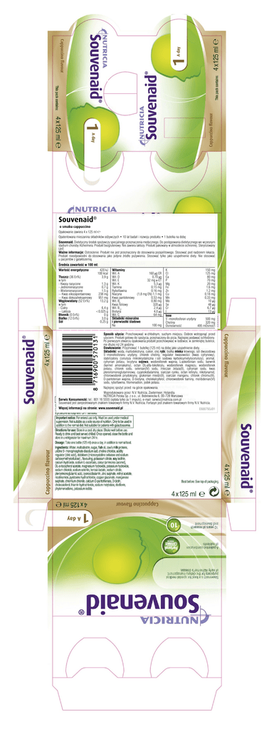 Souvenaid® o smaku cappuccino Opakowanie zawiera 4 x 125 ml ℮ Opatentowana mieszanina składników odżywczych • 10 lat badań i rozwoju produktu • 1 butelka na dobę Souvenaid. Dietetyczny środek spożywczy specjalnego przeznaczenia medycznego. Do postępowania dietetycznego we wczesnym stadium choroby Alzheimera. Produkt bezglutenowy. Nie zawiera laktozy. Produkt pakowany w atmosferze ochronnej. Sterylizowany UHT. Ważne informacje: Ostrzeżenie: Produkt nie jest przeznaczony do stosowania pozajelitowego. Stosować pod nadzorem lekarza. Produkt nieodpowiedni do stosowania jako jedyne źródło pożywienia. Stosować tylko jako uzupełnienie diety. Nie stosować u pacjentów z galaktozemią. Średnia zawartość w 100 ml: Wartość energetyczna 420 kJ 100 kcal Tłuszcz (36 En%) 3,9 g w tym - Kwasy nasycone 1,3 g - Jednonienasycone 0,7 g - Wielonienasycone 1,5 g -- Kwas eikozapentaenowy 238 mg -- Kwas dokozaheksaenowy 951 mg Węglowodany (52 En%) 13,2 g w tym - Cukry 6,4 g -- Laktoza <0,025 g Błonnik (0 En%) 0g Białko (12 En%) 3,0 g Sól 0,25 g Witaminy Wit. A 160 μg ER Wit. D 0,70 μg Wit. E 32 mg α-ET Wit. K 5,3 μg Tiamina 0,15 mg Ryboflawina 0,16 mg Niacyna (1,8 mg EN) 1,1 mg Kwas pantotenowy 0,53 mg Wit. B6 0,80 mg Kwas foliowy 320 μg Wit. B122,4 μg Biotyna 4,0 μg Wit. C 64 mg Składniki mineralne i pierwiastki śladowe Na 100 mg K 150 mg Cl 125 mg Ca 80 mg P 70 mg Mg 20 mg Fe 1,6 mg Zn 1,2 mg Cu 0,18 mg Mn 0,33 mg Mo 10 μg Se 48 μg Cr 6,7 μg I13 μg Inne 5’-monofosforan urydyny 500 mg Cholina 320 mg Osmolarność 495 mOsmol/l Sposób użycia: Przechowywać w chłodnym, suchym miejscu. Dobrze wstrząsnąć przed użyciem. Produkt gotowy do spożycia, przeznaczony do picia. Najlepiej podawać schłodzony. Po pierwszym otwarciu opakowania produkt przechowywać w lodówce, w zamkniętej butelce, nie dłużej niż 24 godziny. Dawkowanie: Przyjmować 1 butelkę (125 ml) na dobę jako uzupełnienie diety. Składniki: woda, maltodekstryna, cukier, olej rybi, białka mleka krowiego, sól dwusodowa 5’-monofosforanu urydyny, chlorek choliny, regulator kwasowości (kwas cytrynowy), stabilizatory (celuloza mikrokrystaliczna i sól sodowa karboksymetylocelulozy), aromat, cytrynian potasu, lecytyna sojowa, wodorotlenek wapnia, L-askorbinian sodu, barwnik (karmel amoniakalny), octan DL-alfa-tokoferylu, wodorotlenek magnezu, wodorotlenek potasu, chlorek sodu, selenian(IV) sodu, mleczan żelaza(II), cytrynian sodu, kwas pteroilomonoglutaminowy, cyjanokobalamina, siarczan cynku, octan retinylu, nikotynamid, chlorowodorek pirydoksyny, glukonian miedzi(II), siarczan manganu, chlorek chromu(III), D-pantotenian wapnia, D-biotyna, cholekalcyferol, chlorowodorek tiaminy, molibdenian(VI) sodu, ryboflawina, fitomenadion, jodek potasu. Najlepiej spożyć przed: na górze opakowania. Wyprodukowano przez: N.V. Nutricia, Zoetermeer, Holandia. NUTRICIA Polska Sp. z o.o., ul. Bobrowiecka 6, 00-728 Warszawa Serwis Konsumencki: tel.: 801 16 5555 (opłata tylko za 1 impuls), e-mail: [email protected] Souvenaid jest zarejestrowanym znakiem towarowym firmy N.V. Nutricia. Fortasyn jest znakiem towarowym firmy N.V. Nutricia. Więcej informacji na stronie: www.souvenaid.pl E600793J01