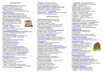 Ośrodki wypoczynkowe - Dom Wypoczynkowy „Drzewicz S.C.” Drzewicz 2, Swornegacie, tel. 052 398 11 01, 604 430 321 Magdalena Szymkiewicz, www.drzewicz.pl - „Kaszub”, ul. Długa 73, 89-606 Charzykowy, tel. 052 3988015, 602 657 963, Edyta Magolewska –Płotka, www.kaszub-charzykowy.pl - „Kasia”, ul. Jeziorna 45/2, 89-606 Charzykowy, tel. 502 637 430, 52 398 81 98 Katarzyna Tyborczyk - „Babilon” Ośrodek Kolonijno-Wczasowy, Babilon 2, 89-606 Charzykowy, tel. 052 398 8042, 660 090 755, Bogdan, Grażyna Rapatt, www.babilon.maxmedia.pl - Ośrodek Wypoczynkowy w Drzewiczu, Drzewicz 4,89-608 Swornegacie, tel. 052 398 12 20, 603 743 943, Urszula, Henryk Soszko, www.soszko.pl - „Psia Góra”, ul. Podgórna 12, 89-608 Swornegacie, 52 398 11 60 tel. 052 398 11 60, 604 274 614, Zofia i Jerzy Zych s.c., www.zych-swornegacie.pl - Ośrodek Wypoczynkowy Ministerstwa Sprawiedliwości, Małe Swornegacie 2, tel. 052 398 12 36, 606 914 914, Teresa Keller, www.kssip.gov.pl - O.W.„Jupiter”, ul. Wczasowa 1, 89-606 Charzykowy, tel. 512 021 658, 790 207 987, Zdzisław Banaś www.owjupiter.com - „Elita”, ul. Jeziorna 50, 89-606 Charzykowy, tel. 052 398 84 09, Jerzy Piątek - Stanica Wodna PTTK Charzykowy, ul. Wzgórze 1, 89-606 Charzykowy, tel. 052 398 8105, 692 151 537 Lucyna Małgorzewicz, www.stanicacharzykowy.pl - Harcerski Ośrodek Wodny w Funce, Funka, 89-606 Charzykowy, tel. 052 398 8009, 398 80 01, Lech Lewicki - „Rejs”, ul. Długa 89, 89-606 Charzykowy, Rosana Iwicka, tel. 052 398 82 58, 502 610 802, www.rejs.charzykowy.pl - „Las Drzewicz”, Drzewicz 3, 89-608 Swornegacie, tel. 052 3981469, 606 684 033, Mirosław Laskowski, www.drzewicz3.maxmedia.pl - „Małe Swory”, Małe Swornegacie, ul. Chojnicka 20, tel. 052 398 12 09, www.maleswory.info , Stein & Kornowska Sp.z o.o. - Holiday”, ul .Długa 38, 89-606 Charzykowy, tel. 052 39 88 130, Ewa Duraj - „Vega”, ul. Turystyczna 53, 89-606 Charzykowy, tel. 052 397 11 09, 395 00 00, 603 609 970, Przedsiębiorstwo Turystyczne „Pomorze”, www.vega.wczasy.pl - „Mikomania”, Funka,89-606 Charzykowy, tel. 52 398 80 07, 604 637 368, 600 322 380, Edyta Kulty, www.mikomania.pl , www.miko-tur.pl - Ośrodek Wypoczynku po Pracy Zakładu Energetycznego ul. Długa 89-606 Charzykowy, tel. 052 397 45 81 - „Czar PRL-u”, ul. Willowa 18, 89-608 Swornegacie, 52 398 11 35, 664 491 533, [email protected] - Ośrodek Wczasowy „ Kameralny”, ul. Wczasowa 2, Charzykowy tel. 600 643 322, www.kameralny.wczasy.pl Kwatery agroturystyczne - Gospodarstwo Agroturystyczne u Ani i Rysia Wączos 2, 89-608 Swornegacie, A.R. Gostomczyk Tel. 791 875 027, 52 33 55 056 - Dom Gościnny „Markowy”, ul. Polna 2 89-606 Charzykowy, tel. 052 398 80 48, 052 39 88 467 604 647 671, Bożena Stępień, www.charzykowy.net.pl - Dom Gościnny „Bessertówka”, ul. Turystyczna 17, 89-600 Chojnice, tel. 505 447 279, Aleksander Machel, www.bessertowka.pl - Czartołomie „Dwór” , Brygida Rekowska Czartołomie 7, 89-608 Charzykowy, Tel. 52 39 673 39, Kom. 607 338 827, www.czartolomiedwor.pl - Dom Gościnny „Pod Różą”, ul. Długa 45 89-606 Charzykowy, tel. 669 212 495,Krzysztof Bartnik - Dom Gościnny „Kachlinówka”, Zbeniny 36, 89-600 Chojnice, tel. 052 398 56 71, 604 291 742, Małgorzata Kachlicka, www.kachlinowka.pl - „U Dziadka”, ul. Długa 75, 89-606 Charzykowy, tel. 508 317 959, Bogumiła Senger - „Ranczo pod Lasem”, ul. Droga pod Lasem 2, Krojanty, tel. 052 398 56 20, Mirosława Dolna, www.podlasem.krojanty.com - Gospodarstwo agroturystyczne, Mariola Pażontka Lipińska, ul. Podmiejska 2, Lipienie, tel. 052 397 08 85 - Gospodarstwo agroturystyczne, ul. Gdańska 10, 89-620 Nowa Cerkiew, tel. 664 943 854, Ewa Jóźwiak - „U Karola”, Sepiot 11, 89-608 Swornegacie, tel. 052 398 1173, Karol Szulc - Kwatera agroturystyczna, ul. Dworcowa 14 89-620 Silno, tel. 052 398 76 94, 602 753 729, Zbigniew, Barbara Szczepańscy - Pokoje Kajaki- Nad Stawem”, ul. Szkolna 8, 89-608 Swornegacie, tel. 606 805 078 Dariusz Dorszyński, www.sworne.pl - Kwatera wiejska, ul. Leśna 2, 89-608 Swornegacie, Zofia, Edward Stosik - Gospodarstwo agroturystyczne, Kokoszka 5, 89-608 Swornegacie, tel. 052 398 11 61, 508 432 951, Hanna Gostomczyk - - „Nad Łąckim”, Plęsno, 89-608 Swornegacie tel. 052397 11 24, 600 661 889, Dariusz Januszewski - „CHËCZ”, ul.Międzymostowa 2 89-608 Swornegacie, tel. 052 398 12 49 693 709 654, Zofia, Grzegorz Wiśniewscy - Kwatera wiejska, ul.Okrężna, 89-608 Swornegacie, tel. 052 398 12 06, Czesław Cistowski - „Akacja”, ul. Mestwina 2, 89-608 Swornegacie, tel. 052 398 12 61, 600 670 419 Firma „Naparty” s.c. Danuta,Bogdan Naparty - „Pod Sosną”, ul .Sosnowa 3, 89-608 Swornegacie, tel. 052 398 11 83, 606 477 687 Zbigniew Chrapkowski - Kwatera wiejska, ul. Wąska 9, 89-608 Swornegacie, tel. 052 398 14 25, Mirosława, Piotr Kak, www.swory.com.pl - Gospodarstwo agroturystyczne, ul. Retmańska 6, 89-608 Swornegacie, tel. 600 672 721, Agnieszka Isbaner - „Cztery Świerki”, ul. Jeziorna 6, 89-608 Swornegacie, tel. 052 398 14 34, Bożena Chwiałkowska www.czteryswierki.pl - Gospodarstwo agroturystyczne, Plęsno 1 89-608 Swornegacie, tel. 052 398 11 41, Ryszard Ryngwelski - Nad Jeziorem, Owink 1 A, 89-608 Swornegacie, tel. 052 398 14 66, 605 466 960, Andrzej Kiedrowski www.kiedrowski.agroturystyka.pl - Kwatera, ul. Leśna 10, 89-608 Swornegacie, tel. 052398 12 65, 698 981 328Stanisław ,Urszula Szulc www.swornegaciewczasy.pl - „Pod Lasem”, ul. Szkolna 21, 89-608 Swornegacie, tel. 052 398 11 15,Maria Trapp - „Pokoje Gościnne Luśka”, ul. Szeroka 2, 89-608, Swornegacie, Lucyna Wróblewska tel. 052 398 12 64, 660 804 469 www.pokoje-luska.pl - Gospodarstwo agroturystyczne, Plęsno 4, 89-608 Swornegacie, tel. 052 398 11 40, Jerzy, Urszula Borzyszkowscy www.nawczasy.pl/agrokemping - "Chata kaszubska" Roman Copa, Zbrzyca 36, 89-608 Swornegacie, tel. 664 451 391, http://www.noclegi.swornegacie.pl/chatakaszubska - 