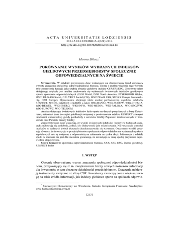 ACTA UNIVERSITATIS LODZIENSIS FOLIA OECONOMICA 4(324) 2016 http://dx.doi.org/10.18778/0208-6018.324.14 Hanna Sikacz* PORÓWNANIE WYNIKÓW WYBRANYCH INDEKSÓW GIEŁDOWYCH PRZEDSIĘBIORSTW SPOŁECZNIE ODPOWIEDZIALNYCH NA ŚWIECIE Streszczenie. W artykule przytoczono dane wskazujące na obserwowany trend dotyczący wzrostu znaczenia społecznej odpowiedzialności biznesu. Istotne z punktu widzenia tego wzrostu było zestawienie funkcji, jakie pełnią obecnie giełdowe indeksy CSR/SRI/ESG. Głównym celem niniejszego artykułu jest analiza zachowania się wybranych światowych indeksów giełdowych spółek społecznie odpowiedzialnych (DJSI World, DJSI North America, FTSE4GOOD Global, MSCI KLD 400 Social, CALVERT Social (CSI), MSCI World ESG, STOXX Europe Sustainability, DJSI Europe). Opracowanie obejmuje także analizę porównawczą wyników indeksów RESPECT, WIG20, mWIG40 i sWIG80, a także WIG-BANKI, WIG-BUDOW, WIG-CHEMIA, WIG-DEWEL, WIG-ENERG, WIG-INFO, WIG-MEDIA, WIG-PALIWA, WIG-SPOZYW, WIG-SUROWC, WIG-TELKOM. Analiza dotycząca światowych indeksów była oparta na danych pozyskanych z bazy Datastream, natomiast dane do części publikacji związanej z porównaniem indeksu RESPECT z innymi indeksami warszawskiej giełdy pochodziły z serwisów Giełdy Papierów Wartościowych w Warszawie oraz Parkietu Gazety Giełdy. Zaprezentowane dane wskazują, że wyniki światowych indeksów (trendy) w badanych okresach zachowują się podobnie, jednak ich efektywność jest zróżnicowana. Nie wszystkie wartości indeksów w badanych dwóch okresach charakteryzowały się wzrostem. Otrzymane wyniki pokazują również, że inwestycje w przedsiębiorstwa społecznie odpowiedzialne na wybranych rynkach kapitałowych nie są związane z odpornością na załamania na rynku akcji. Informacja o udziale spółki w indeksie nie jest dla inwestora gwarancją, że inwestycja w daną spółkę przyniesie odpowiednią stopę zwrotu. Słowa kluczowe: społeczna odpowiedzialność biznesu, CSR, SRI, ESG, indeks giełdowy, RESPECT Index 1. WSTĘP Obecnie obserwujemy wzrost znaczenia społecznej odpowiedzialności biznesu, przejawiający się m.in. zwiększeniem liczny nowych nośników informacji dla inwestorów o tym obszarze działalności przedsiębiorstw. Znaczenia nabierają instrumenty związane ze sferą CSR. Inwestorzy zwracają coraz większą uwagę na takie źródła informacji, jak indeksy giełdowe oparte na spółkach odpowie* Uniwersytet Ekonomiczny we Wrocławiu, Katedra Zarządzania Finansami Przedsiębiorstwa, [email protected] [213] Hanna Sikacz 214 dzialnych społecznie. W artykule przytoczono niektóre badania wskazujące na zauważalny trend. Istotne z punktu widzenia wzrostu znaczenia omawianej tematyki było zestawienie funkcji, jakie pełnią obecnie indeksy CSR/SRI/ESG. Głównym celem niniejszego artykułu jest analiza zachowania się wybranych światowych indeksów giełdowych spółek społecznie odpowiedzialnych. Powinna ona wskazać, jak inwestycje w indeksy spółek społecznie odpowiedzialnych zmieniały się w czasie i czy ich wyniki różniły się od siebie. Analiza dotycząca światowych indeksów była oparta na danych pozyskanych z bazy Datastream, natomiast dane do części publikacji związanej z porównaniem indeksu RESPECT z innymi indeksami warszawskiej giełdy pochodziły z serwisów Giełdy Papierów Wartościowych w Warszawie oraz Parkietu Gazety Giełdy. 2. ZNACZENIE I FUNKCJE INDEKSÓW CSR/SRI/ESG W ramach poruszonej problematyki dotyczącej indeksów giełdowych spółek odpowiedzialnych społecznie używane są skróty CSR, SRI oraz ESG. Najpopularniejsze pojęcie to Corporate Social Responsibility, czyli społeczna odpowiedzialność biznesu. Dla inwestorów na rynku finansowym odpowiednikiem koncepcji CSR w zakresie inwestowania kapitałów jest koncepcja SRI, Socially Responsible Investment, inwestowanie społecznie odpowiedzialne (Dziawgo 2010: 16). W ogólnym ujęciu SRI sprowadza się więc do selektywnego doboru akcji do portfela inwestycyjnego, przy czym wybór walorów polega na nabywaniu akcji spółek spełniających określone kryteria (Jedynak 2012: 162). Innym pojęciem zdobywającym coraz szersze zastosowanie jest ESG (Environmental, Social, Governance), które oznacza uwzględnianie czynników środowiskowych, społecznych i ładu korporacyjnego. Obecnie obserwuje się wzrost znaczenia zrównoważonych i odpowiedzialnych inwestycji. Można przypuszczać, że w związku z tym rośnie również zainteresowanie indeksami giełdowymi przedsiębiorstw społecznie odpowiedzialnych. Jak wynika z badań European SRI Study 2012 i 2014, przeprowadzanych w dwuletnich cyklach przez Europejskie Forum Zrównoważonego Inwestowania (Eurosif)1, wolumen odpowiedzialnych i zrównoważonych inwestycji na rynkach europejskich rośnie dynamicznie od kilku lat. Dzieje się tak pomimo kryzysu gospodarczego i trudnej sytuacji ekonomicznej w krajach Unii Europejskiej. Odpowiednie dane potwierdzające ten trend zawarte są w Tabeli 12. Euro1 Eurosif, z ang. European Social Investment Forum, to europejska jednostka Forum Zrównoważonego Inwestowania (ang. Sustainable Investment Forum – SIF), będąca stowarzyszeniem promującym perspektywiczne i odpowiedzialne inwestowanie. 2 Przedstawione w tabeli dane obejmują okres 2011–2013. W momencie opracowywania artykułu Eurosif nie opublikował jeszcze raportu European SRI Study 2016. Porównanie wyników wybranych indeksów giełdowych… 215 sif w swoim badaniu rozróżnia siedem strategii odpowiedzialnego inwestowania i według tych strategii prezentowane są dane dla Europy z uwzględnieniem danych dla Polski. Tabela 1. Rynek odpowiedzialnego inwestowania według strategii w Europie i Polsce Europa (14/13* krajów) Strategia Inwestycje związane ze zrównoważonym rozwojem Najlepszy w swojej klasie/ screening pozytywny Screening na podstawie norm wyłączenia z portfolio inwestycyjnego Zaangażowanie i rzecznictwo