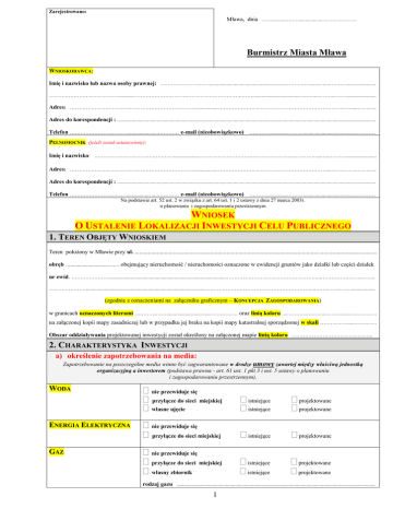 Zarejestrowano: Mława, dnia ……...........……....................………………. Burmistrz Miasta Mława WNIOSKODAWCA: Imię i nazwisko lub nazwa osoby prawnej: ………………………............................................................…….….…......…....………....................... …………………………………............……………………………………………………..……....................................….…......……....……....................... Adres: ………………………………………………………………...............…………………...………………………………………………....……….. Adres do korespondencji : .................................................................................................................................................................................................... Telefon ……………………………...............…....………… e-mail (nieobowiązkowo) …………..............………......................................………… PEŁNOMOCNIK (jeżeli został ustanowiony): Imię i nazwisko: ………………………………………...................………………………….…………………..……………...…..………....................... Adres: ………………………………………………………………...............…………………...…………………………………....…………………….. Adres do korespondencji : .................................................................................................................................................................................................... Telefon ……………………………...............…....………… e-mail (nieobowiązkowo) …………..............………......................................………… Na podstawie art. 52 ust. 2 w związku z art. 64 ust. 1 i 2 ustawy z dnia 27 marca 2003r. o planowaniu i zagospodarowaniu przestrzennym WNIOSEK O USTALENIE LOKALIZACJI INWESTYCJI CELU PUBLICZNEGO 1. TEREN OBJĘTY WNIOSKIEM Teren położony w Mławie przy ul. ............................................................................................................................. ...................................... obręb …............................……. obejmujący nieruchomość / nieruchomości oznaczone w ewidencji gruntów jako działki lub części działek nr ewid. …………………..........................................................................................……………………………………………...…………….……..…….. …………………..........................................................................................……………………………………………………....…….……..…….................. (zgodnie z oznaczeniami na załączniku graficznym – KONCEPCJA ZAGOSPODAROWANIA) w granicach oznaczonych literami ………………..................................…………… oraz linią koloru ……………….…...………........…………… na załączonej kopii mapy zasadniczej lub w przypadku jej braku na kopii mapy katastralnej sporządzonej w skali …………….......………… Obszar oddziaływania projektowanej inwestycji został określony na załączonej mapie linią koloru ……………………………………….. 2. CHARAKTERYSTYKA INWESTYCJI a) określenie zapotrzebowania na media: Zapotrzebowanie na poszczególne media winno być zagwarantowane w drodze umowy zawartej między właściwą jednostką organizacyjną a inwestorem (podstawa prawna - art. 61 ust. 1 pkt 3 i ust. 5 ustawy o planowaniu i zagospodarowaniu przestrzennym). WODA ENERGIA ELEKTRYCZNA GAZ nie przewiduje się przyłącze do sieci miejskiej własne ujęcie istniejące istniejące projektowane projektowane nie przewiduje się przyłącze do sieci miejskiej istniejące projektowane nie przewiduje się przyłącze do sieci miejskiej własny zbiornik istniejące istniejące projektowane projektowane rodzaj gazu ...................................................................................................................................................... 1 ŚCIEKI nie przewiduje się przyłącze do sieci miejskiej własny zbiornik rodzaj : szambo istniejące projektowane istniejące projektowane przydomowa oczyszczalnia inny (jaki?) ................................................................................................................................................................................ WODY OPADOWE powierzchniowo przyłącze do sieci miejskiej istniejące projektowane własny zbiornik istniejące projektowane rodzaj : doły chłonne zbiornik retencyjny inny (jaki?) ................................................................................................................................................................................ OGRZEWANIE nie przewiduje się przyłącze do sieci miejskiej własne źródło istniejące istniejące projektowane projektowane źródło i rodzaj paliwa ……….......................................................................................................…………… ................................................................................................................................................................................ (np. własna kotłownia na paliwo gazowe wbudowana w projektowanym budynku , itd.) ODPADY STAŁE pojemniki do czasowego gromadzenia odpadów stałych zlokalizowane: na terenie objętym wnioskiem w bryle projektowanego budynku inny sposób unieszkodliwienia odpadów (jaki?) .................................................................................. ...................................................................................................................