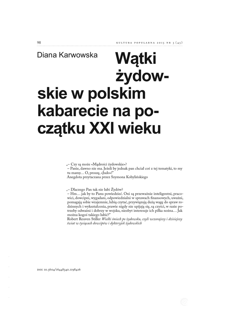 98 kultura popularna 2015 nr 3 (45) :ąWNL Ī\GRZVNLHZSROVNLP NDEDUHFLHQDSRF]ąWNX;;,ZLHNX 'LDQD.DUZRZVND „ – Czy są może «Mądrości żydowskie»? – Panie, dawno nie ma. Jeżeli by jednak pan chciał coś z tej tematyki, to my tu mamy… O, proszę, «Judo»!” Anegdota przytaczana przez Szymona Kobylińskiego - - „ – Dlaczego Pan tak nie lubi Żydów? – Hm… jak by to Panu powiedzieć. Oni są przeważnie inteligentni, pracowici, dowcipni, wygadani, odpowiedzialni w sprawach finansowych, uważni, pomagają sobie wzajemnie, lubią czytać, przywiązują dużą wagę do spraw rodzinnych i wykształcenia, prawie nigdy nie upijają się, są czyści, w razie potrzeby odważni i dobrzy w wojsku, niezbyt interesuje ich piłka nożna… Jak można kogoś takiego lubić?” Robert Reuven Stiller Wielki śmiech po żydowsku, czyli wczorajszy i dzisiejszy świat w tysiącach dowcipów i dykteryjek żydowskich - - - DOI: 10.5604/16448340.1198426 D i a n a K a rwow s ka W i z e r un e k r od z i ny i w z or c e w yc howawc z e … Zastanawiając się nad obecnością Żydów w polskiej popkulturze, nie sposób pominąć współczesnej sceny kabaretowej. Zamierzam skupić się wyłącznie na tym obszarze, ponieważ zagadnienie dwudziestolecia międzywojennego to temat zbyt rozległy na objętość tej publikacji – trzeba by poświęcić należytą uwagę zarówno polskiemu kabaretowi wykorzystującemu dowcip żydowski, jak i kabaretowi żydowskiemu. Z pewnością niezwykle ciekawe byłoby też prześledzenie twórczości kabaretów okresu PRL. Współcześni artyści konsekwentnie odchodzą od figury zabawnej postaci, z której można się pośmiać, wręcz modelowo uosabiającej Innego, na rzecz potępienia głupoty i antysemityzmu. Gdzieniegdzie pojawia się również tęsknota za przeszłością, za światem, który coraz trudniej odtworzyć z okruchów (zbiorowej) pamięci. Warto poświęcić kilka słów początkom nowoczesnego antysemityzmu. Figura Żyda jako obcego zagrażającego polskości powstała po 1864 roku (po upadku powstania styczniowego), a ostatecznie ukształtowała się między późnymi latami 80. XIX wieku a rokiem 1918. (Michlic, 2015: 43). Okazało się, że Żydzi to świetny materiał na kozła ofiarnego – niezależnie od tego, czym by się zajmowali i w jakim stopniu asymilowali (bądź nie), zawsze będą z nimi kłopoty. [ … ] Nie możecie zaprzeczyć nam prawa do życia, ma je każde zwierzę, a my bądź co bądź ludźmi jesteśmy. Wywieszać nas, wyciąć w pień – niepodobna. Trzeba więc coś radzić. Chcemy się wziąć do roli, powiadacie: Żydzi zajmują nam ziemię, do medycyny, adwokatury, notariatu, krzyczą: Żydzi wyparowują nas ze wszystkich stanowisk. Ograniczeni do handlu, jeden na tysiąc robimy w nim majątek, obrotnością, ryzykiem i oszczędnością, wołacie: Żydzi oszukują i wyzyskują. Chcąc się lepiej zrosnąć ze społeczeństwem, przyjmujemy wasz obyczaj i religię. Czy nas przygarniecie wtedy? Wyzywacie „Przechrzta!” odpadamy od swoich, a nie zyskujemy was. Nareszcie, kiedy w obywatelskim urzędzie chcemy służyć tej ziemi, która bądź co bądź wychowała nas i wykarmiła, kiedy chcemy nieść jej na usługi nasz majątek i pracę, wtedy odpowiadacie: nie chcemy was, idźcie przecz! Handlujcie i wyzyskujcie dalej, to jedyne wasze rzemiosło. (Zalewski, 1885: 171 – 172) - - - - - Szczególnie podejrzani byli ci, którzy się zasymilowali, silnie albo wręcz całkiem identyfikowali z tym, co polskie – brano ich za „zanieczyszczających” rodzimą kulturę (Michlic, 2015: 38). Właściwie w każdym trudnym czy przełomowym momencie, na przykład w czasie odradzania się państwa polskiego albo podczas światowego kryzysu, zawsze znajdowali się ci sami winni. Na niekorzyść starszych braci w wierze przemawiało także to, że: [ … ] od końca XIX wieku Żydzi byli kojarzeni z etosem nowoczesności, zachodnim liberalizmem, sekularyzmem, kapitalizmem, socjalizmem oraz komunizmem. Znaczna część środowisk szlacheckich, tradycyjnie konserwatywnych i katolickich, uważała te prądy i związane z nimi wartości za niepolskie lub nawet antypolskie. (Michlic, 2015: 38) 99 'LDQD.DUZRZVND– stuGHQWNDRVWDWQLHJRURNX VWXGLyZGRNWRUDQFNLFK QDNXOWXUR]QDZVWZLH8QLZHUV\WHWX6:36SUDFXMH Z&HQWUXPH/HDUQLQJX 86:36=DLQWHUHVRZDQLDEDGDZF]HSROVNL G\VNXUVPQLHMV]RĞFL VHNVXDOQ\FKSROVND VFHQDNDEDUHWRZD NXOWXURZHLVSRáHF]QH NRQWHNVW\ĞPLHUFL 100 kultura popularna 2015 nr 3 (45) Stąd już tylko krok do postawienia znaku równości między Żydem a symbolem antypolskości – zadziwiające, że nawet współcześnie można spotkać się z taką narracją, a następująca sytuacja nie ma miejsca tylko dlatego, że w Polsce pozostało raptem kilka tysięcy Żydów, a więc garstka (urastająca w oczach antysemitów do kilkuset tysięcy lub nawet kilku milionów). - - - - - W kwestii żydowskiej opinia publiczna kręci się w zaczarowanym kole i wyjść z niego nie może. Żyda zacofanego, w brudnym chałacie, wyzyskującego chłopów i trującego ich wódką – nazywamy łapserdakiem i mamy do niego wstręt; Żyda, który zerwał z masą, zrzucił brudny chałat, zamiast Talmudu i Zoharu przyjął wykształcenie europejskie i chce pracować produkcyjnie, nazywamy intruzem, arogantem i mamy do niego wstręt; nareszcie Żyda, który przestał być Żydem, zerwał wszystkie węzły łączące go z tym plemieniem, przyjął chrześcijanizm i wszedł w społeczeństwo nasze, nazywamy „mechesem” i także mamy do niego wstręt! ( Junosza-Szaniawski, 1889: 124) Sytuacja po 1989 roku jest z pewnością zróżnicowana. W pierwszej połowie lat dziewięćdziesiątych obwiniano Żydów za rozmaite klęski, zwłaszcza minionego ustroju, i zakłócanie transformacji. Podczas wyborów prezydenckich Tadeuszowi Mazowieckiemu zarzucono żydowskie pochodzenie, a zatem zdyskwalifikowano go jako ewentualną głowę państwa (Michlic, 2015: 