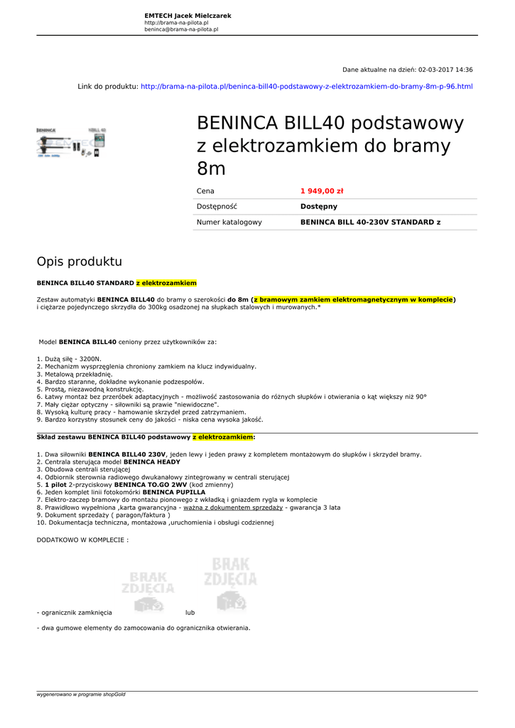 EMTECH Jacek Mielczarek http://brama-na-pilota.pl [email protected] Dane aktualne na dzień: 02-03-2017 14:36 Link do produktu: http://brama-na-pilota.pl/beninca-bill40-podstawowy-z-elektrozamkiem-do-bramy-8m-p-96.html BENINCA BILL40 podstawowy z elektrozamkiem do bramy 8m Cena 1 949,00 zł Dostępność Dostępny Numer katalogowy BENINCA BILL 40-230V STANDARD z Opis produktu BENINCA BILL40 STANDARD z elektrozamkiem Zestaw automatyki BENINCA BILL40 do bramy o szerokości do 8m (z bramowym zamkiem elektromagnetycznym w komplecie) i ciężarze pojedynczego skrzydła do 300kg osadzonej na słupkach stalowych i murowanych.* Model BENINCA BILL40 ceniony przez użytkowników za: 1. 2. 3. 4. 5. 6. 7. 8. 9. Dużą siłę - 3200N. Mechanizm wysprzęglenia chroniony zamkiem na klucz indywidualny. Metalową przekładnię. Bardzo staranne, dokładne wykonanie podzespołów. Prostą, niezawodną konstrukcję. Łatwy montaż bez przeróbek adaptacyjnych - możliwość zastosowania do różnych słupków i otwierania o kąt większy niż 90° Mały ciężar optyczny - siłowniki są prawie "niewidoczne". Wysoką kulturę pracy - hamowanie skrzydeł przed zatrzymaniem. Bardzo korzystny stosunek ceny do jakości - niska cena wysoka jakość. Skład zestawu BENINCA BILL40 podstawowy z elektrozamkiem: 1. Dwa siłowniki BENINCA BILL40 230V, jeden lewy i jeden prawy z kompletem montażowym do słupków i skrzydeł bramy. 2. Centrala sterująca model BENINCA HEADY 3. Obudowa centrali sterującej 4. Odbiornik sterownia radiowego dwukanałowy zintegrowany w centrali sterującej 5. 1 pilot 2-przyciskowy BENINCA TO.GO 2WV (kod zmienny) 6. Jeden komplet linii fotokomórki BENINCA PUPILLA 7. Elektro-zaczep bramowy do montażu pionowego z wkładką i gniazdem rygla w komplecie 8. Prawidłowo wypełniona ,karta gwarancyjna - ważna z dokumentem sprzedaży - gwarancja 3 lata 9. Dokument sprzedaży ( paragon/faktura ) 10. Dokumentacja techniczna, montażowa ,uruchomienia i obsługi codziennej DODATKOWO W KOMPLECIE : - ogranicznik zamknięcia lub - dwa gumowe elementy do zamocowania do ogranicznika otwierania. wygenerowano w programie shopGold EMTECH Jacek Mielczarek http://brama-na-pilota.pl [email protected] BENINCA BILL40 to napęd elektromechaniczny do bram skrzydłowych. Idealne rozwiązanie dla bram przydomowych Napęd BENINCA BILL40 jest jednym z najbardziej praktycznych i ekonomicznych rozwiązań przy automatyzowaniu bramy o długości skrzydła do 4 m. Napęd wyposażony jest w siłowniki tubowe – samoblokujące i dlatego do długości skrzydła 3m nie wymaga stosowania dodatkowych zamków. Bezpieczeństwo i wysoka niezawodność Zabezpieczenie przeciw zgnieceniem zapewnia moduł elektroniczny instalowany na płycie centrali sterującej, który bezpośrednio kontroluje siłę ciągu napędu. W przypadku awarii mechanizm odblokowujący umożliwia odblokowanie skrzydeł bramy i obsługę ręczną. Koszt obsługi napędu elektromechanicznego BENINCA BILL40 jest minimalny. Urządzenie pracuje niezawodnie w każdych warunkach atmosferycznych, w zakresie temperatur zewnętrznych od -20°C do +55°C Solidna konstrukcja, dokładność wykonania Na szczególną uwagę zasługuje bardzo solidne wykonanie elementów mocowania siłownika do słupka. Wyjątkowo dużo uwagi producent poświęca jakości wykonania siłowników. Użytkownik otrzymuje dzięki temu mocne urządzenie działające cicho i pewnie. Mechanizm wysprzęglania Wśród podobnych do modelu BENINCA BILL40 automatów do bram prezentowany napęd wyróżnia się mechanizmem wysprzęglania: użytkownik otrzymuje urządzenie zabezpieczone przed niepowołanym sforsowaniem bramy. Mechanizm wysprzęglenia zabezpieczony jest zamkiem z kluczem indywidualnym. Łatwy montaż i pewne działanie Ze względu na swoją tubową konstrukcję i sposób mocowania siłowników do bramy (od czoła) napęd BENINCA BILL40 jest szybki i łatwy w montażu, bez konieczności wykonywania kosztownych przeróbek adaptujących. Dobry punkt podparcia bramy gwarantuje pewne blokowanie po zamknięciu, nawet w przypadku szerokich bram. Dane techniczne 1. Siłownik BENINCA BILL40 Napęd BILL40 jest siłownikiem elektromechanicznym do bram skrzydłowych uchylnych, wprawiającym w ruch skrzydło bramy za pomocą układu ślimakowego (śruba obrotowa). Jest to napęd samoblokujący, który posiada mechaniczną blokadę gdy silnik nie pracuje. Po zautomatyzowaniu brama jest blokowana w każdej pozycji zatrzymania. wygenerowano w programie shopGold EMTECH Jacek Mielczarek http://brama-na-pilota.pl [email protected] 2. Centrala BENINCA HEADY, wyjątkowo ceniona centrala sterująca z uwagi na: - bardzo niską usterkowość - łatwy sposób programowania - funkcję hamowania skrzydeł bramy przed zakończeniem ruchu 3. Fotokomórka BENINCA PUPILLA. Podstawowe zastosowanie to praca w systemach bramowych, jako bariera bezpieczeństwa. wąska obudowa regulowane głowice w zakresie +/- 180o efektowna bryzgoszczelna obudowa zasięg działania - 15m wyjścia stykowe z podwójnym przekaźnikiem wysoka odporność na zakłócenia z obcych źródeł światła funkcja autosynchronizacji nadajnik - odbiornik przekaźnik na wyjściu 4. Piloty BENINCA TO.GO Piloty wykonane są z materiałów o bardzo dużej wytrzymałości mechanicznej. Osiągają zasięgi do 150m. wygenerowano w programie shopGold EMTECH Jacek Mielczarek http://brama-na-pilota.pl [email protected] 5. Elektro-zaczep Kompletny elektro-zaczep 12V do montażu w ograniczniku środkowym. Deblokada zamka od wewnątrz posesji za pomocą klucza indywidualnego. PARAMETRY - tabela WYMIARY MONTAŻOWE - rysunki i tabela wygenerowano w programie shopGold EMTECH Jacek Mielczarek http://brama-na-pilota.pl [email protected] wygenerowano w programie shopGold EMTECH Jacek Mielczarek http://brama-na-pilota.pl [email protected] Ważna informacja: - Jeżeli chcesz dokupić piloty, patrz "Piloty" - Każdy produkt posiada gwarancję, ważną z dokumentem zakupu - p