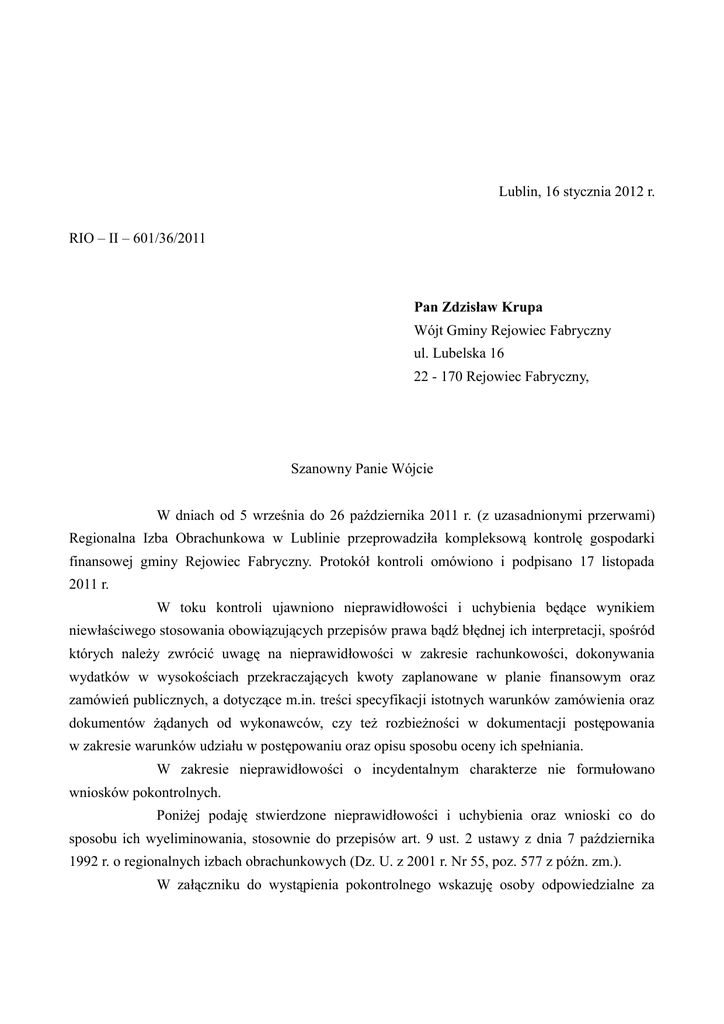Lublin, 16 stycznia 2012 r. RIO – II – 601/36/2011 Pan Zdzisław Krupa Wójt Gminy Rejowiec Fabryczny ul. Lubelska 16 22 - 170 Rejowiec Fabryczny, Szanowny Panie Wójcie W dniach od 5 września do 26 października 2011 r. (z uzasadnionymi przerwami) Regionalna Izba Obrachunkowa w Lublinie przeprowadziła kompleksową kontrolę gospodarki finansowej gminy Rejowiec Fabryczny. Protokół kontroli omówiono i podpisano 17 listopada 2011 r. W toku kontroli ujawniono nieprawidłowości i uchybienia będące wynikiem niewłaściwego stosowania obowiązujących przepisów prawa bądź błędnej ich interpretacji, spośród których należy zwrócić uwagę na nieprawidłowości w zakresie rachunkowości, dokonywania wydatków w wysokościach przekraczających kwoty zaplanowane w planie finansowym oraz zamówień publicznych, a dotyczące m.in. treści specyfikacji istotnych warunków zamówienia oraz dokumentów żądanych od wykonawców, czy też rozbieżności w dokumentacji postępowania w zakresie warunków udziału w postępowaniu oraz opisu sposobu oceny ich spełniania. W zakresie nieprawidłowości o incydentalnym charakterze nie formułowano wniosków pokontrolnych. Poniżej podaję stwierdzone nieprawidłowości i uchybienia oraz wnioski co do sposobu ich wyeliminowania, stosownie do przepisów art. 9 ust. 2 ustawy z dnia 7 października 1992 r. o regionalnych izbach obrachunkowych (Dz. U. z 2001 r. Nr 55, poz. 577 z późn. zm.). W załączniku do wystąpienia pokontrolnego wskazuję osoby odpowiedzialne za 2 stwierdzone nieprawidłowości. 1.1. W zakresie rachunkowości i sprawozdawczości budżetowej: 1.1.1.Nieprawidłowości w zakresie dokumentacji opisującej przyjęte zasady rachunkowości, polegające na: - nieokreśleniu aktualnej wersji oprogramowania, - nieokreśleniu zasad powiązania kont ksiąg pomocniczych z kontami księgi głównej, - nieokreślenie zasad klasyfikacji zdarzeń na kontach 072 „Umorzenie środków trwałych oraz wartości niematerialnych i prawnych” i 810 „Dotacje budżetowe, płatności z budżetu środków europejskich oraz środków z budżetu na inwestycje”, - nieujęciu w zakładowym planie kont Urzędu Gminy konta pozabilansowego 991 „Rozrachunki z inkasentami z tytułu pobieranych przez nich podatków podlegających przypisaniu na kontach podatników” i w konsekwencji nieprowadzenie ewidencji na tym koncie, - nieustaleniu terminów rozpoczęcia umorzenia i amortyzacji środków trwałych oraz wartości niematerialnych i prawnych, - bezpodstawnym dopuszczenie możliwości dokonywania corocznej aktualizacji wartości gruntów w oparciu o dane szacunkowe – str. 6 - 7 protokołu. Uzupełnić dokumentację opisującą przyjęte zasady (politykę) rachunkowości, przez: - wskazanie aktualnej wersji wykorzystywanego oprogramowania, - określenie w zakładowym planie kont budżetu gminy i Urzędu Gminy zasad powiązania kont ksiąg pomocniczych z kontami księgi głównej, - ustalenie zasady klasyfikacji zdarzeń na wszystkich kontach księgi głównej, z uwzględnieniem zasad ich funkcjonowania określonych w załączniku Nr 3 do rozporządzenia Ministra Finansów z dnia 5 lipca 2010 r. w sprawie szczególnych zasad rachunkowości oraz planów kont dla budżetu państwa, budżetów jednostek samorządu terytorialnego, jednostek budżetowych, samorządowych zakładów budżetowych, państwowych funduszy celowych oraz państwowych jednostek budżetowych mających siedzibę poza granicami Rzeczypospolitej Polskiej (Dz. U. Nr 128, poz. 861), zwanego w dalszej części tego wystąpienia „rozporządzeniem Ministra Finansów z dnia 5 lipca 2010 r.”, - ujęcie w zakładowym planie kont Urzędu Gminy konta pozabilansowego 991 „Rozrachunki z inkasentami z tytułu pobieranych przez nich podatków podlegających przypisaniu na kontach podatników”, stosownie do przepisów § 10 pkt 2 i § 12 ust. 1 pkt 1 lit. b rozporządzenia Ministra Finansów z dnia 25 października 2010 r. w sprawie zasad rachunkowości oraz planów kont dla organów podatkowych jednostek samorządu terytorialnego (Dz. U. Nr 208, poz. 1375), zwanego w dalszej części wystąpienia „rozporządzeniem Ministra Finansów z 25 października”, 3 - określenie terminu rozpoczęcia amortyzacji środków trwałych oraz wartości niematerialnych i prawnych, stosownie do przepisów art. 10 ust. 1 pkt 2, pkt 3 lit a i c, w związku z art. 32 ust. 1 i art. 33 ust. 1 ustawy z dnia 29 września 1994 r. o rachunkowości (Dz. U. z 2009 r., Nr 152, poz. 1223 z późn. zm.); - wykreślenie postanowień dopuszczających możliwość corocznej aktualizacji wartości gruntów w oparciu o dane szacunkowe, które nie znajdujący podstaw prawnych, bowiem środki trwałe, w tym grunty, ujmuje się w księgach rachunkowych według cen nabycia lub kosztów wytworzenia, stosownie do przepisów art. 7 ust. 1 w związku z przepisami art. 28 ust. 1 pkt 1 , ust. 2 i 3 ustawy o rachunkowości i zasad funkcjonowania konta 011 „Środki trwałe” określonych w załączniku Nr 3 do rozporządzenia Ministra Finansów z dnia 5 lipca 2010 r. Zgodnie z przepisami 6 ust. 5 powołanego rozporządzenia wartość początkowa środków trwałych i dotychczas dokonane odpisy umorzeniowe podlegają aktualizacji zgodnie z zasadami określonymi w odrębnych przepisach. Ponadto, w celu prawidłowego funkcjonowania kontroli zarządczej, rozważyć powierzenie obowiązku prowadzenia ewidencji druków ścisłego zarachowania w zakresie dowodów KP „Kasa przyjmie” – osobie innej niż kasjer, który jest jednocześnie upoważniony do ich stosowania w celu dokumentowania obrotów kasowych, mając na uwadze przepisy art. 68 ustawy z dnia 27 sierpnia 2009 r. o finansach publicznych (Dz. U. Nr 157, poz. 1240 z późn. zm.) oraz standard 14 „Szczegółowe mechanizmy kontroli dotyczące operacji finansowych i gospodarczych”, wskazany w załączniku „Standardy kontroli zarządczej dla sektora finansów publicznych