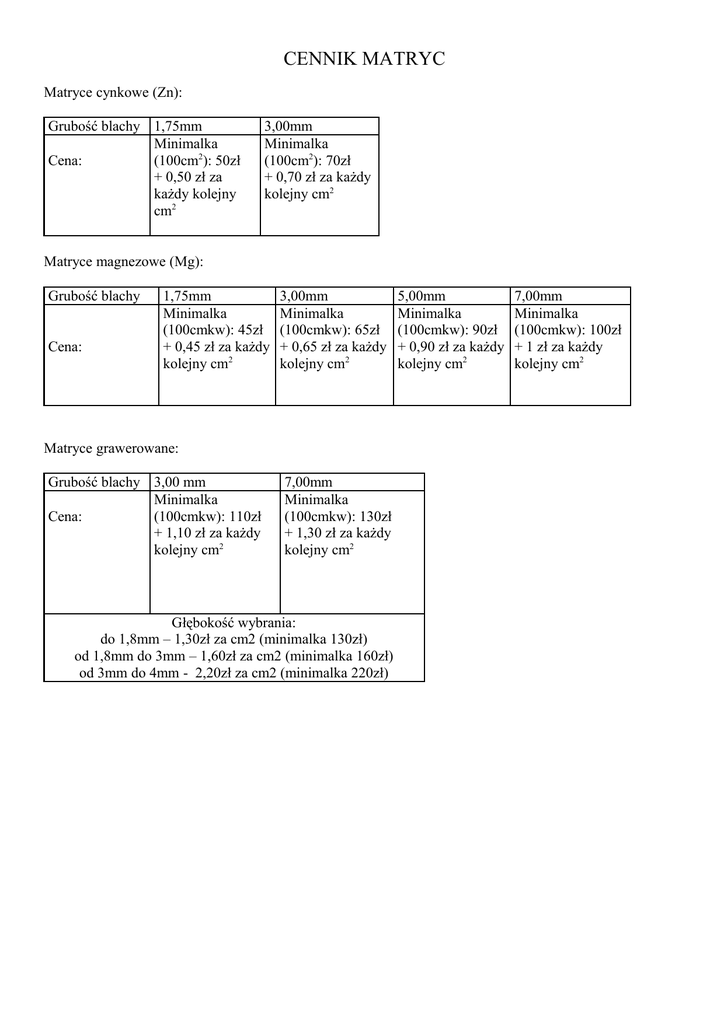 CENNIK MATRYC Matryce cynkowe (Zn): Grubość blachy 1,75mm Minimalka Cena: (100cm2): 50zł + 0,50 zł za każdy kolejny cm2 3,00mm Minimalka (100cm2): 70zł + 0,70 zł za każdy kolejny cm2 Matryce magnezowe (Mg): Grubość blachy Cena: 1,75mm Minimalka (100cmkw): 45zł + 0,45 zł za każdy kolejny cm2 3,00mm Minimalka (100cmkw): 65zł + 0,65 zł za każdy kolejny cm2 Matryce grawerowane: Grubość blachy 3,00 mm Minimalka Cena: (100cmkw): 110zł + 1,10 zł za każdy kolejny cm2 7,00mm Minimalka (100cmkw): 130zł + 1,30 zł za każdy kolejny cm2 Głębokość wybrania: do 1,8mm – 1,30zł za cm2 (minimalka 130zł) od 1,8mm do 3mm – 1,60zł za cm2 (minimalka 160zł) od 3mm do 4mm - 2,20zł za cm2 (minimalka 220zł) 5,00mm Minimalka (100cmkw): 90zł + 0,90 zł za każdy kolejny cm2 7,00mm Minimalka (100cmkw): 100zł + 1 zł za każdy kolejny cm2